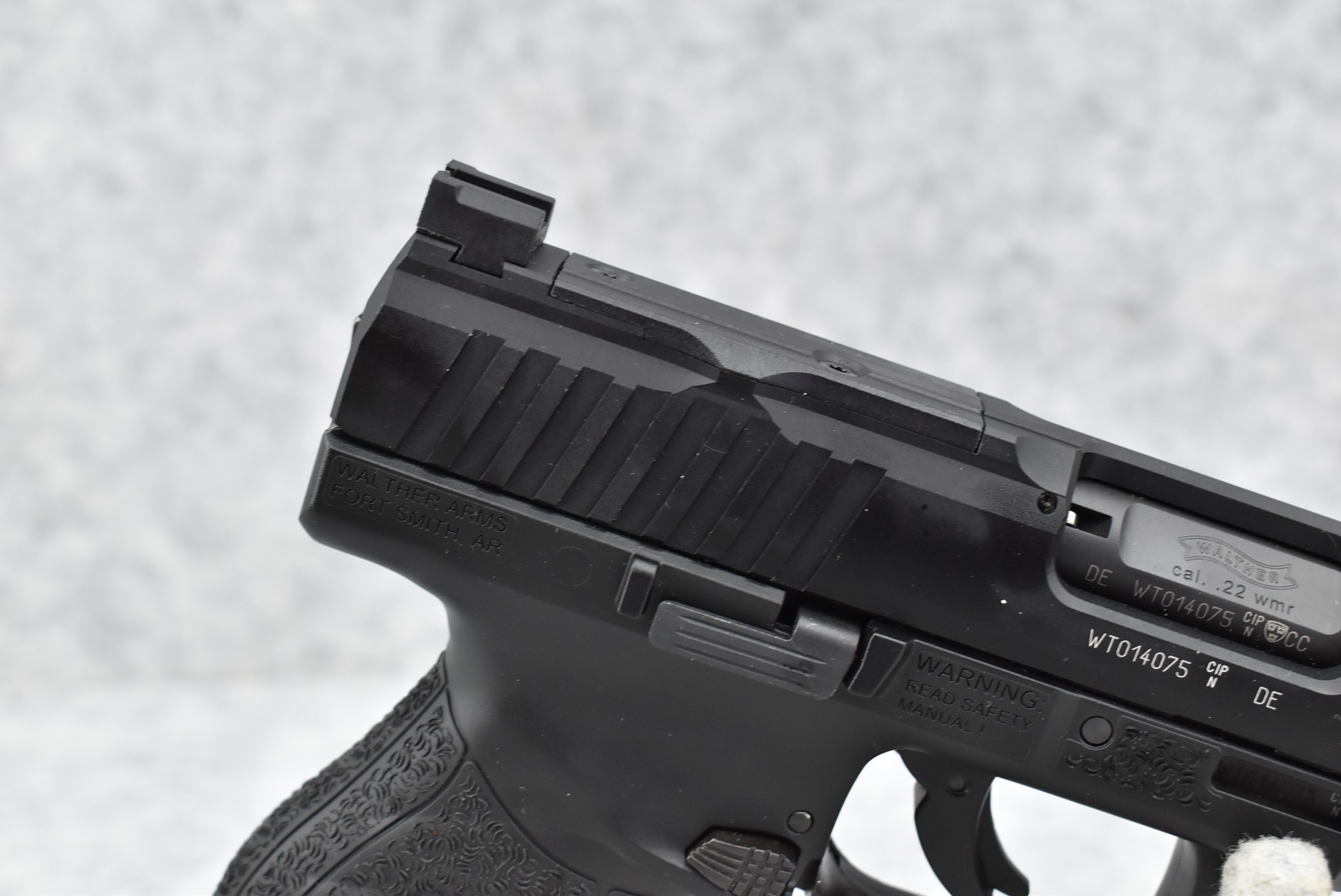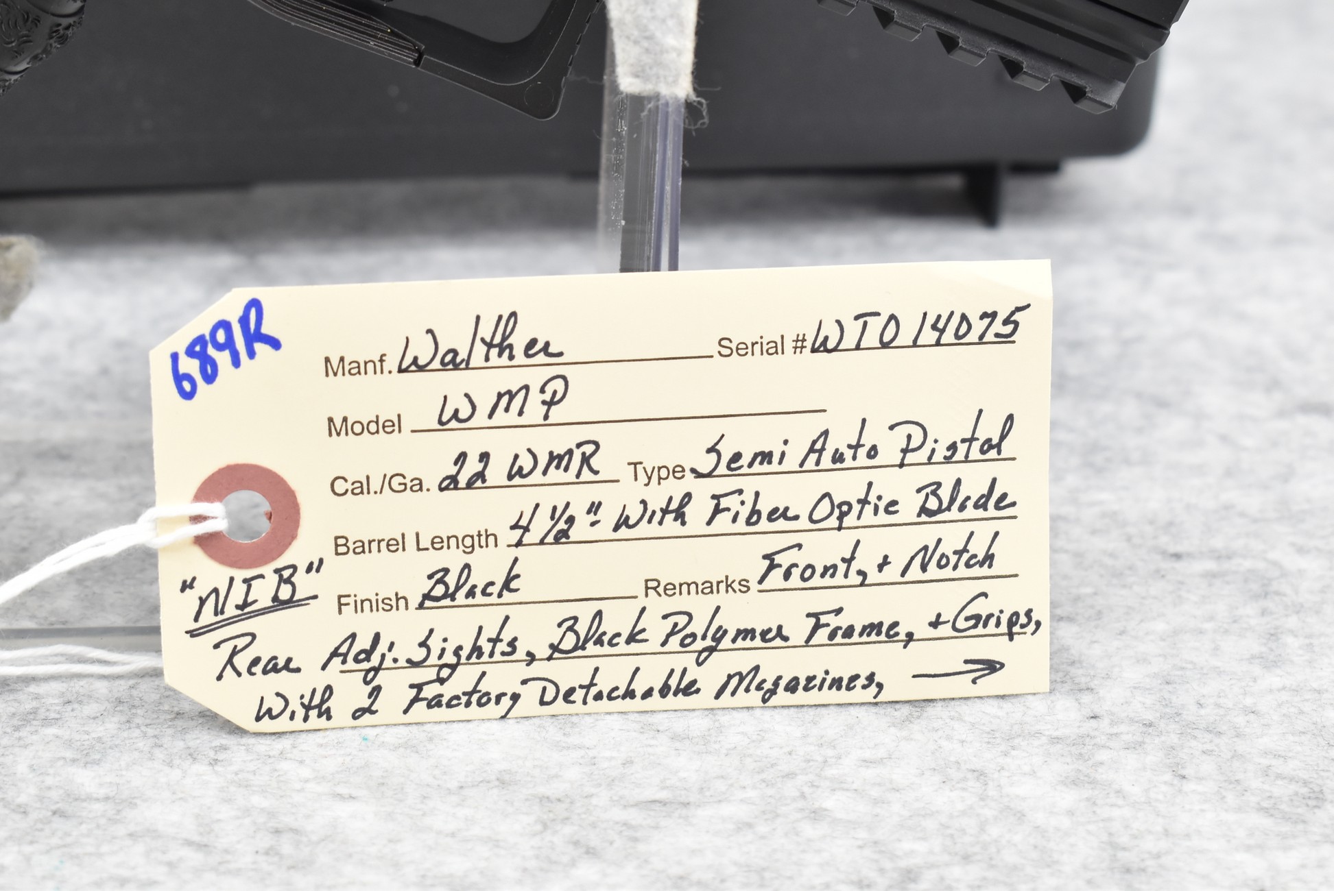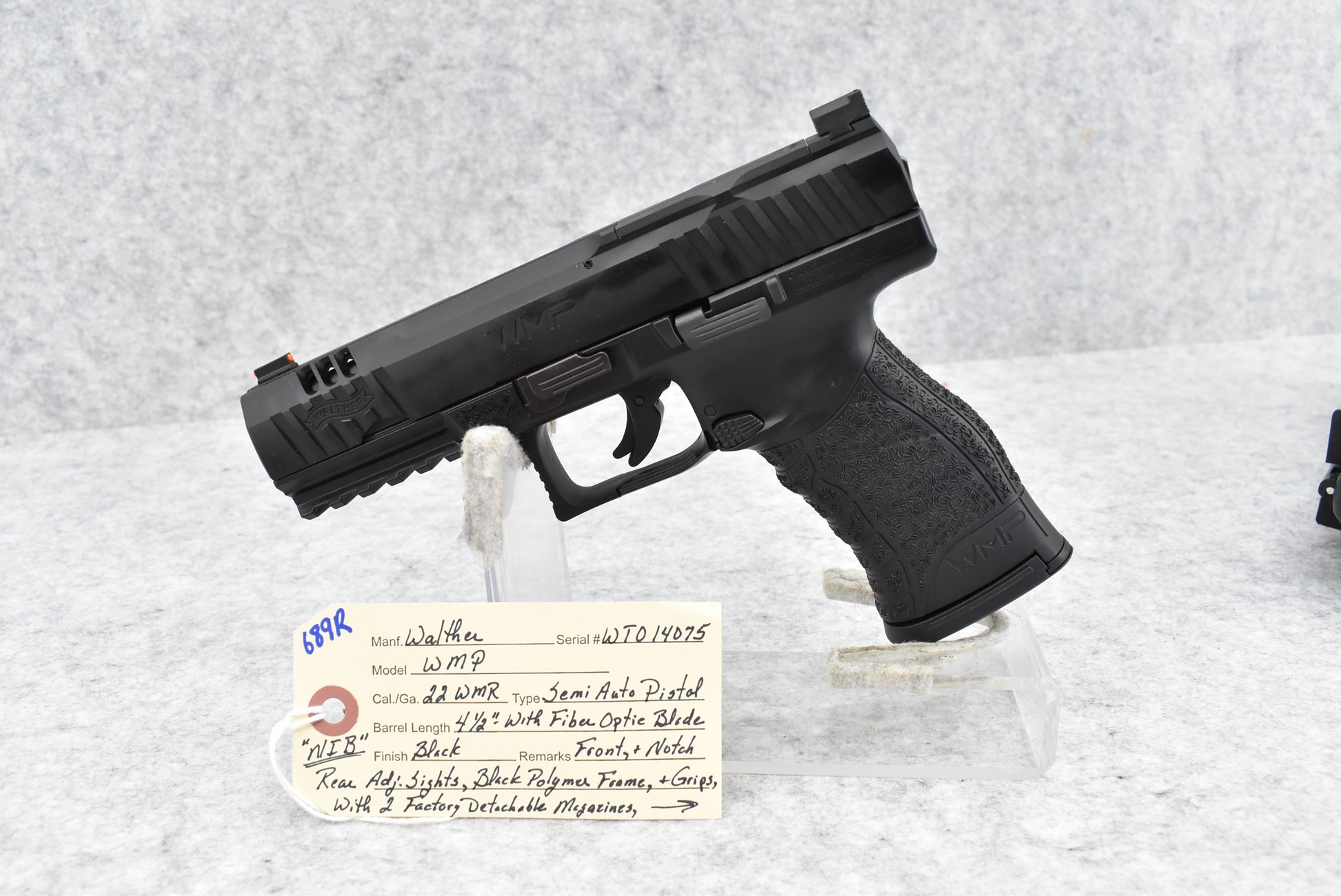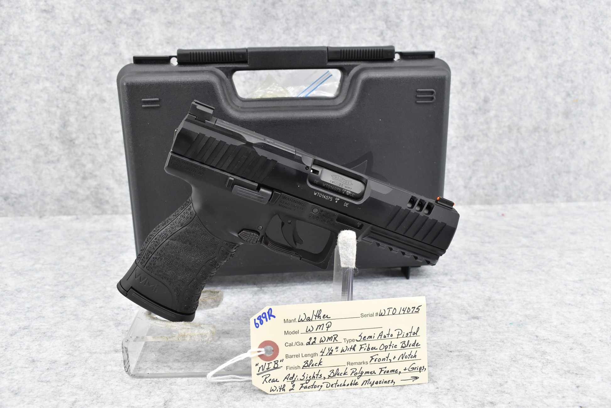 689R. Walther – Mod. WMP – 22 WMR Cal. Semi-Auto Pistol – w/4 ½” Barrel w/Fiber Optic Blade Front & Notch Rear Adj. Sights – Matte Black Finish – w/Black Polymer Frame & Grips – w/2 Factory Detachable Magazines – New w/Factory Hard Case, Manuals & Accessories