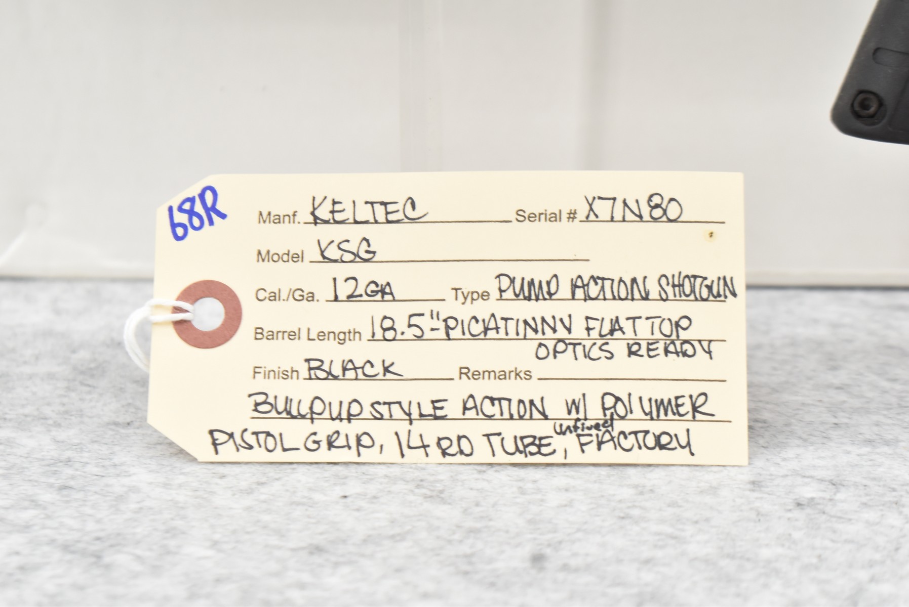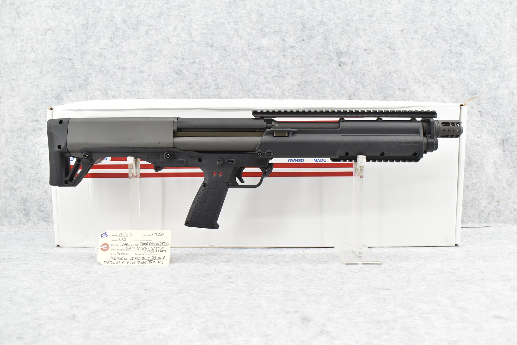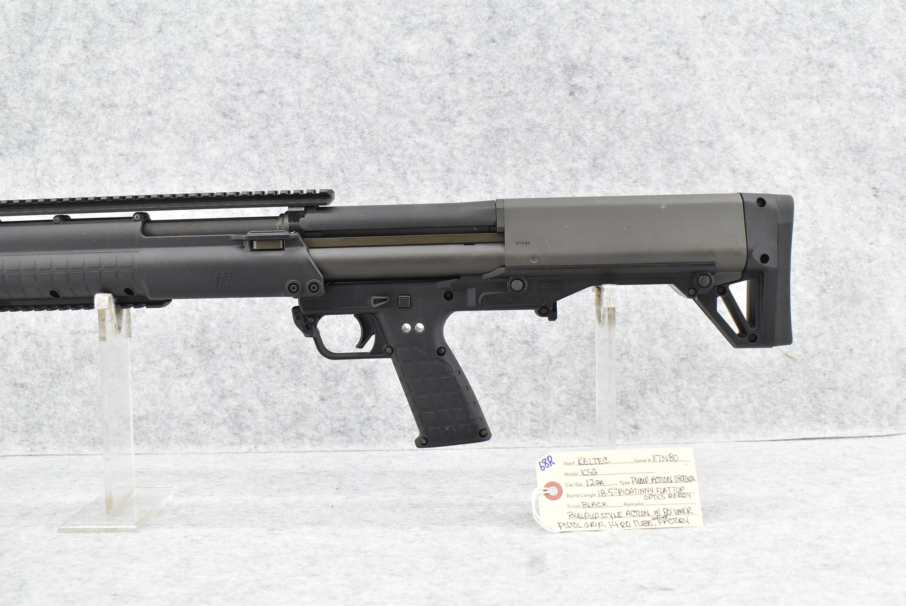 68R. Keltec – Mod. KSG – 12ga. Pump Action Shotgun – w/18 ½” Barrel – Black Finish – w/Polmer Pistol Grip – w/14Rd Tubular Magazine – Bullpup Style Action – Optics Ready w/Picatinny Flat Top Rail – Unfired w/Factory Box & Manual