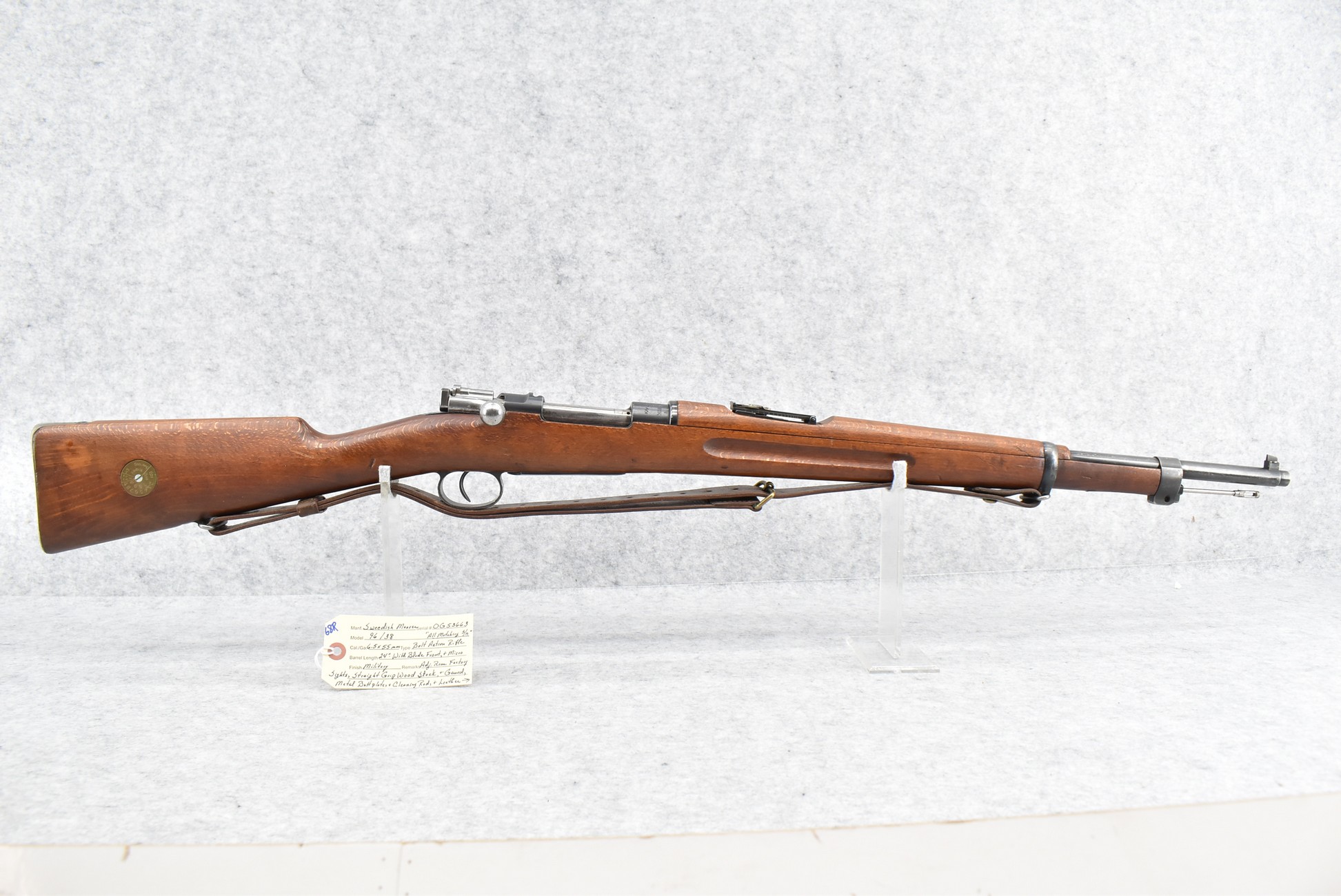 68R. Swedish Mauser – Mod. 96/38 – 6.5x55mm Cal. Bolt Action Rifle – w/24” Barrel w/Blade Front & Micro Adj. Rear Factory Sights – Military Finish – w/Straight Grip Wood Stocks w/Metal Butt Plate – w/Leather Sling – w/Cleaning Rod – All Matching Numbers – Import Marked