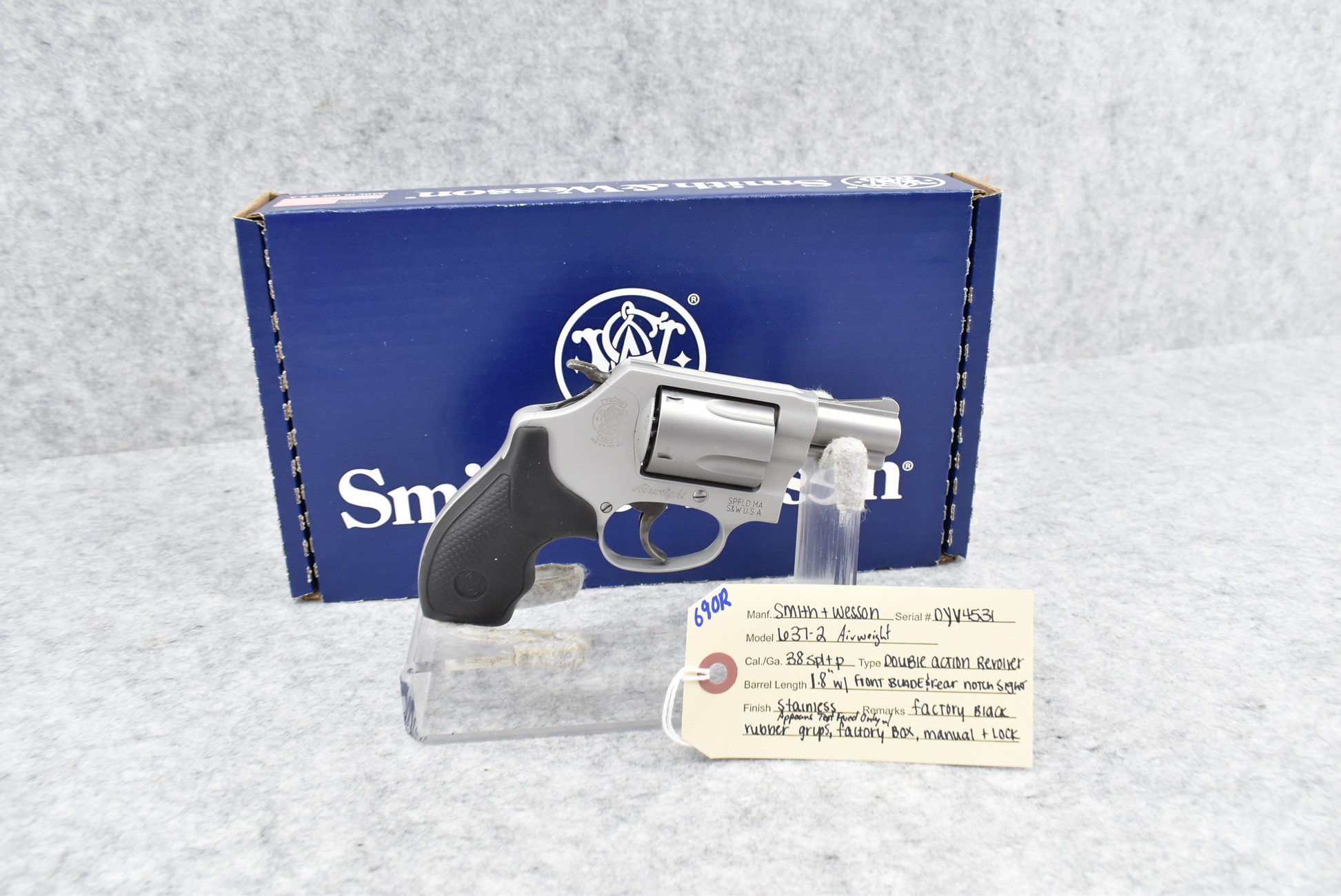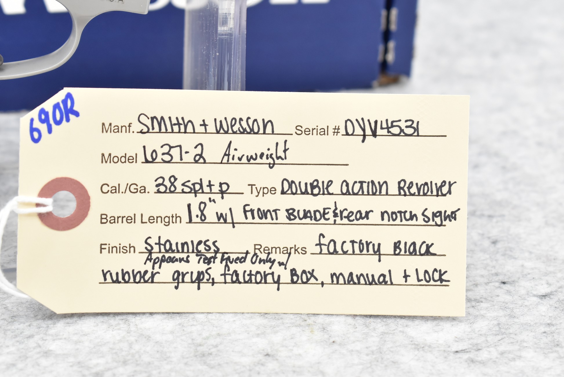 690R. Smith & Wesson – Md. 637-2 Airweight – 38 Spl. +P Cal. Double Action Revolver – w/1.8” Barrel w/Front Blade & Rear Notch Sights – Stainless Finish – w/Factory Black Rubber Grips – Appears Test Fired Only w/Factory Box & Manual