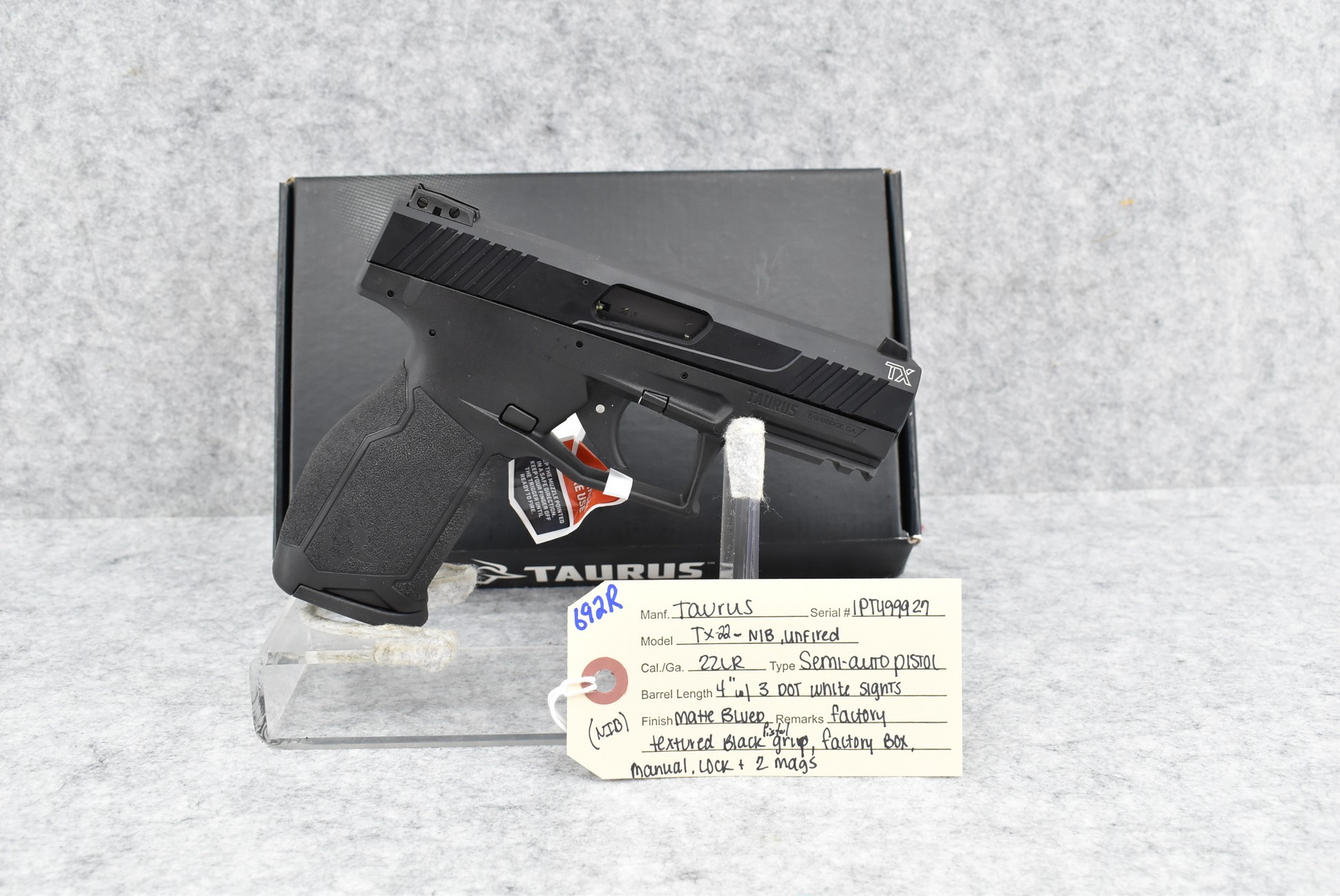 692R. Taurus – Mod. TX-22 – 22LR Cal. Semi-Auto Pistol – w/4” Barrel w/3-Dot White Sights – Matte Blued Finish – w/Factory Textured Black Pistol Grip – New w/Factory Box, Manual & 2 Mags