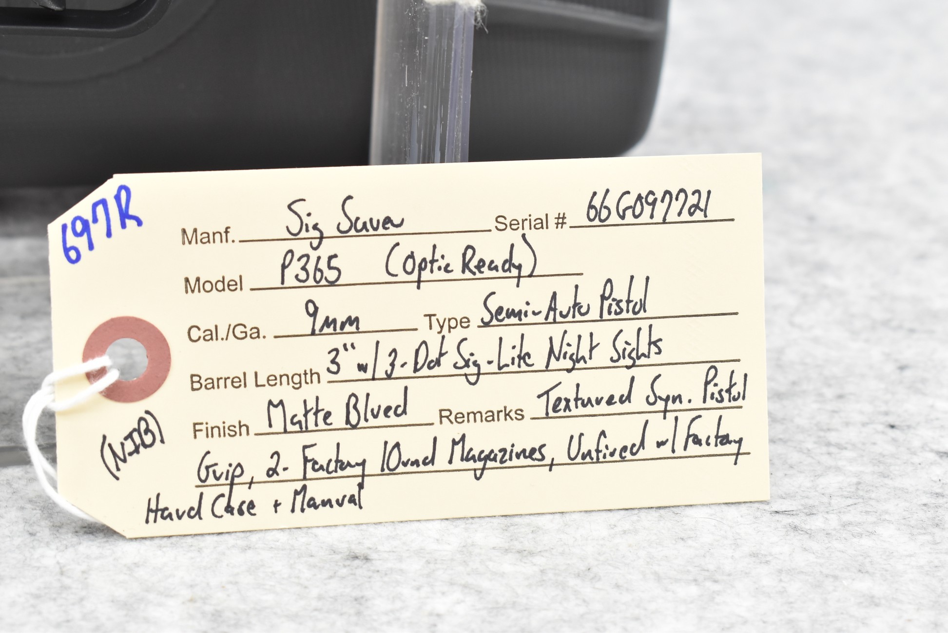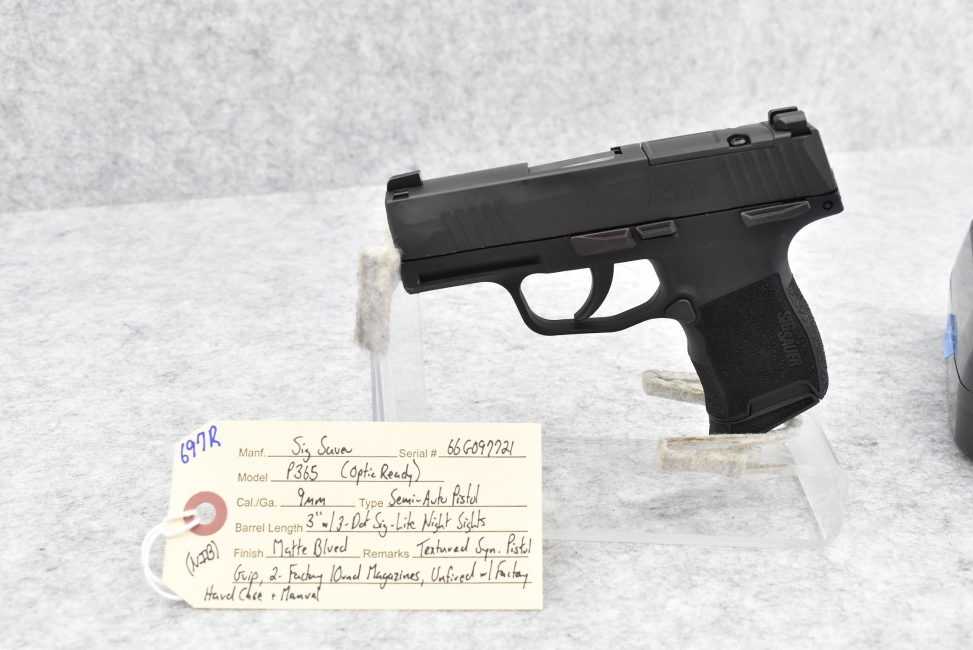 697R. Sig Sauer – Mod. P365 (Optic Ready) – 9mm Cal. Semi-Auto Pistol – w/3” Barrel w/3-Dot Sig-Lite Night Sights – Matte Blued Finish – w/Textured Synthetic Pistol Grip – w/2 Factory 10Rd Magazines – Unfired w/Factory Hard Case & Manual