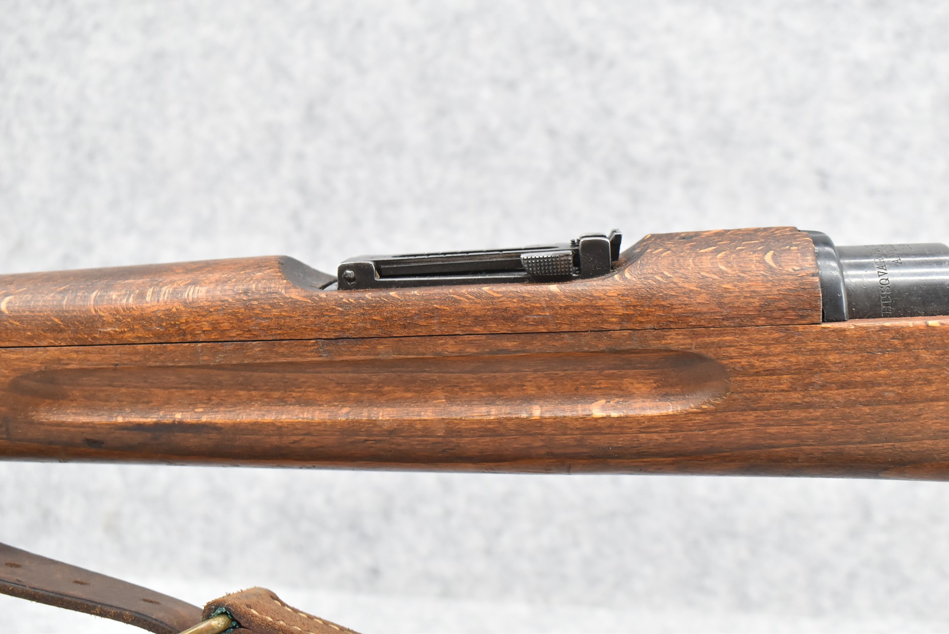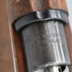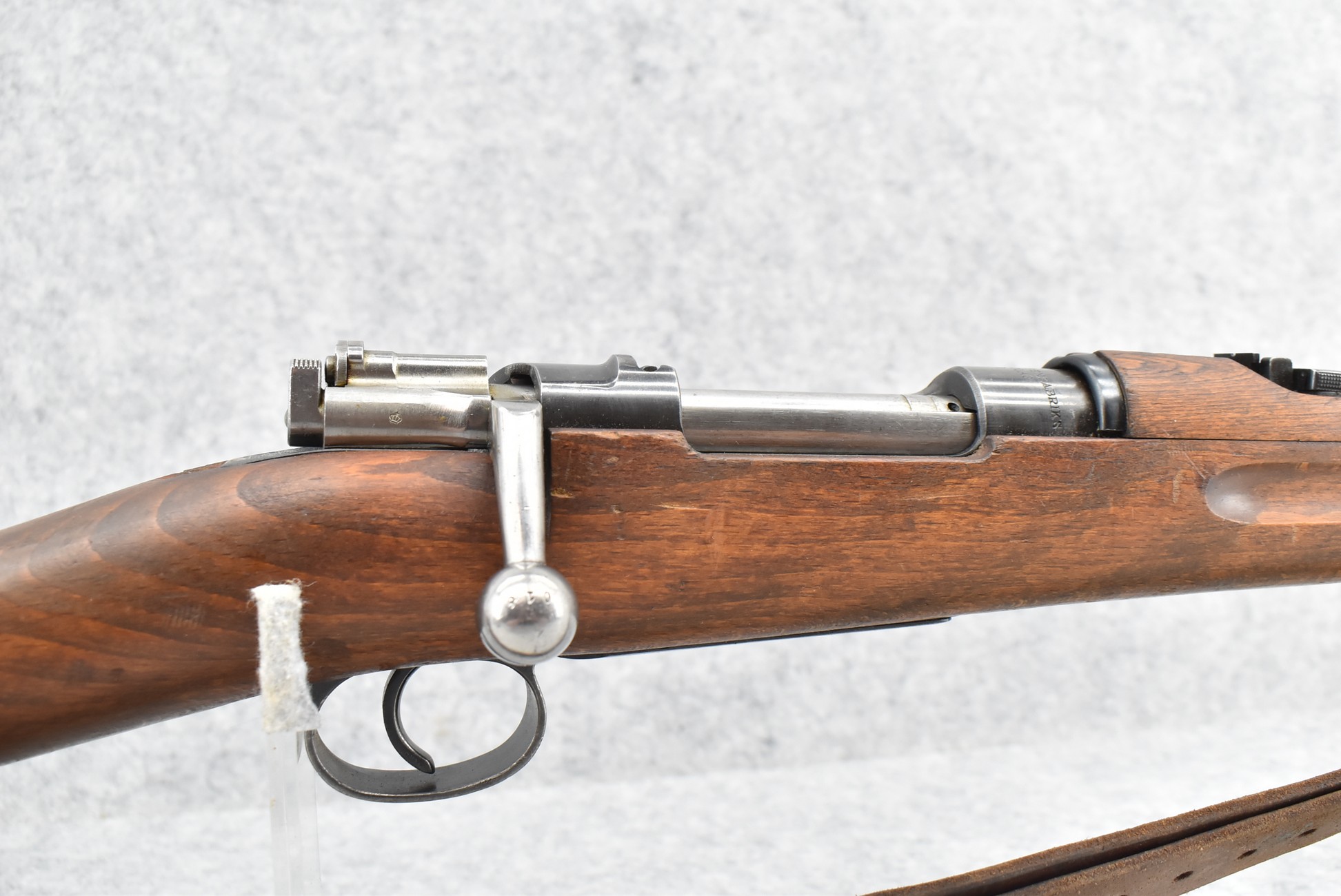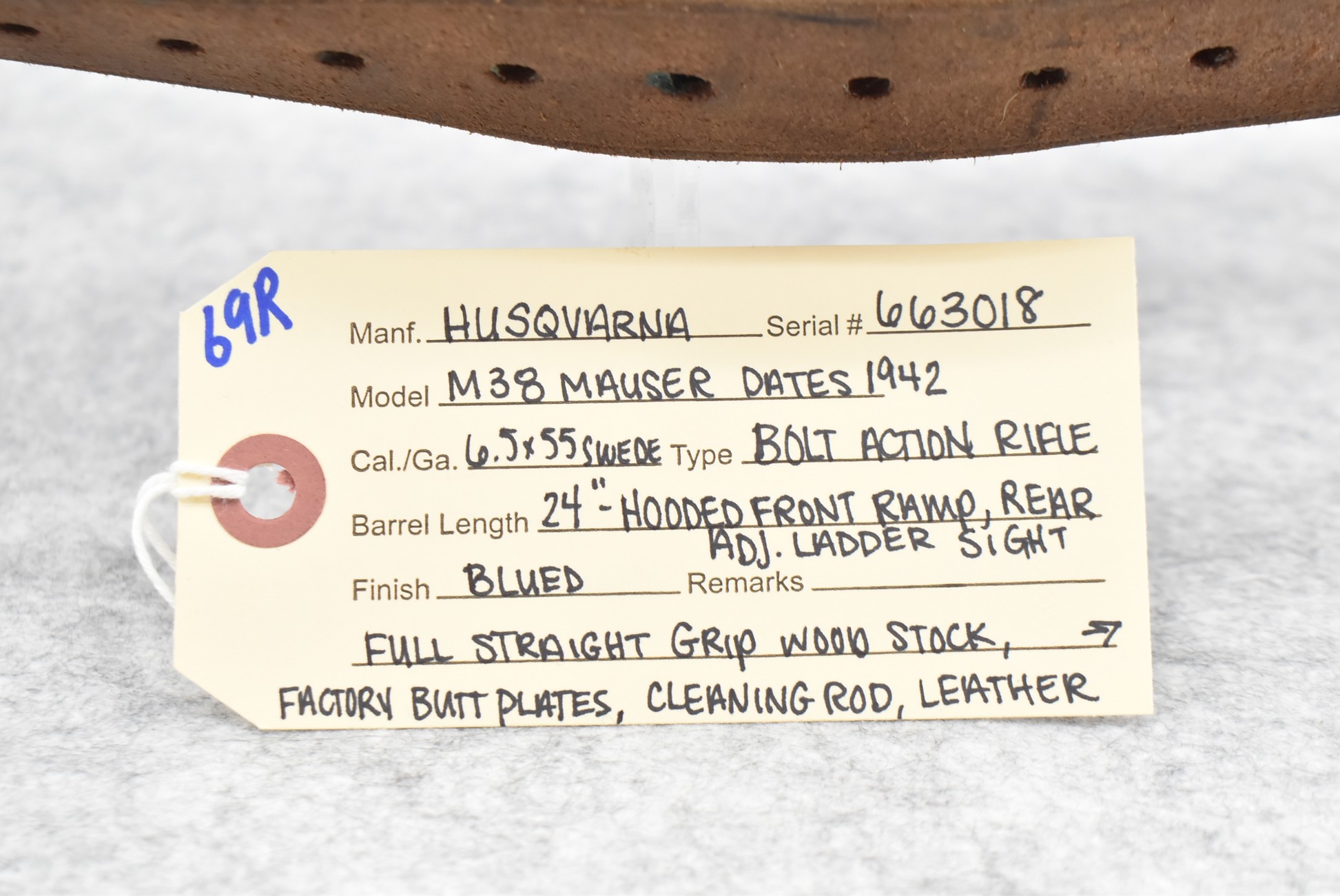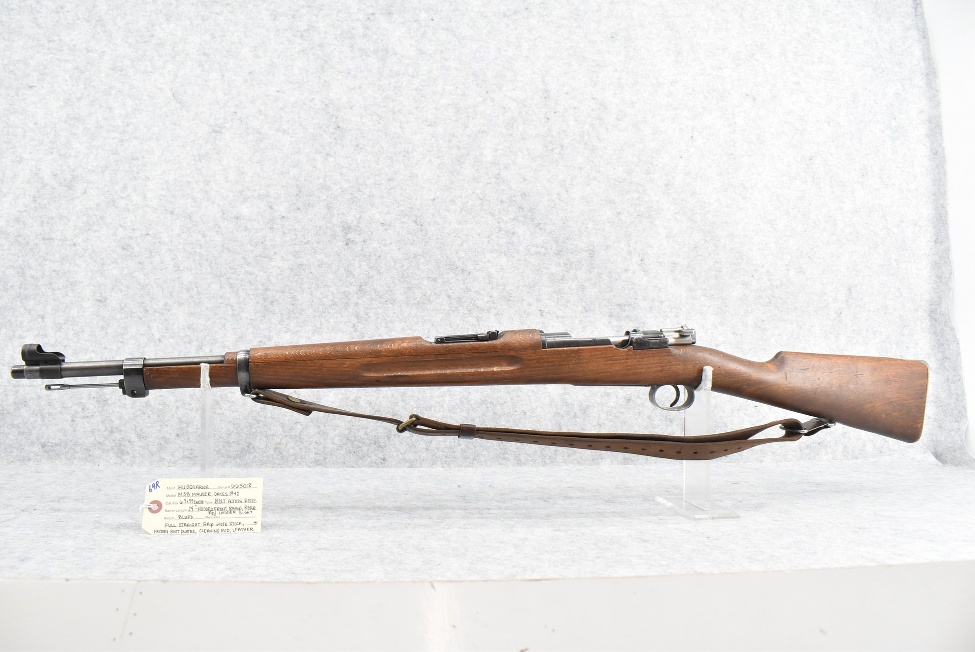 69R. Husqvarna – Mod. M38 – 6.5×55 Cal. Bolt Action Rifle – w/24” Barrel w/Hooded Ramp Front and Adjustable Rear Ladder Sights – Blued Finish – w/Full Straight Grip Wood Stock w/Factory Butt Plate – w/Cleaning Rod – w/Leather Military Sling – Bolt and Butt Plate Numbers Match to Gun – Import Marked – Dated 1942