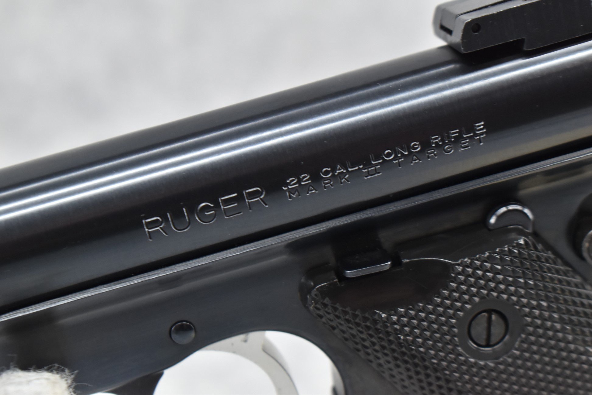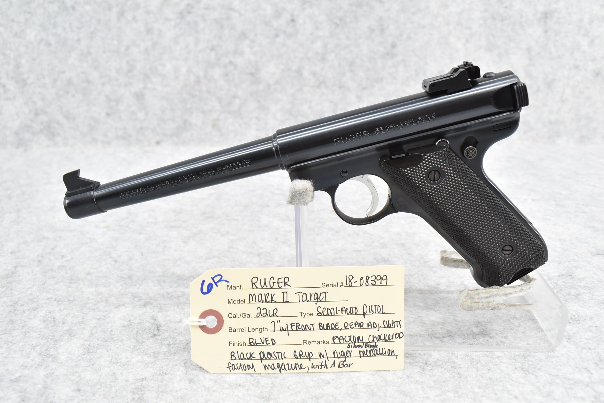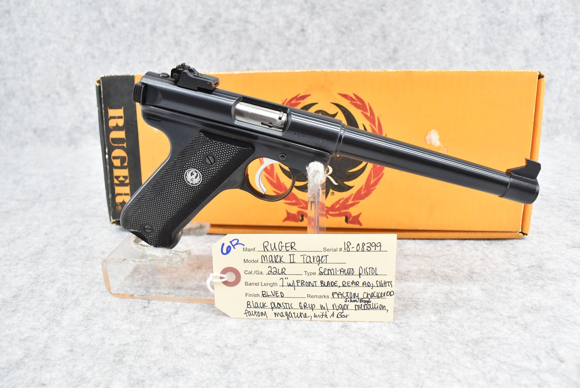 6R. Ruger – Mod. Mark II Target – 22LR Cal. Semi-Auto Pistol – w/7” Barrel w/Front Blade & Rear Adj. Sights – Blued Finish – w/Factory Checkered Grips w/Ruger Silver Eagle Medallion – w/Factory Magazine – w/A Box