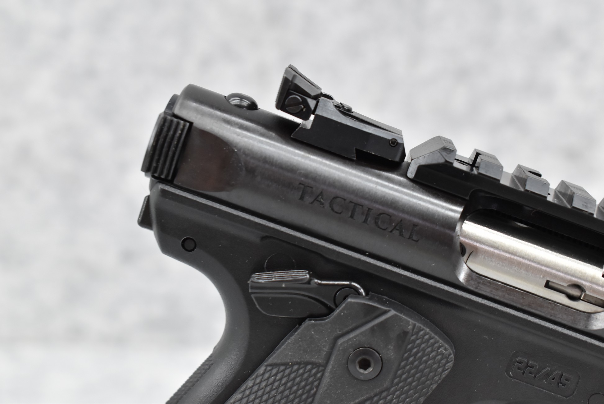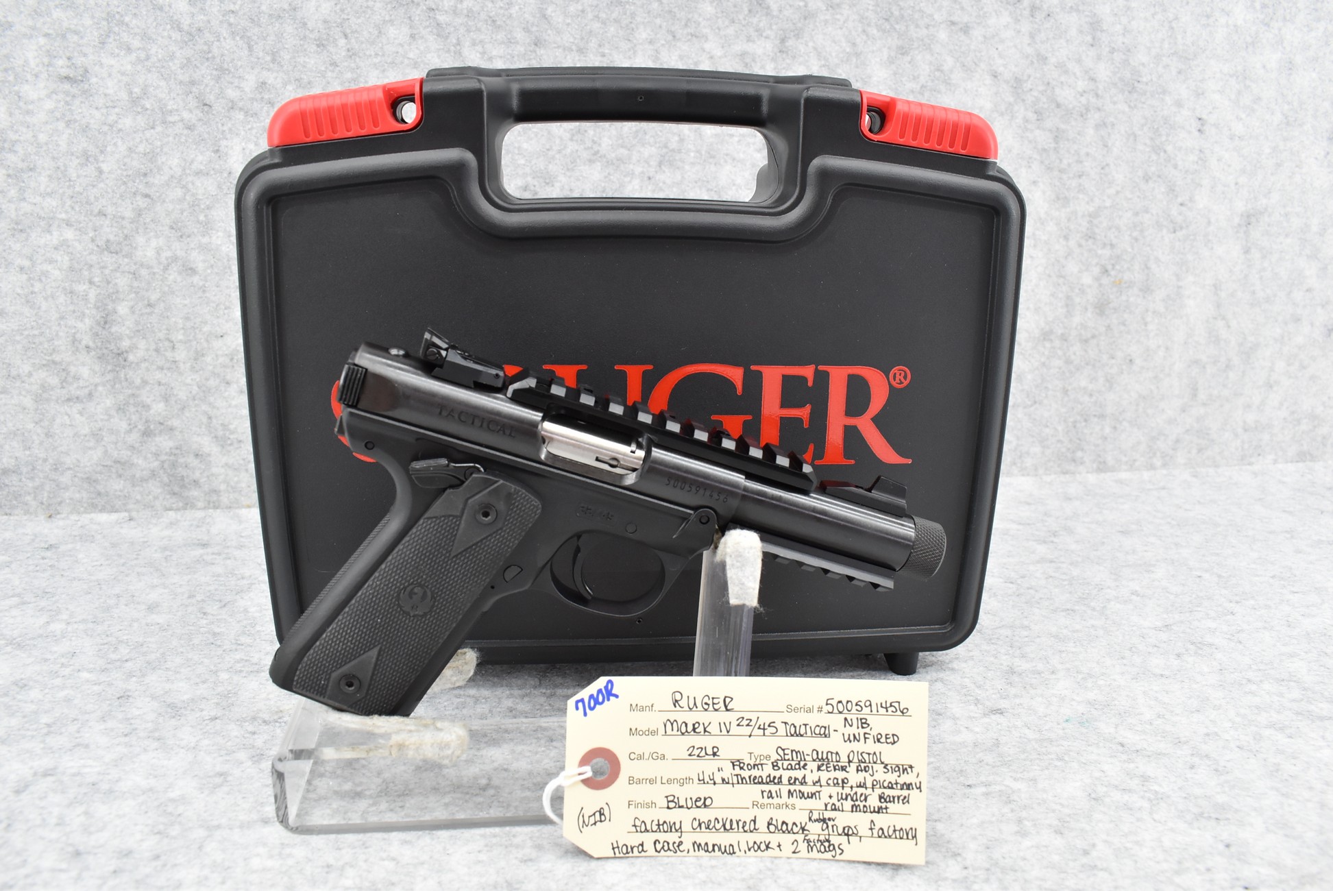 700R. Ruger – Mod. Mark IV 22/45 Tactical – 22LR Cal. Semi-Auto Pistol – w/4.4” Barrel w/Threaded Muzzle w/Cap, Front Blade & Rear Adj. Sights – Blued Finish – w/Factory Checkered Black Rubber Grips – w/Picatinny Rail Mount & Under Barrel Rail Mount – New w/Factory Hard Case, Manual & 2 Factory Mags