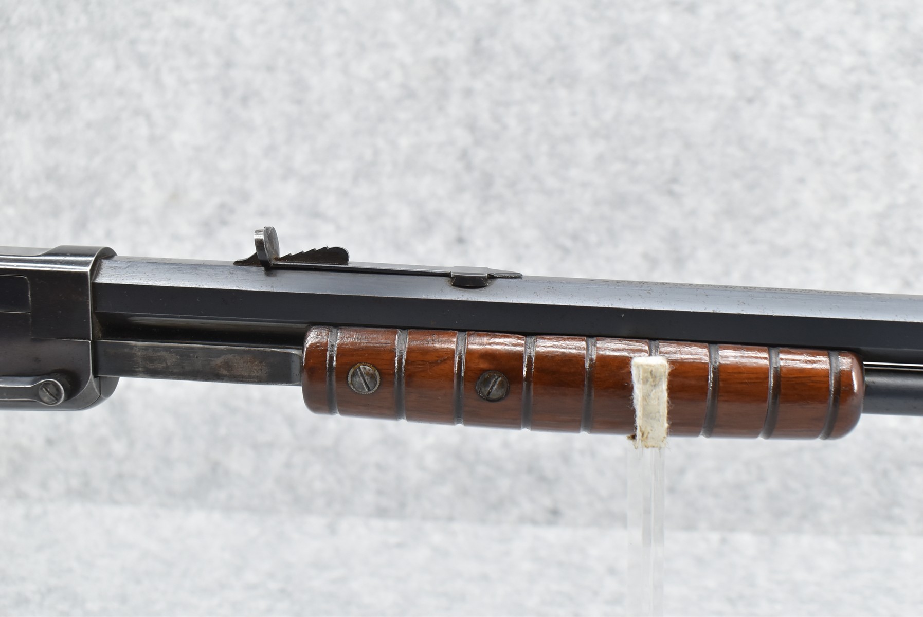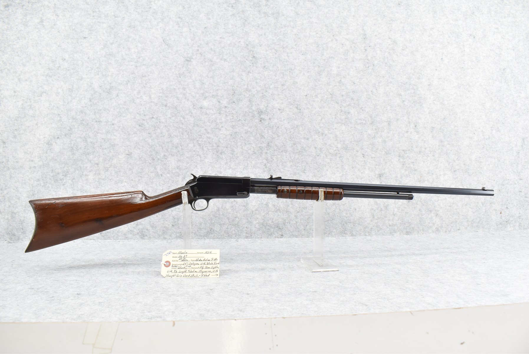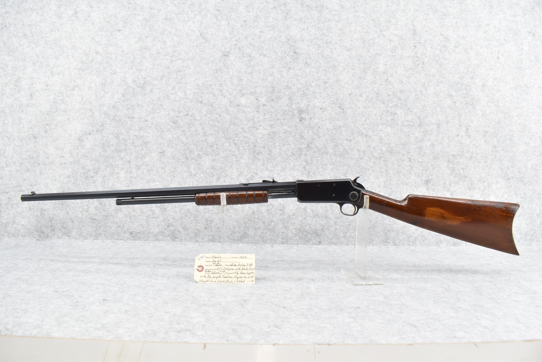 70R. Marlin – Mod. No. 27 – 25-20 Marlin Cal. Pump Action Rifle – w/24” Octagon Barrel w/Blade Front & Adj. Rear Sights w/2/3 Length Tubular Magazine – Excellent Strong Blued Finish – w/Straight Grip Wood Stock & Ribbed Forearm w/Factory Metal Butt Plate