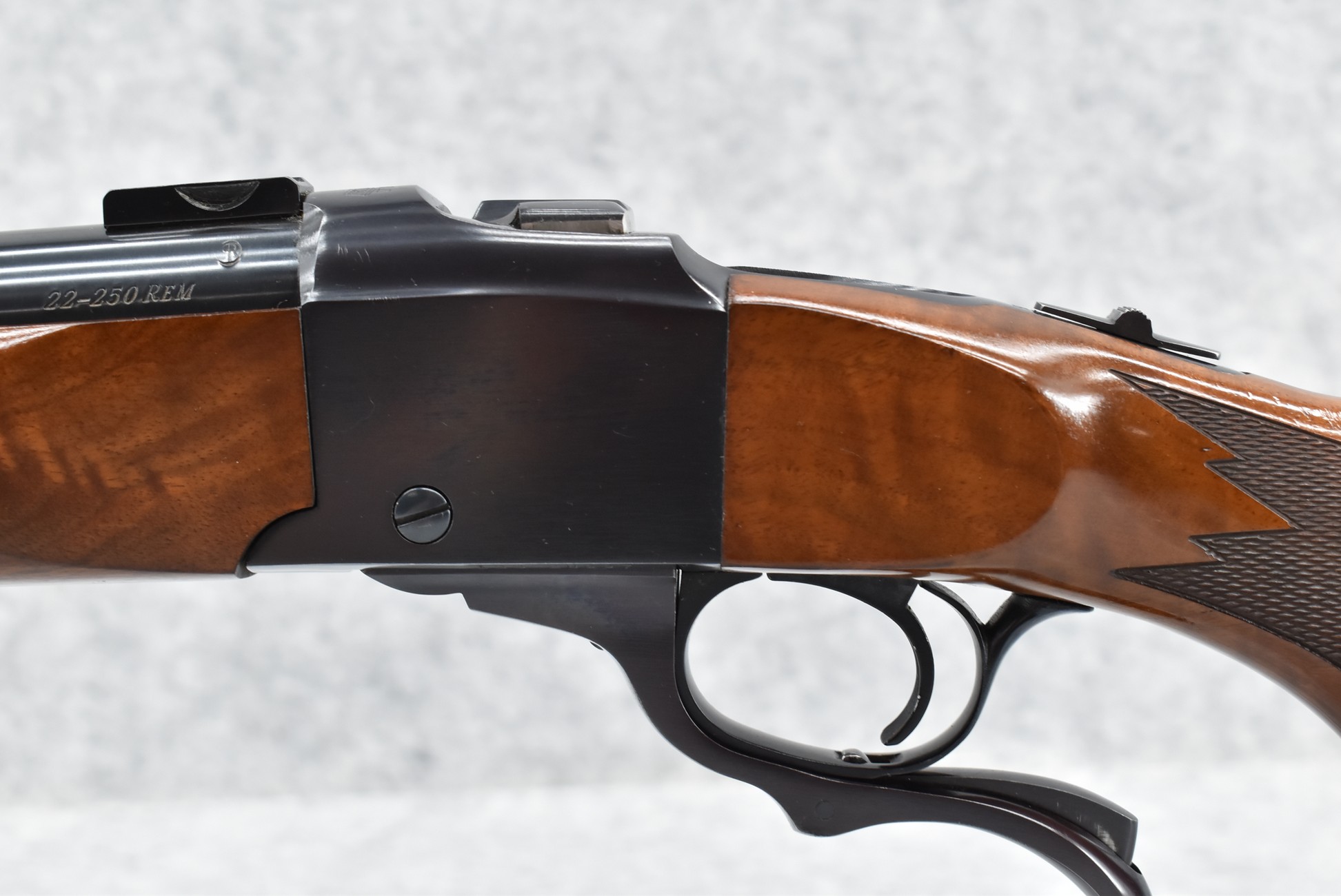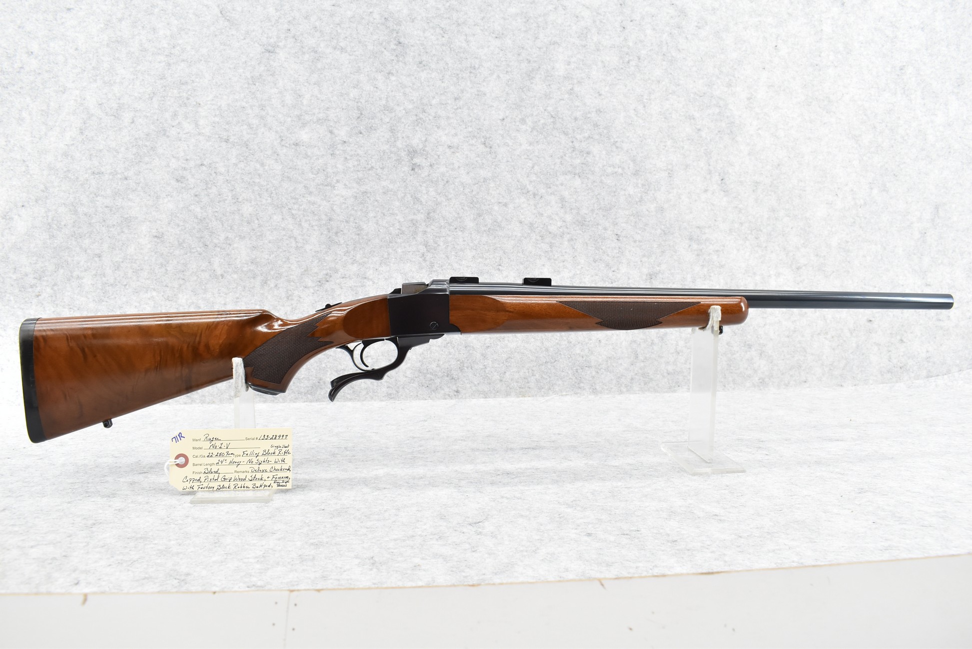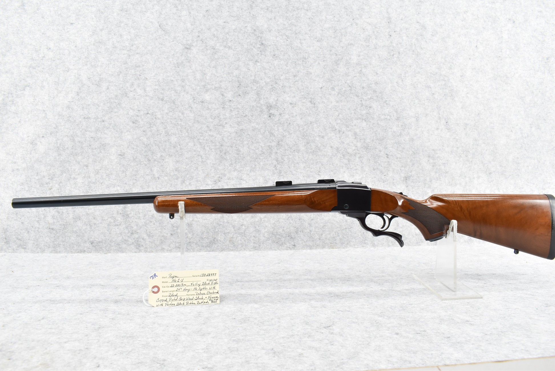 71R. Ruger – Mod. No. 1 V – 22-250 Rem. Cal. Single Shot Falling Block Rifle – w/24” Heavy Barrel – Blued Finish – w/Deluxe Checkered Capped Pistol Grip Wood Stocks w/Factory Butt Pad – w/Ruger Scope Bases