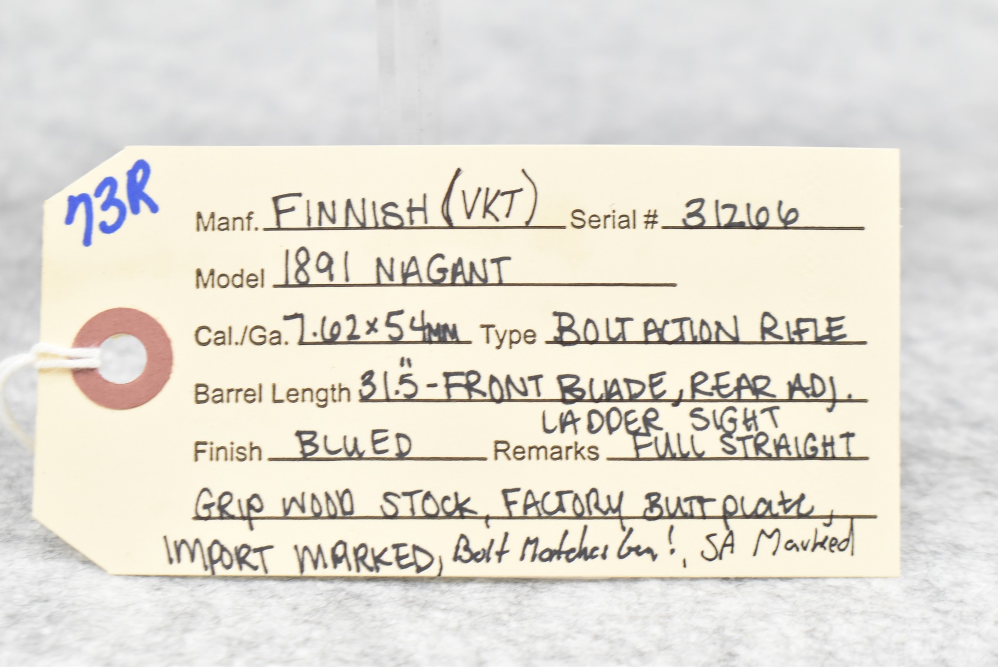 73R. Finnish (VKT) – Mod. 1891 Nagant – 7.62x54mm Cal. Bolt Action Rifle – w/31½” Barrel w/Blade Front and Adjustable Rear Ladder Sights – Blued Finish – w/Full Straight Grip Wood Stock w/Factory Butt Plate – Bolt Numbers Match to Gun – Import Marked – SA Marked
