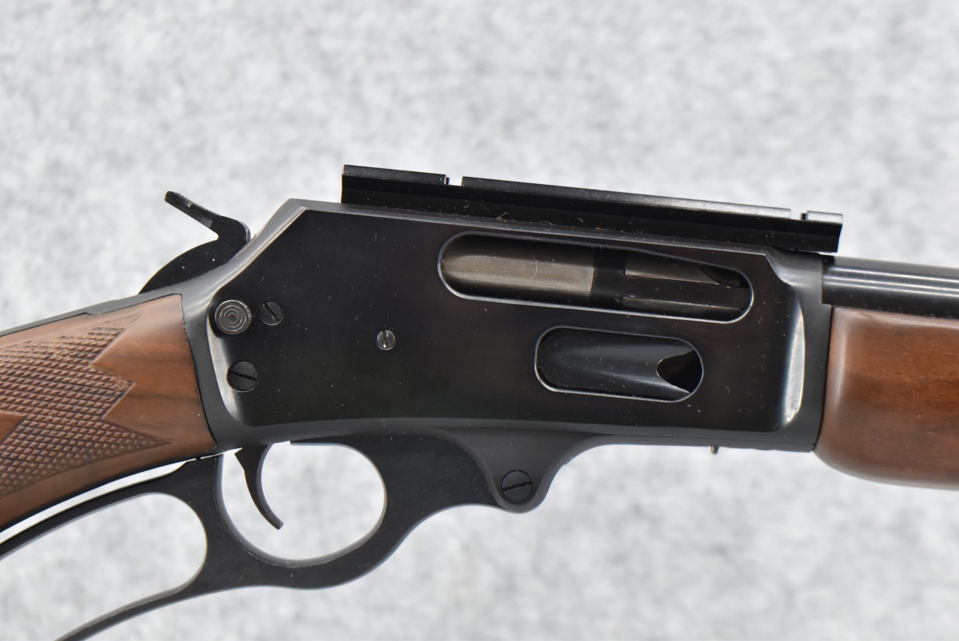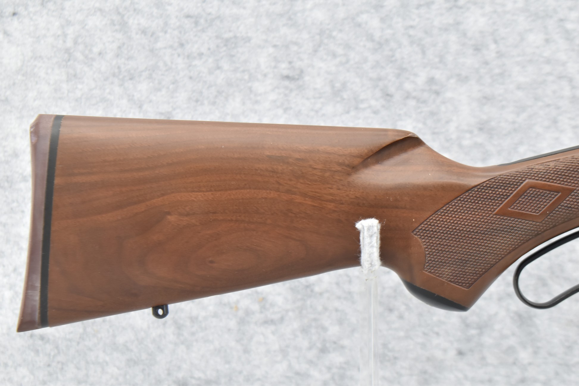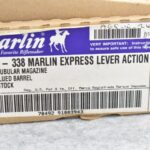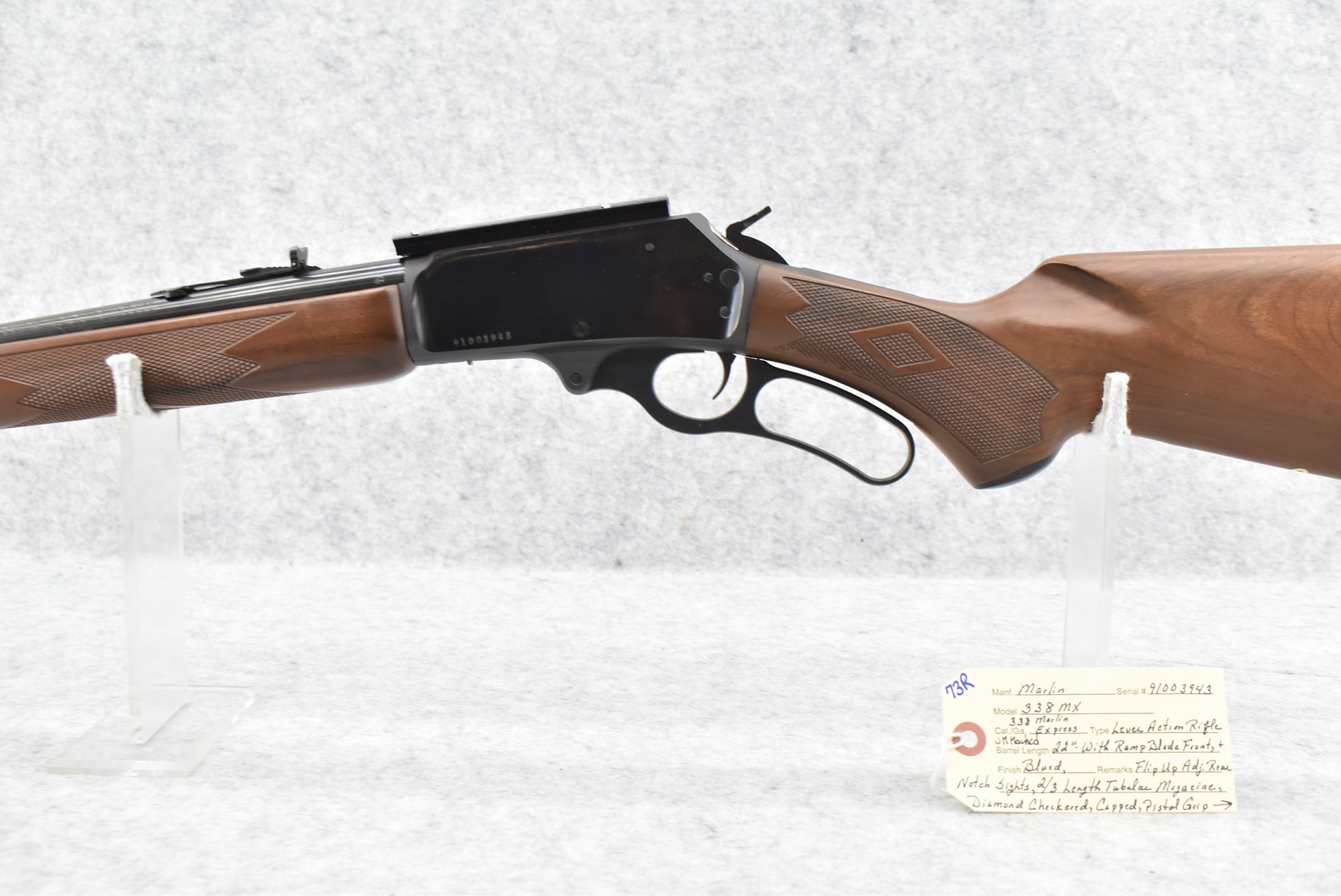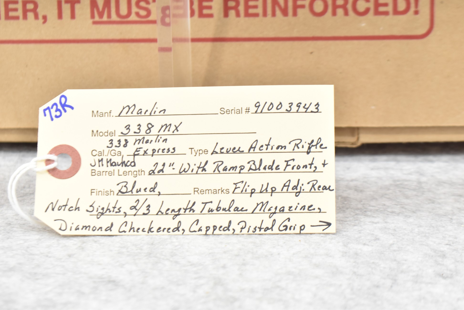 73R. Marlin – Mod. 338MX – 338 Marlin Express Cal. Lever Action Rifle – w/22” JM Marked Barrel w/Ramp Blade Front and Flip-Up Adjustable Rear Notch Sights – Blued Finish – w/Diamond Checkered Capped Pistol Grip Wood Stock and Forearm w/Factory Brown Rubber Butt Pad – w/2/3 Length Tubular Magazine – w/Mounting Base for Optics – Manufactured 2009-2011 Only