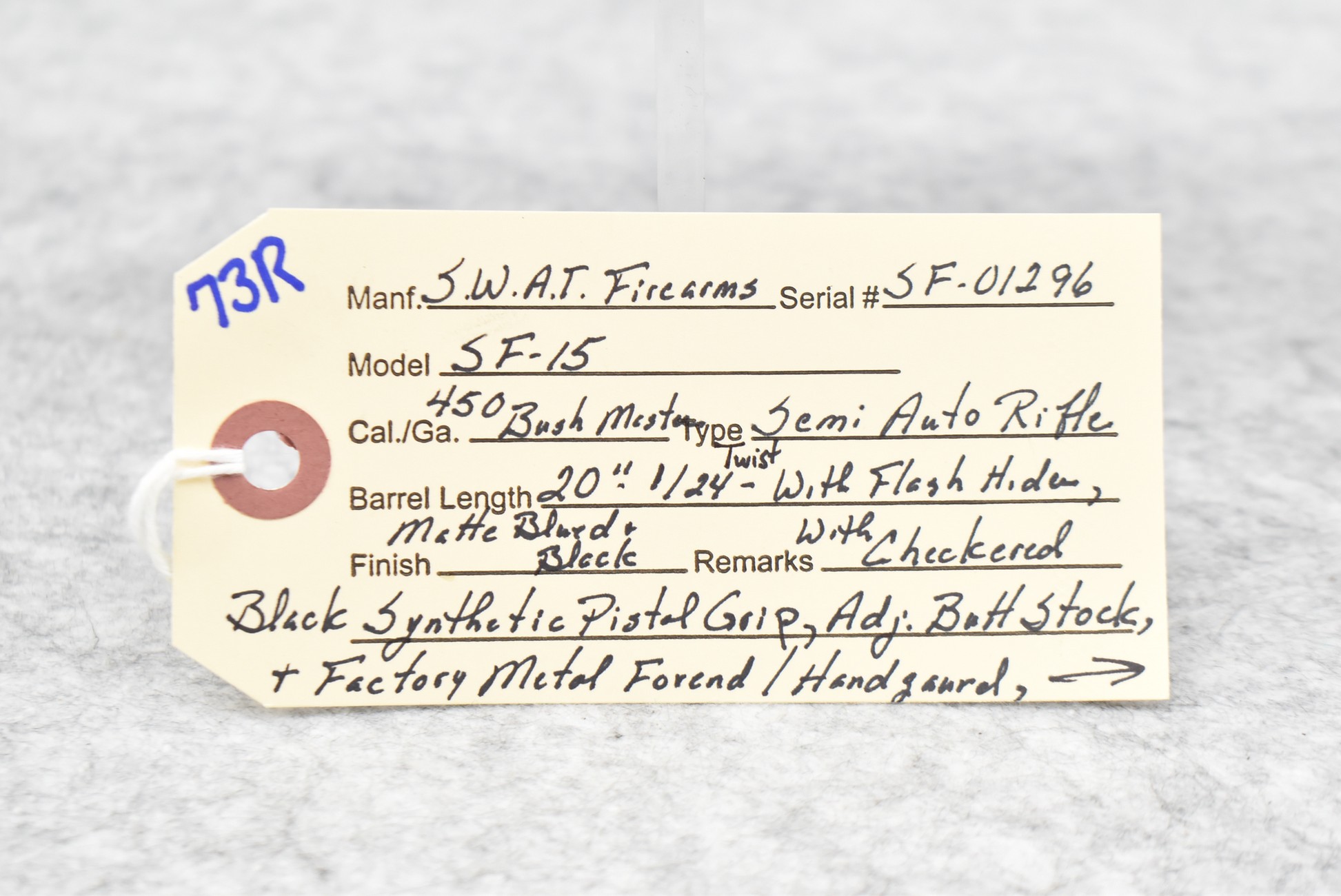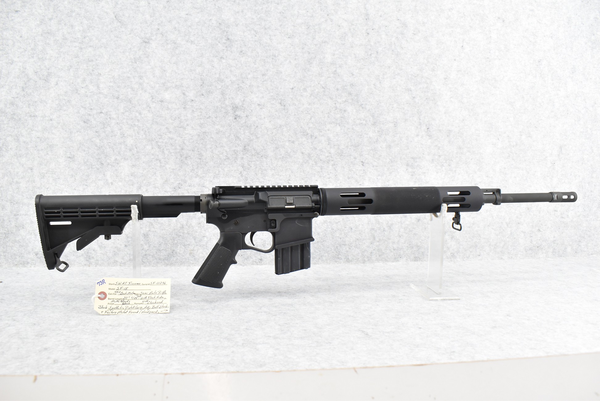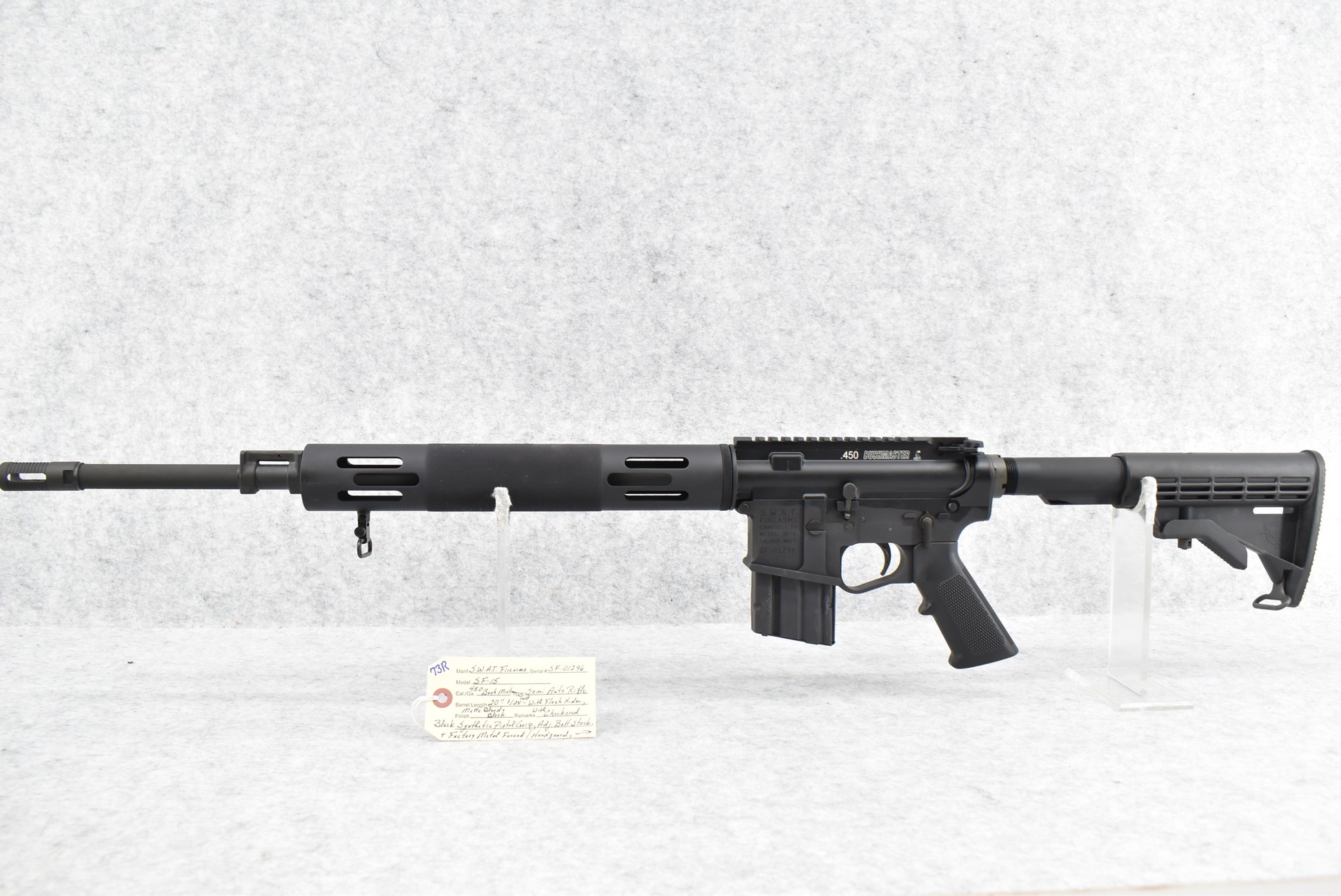 73R. S.W.A.T. Firearms – Mod. SF-15 – 450 Bushmaster Cal. Semi-Auto Rifle – w/20” 1/24 Twist Barrel w/Flash Hider – Matte Black Finish – w/Checkered Black Synthetic Pistol Grip, Adj. Butt Stock & Factory Metal Vented Handguard – w/Bushmaster Detachable Magazine (CANNOT GO MARYLAND!)