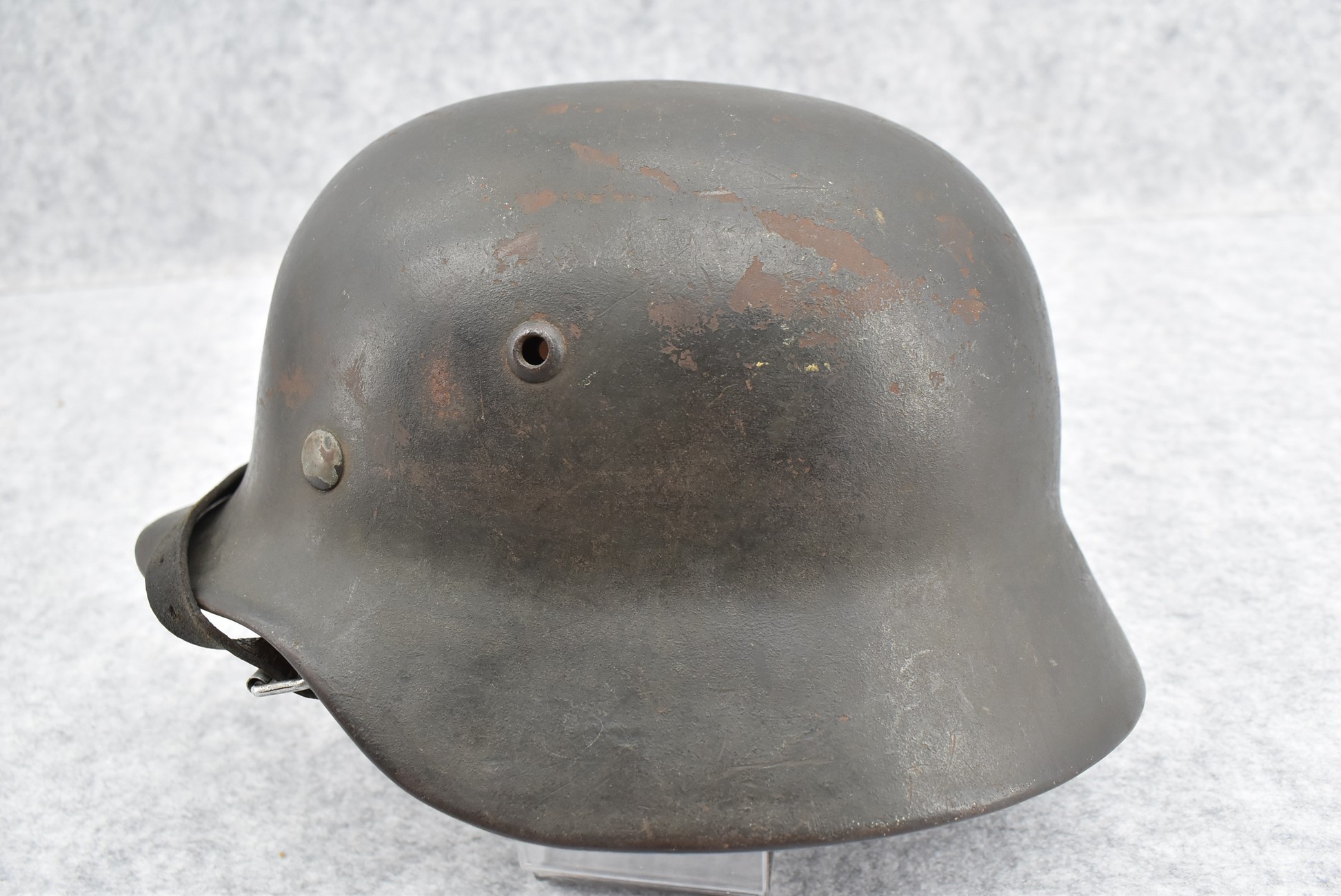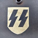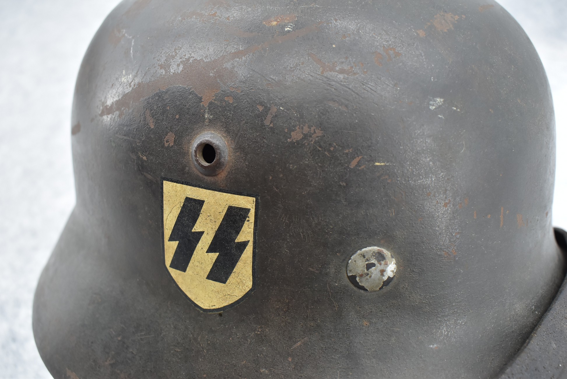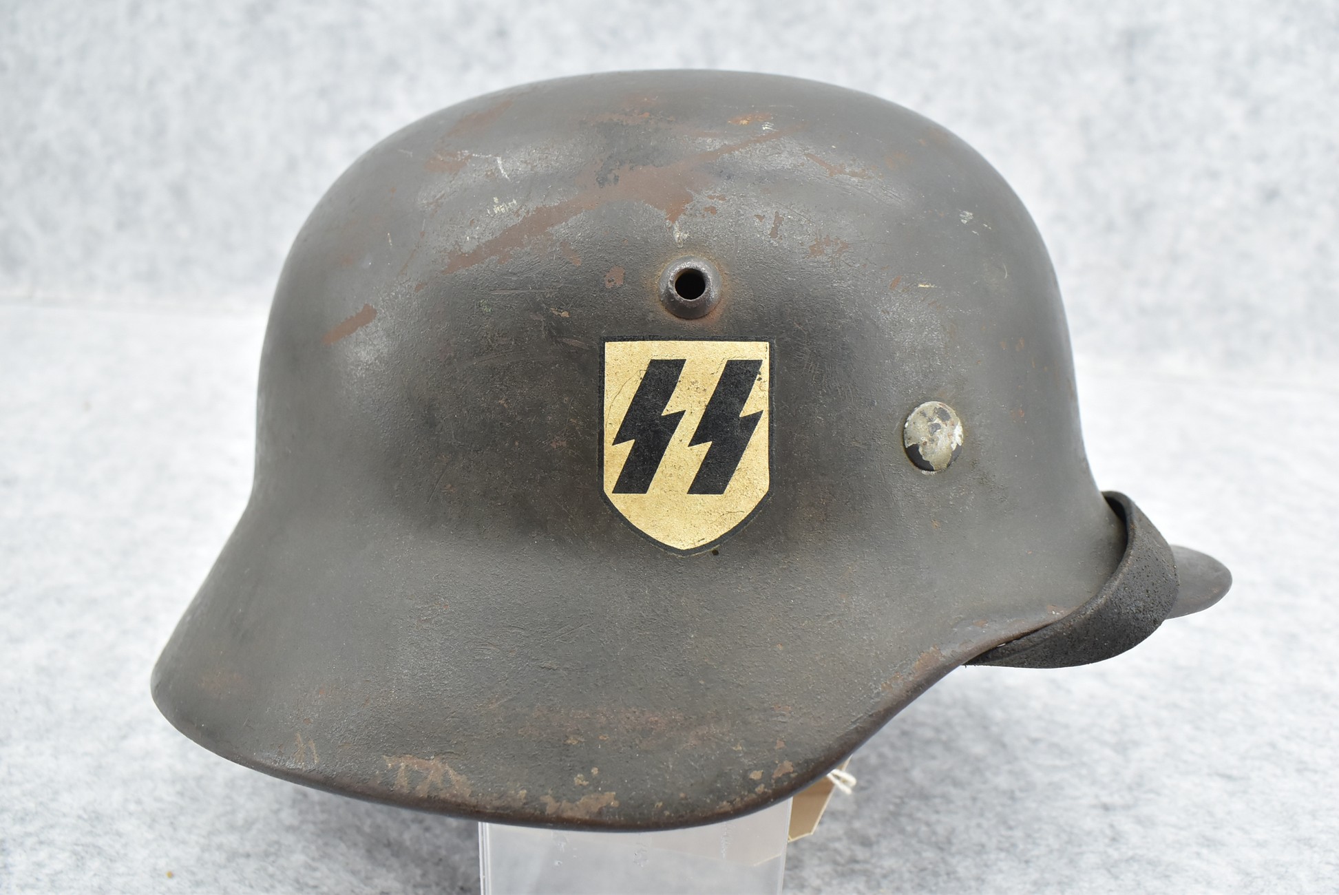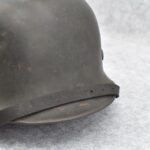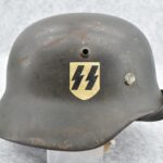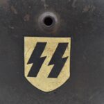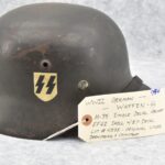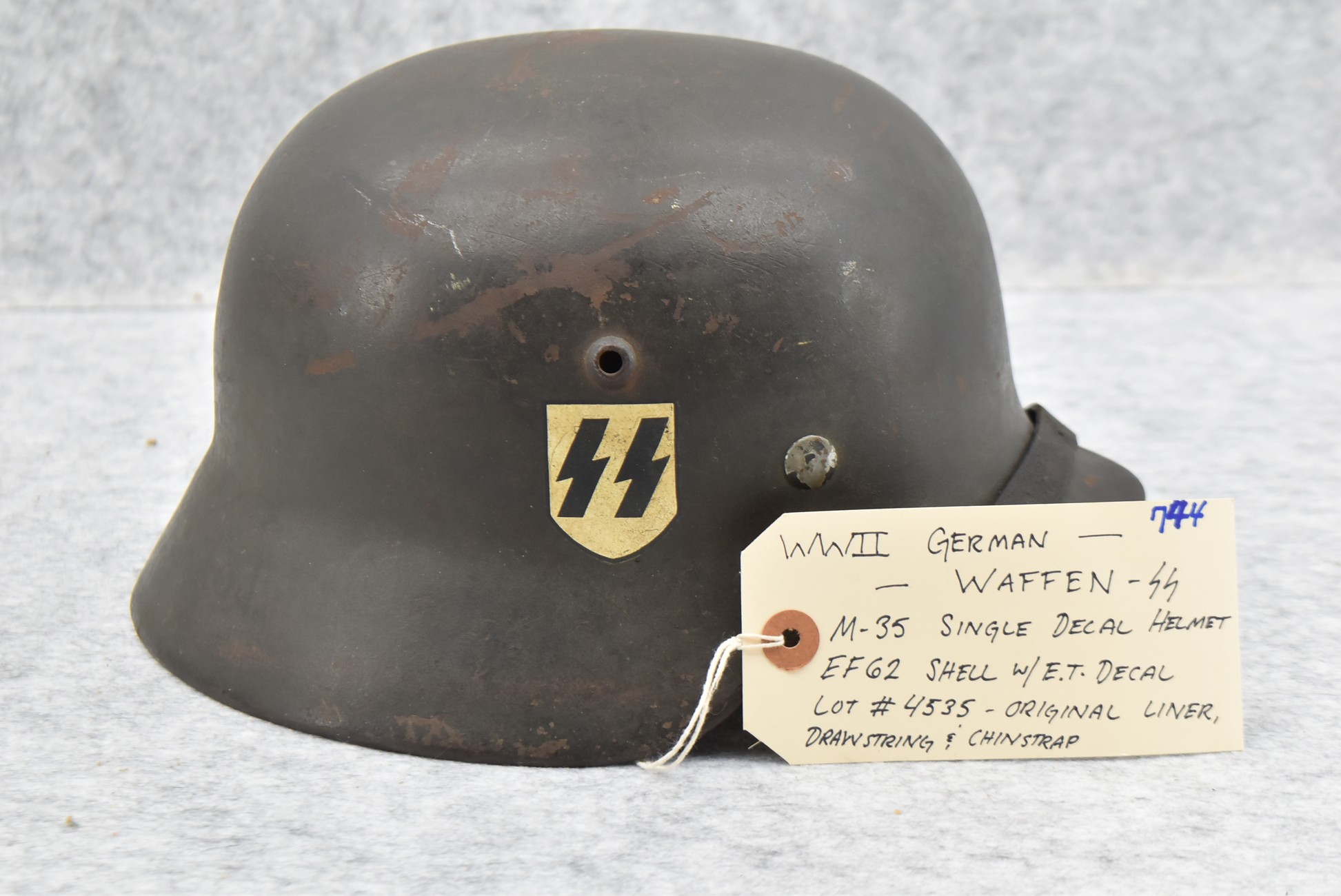 744. WWII German – Waffen-SS – M-35 Single Decal Helmet EF62 Shell w/E.T. Decal – Lot #4535 – w/Original Liner, Drawstring & Chin Strap