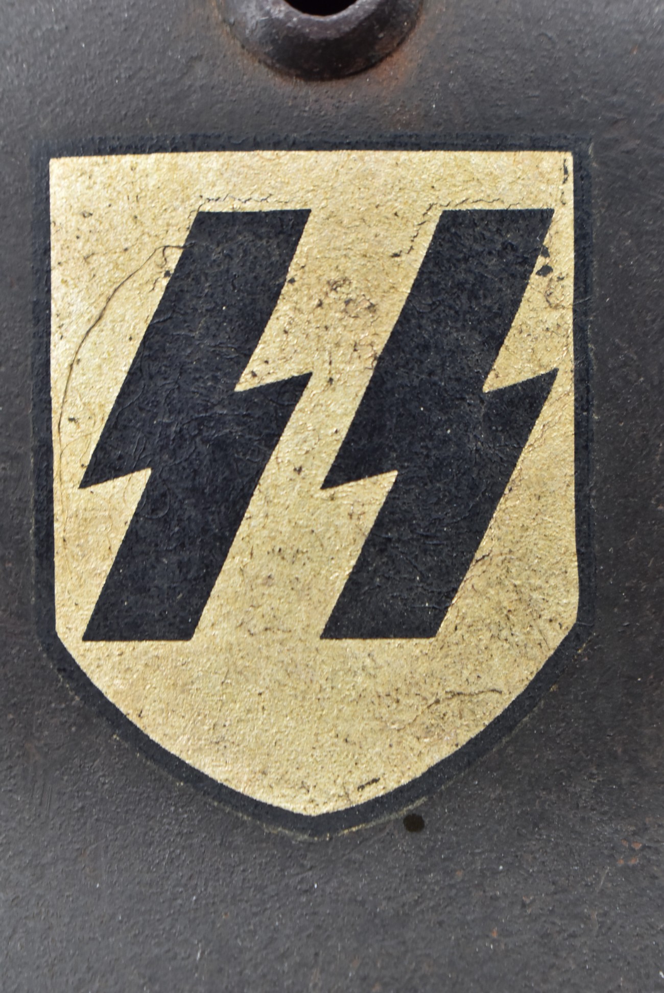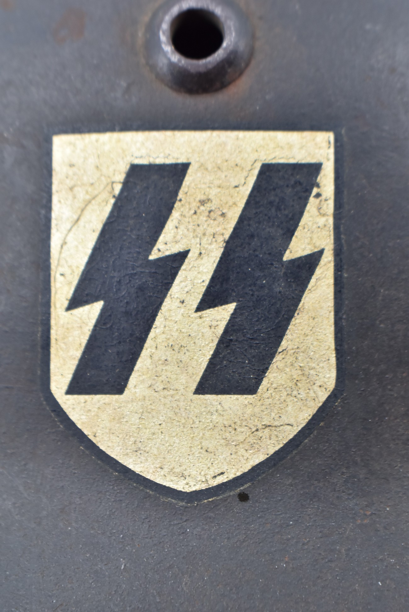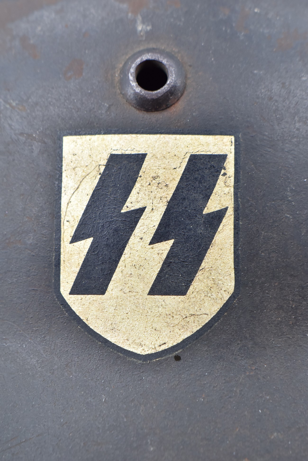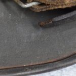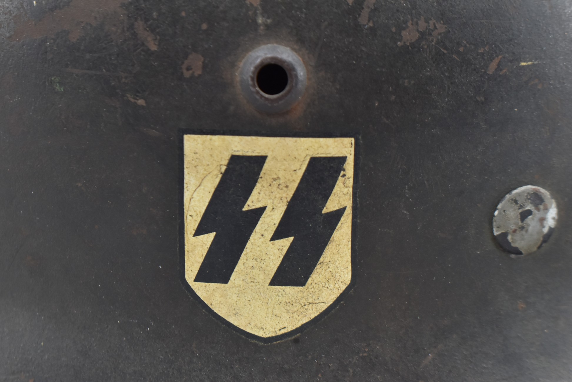 744. WWII German – Waffen-SS – M-35 Single Decal Helmet EF62 Shell w/E.T. Decal – Lot #4535 – w/Original Liner, Drawstring & Chin Strap
