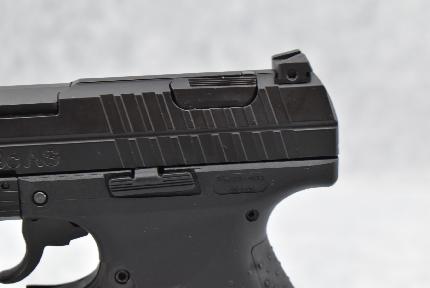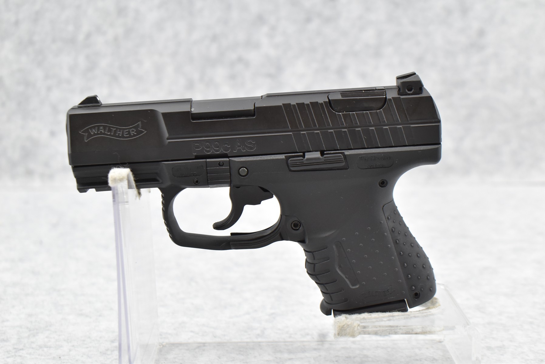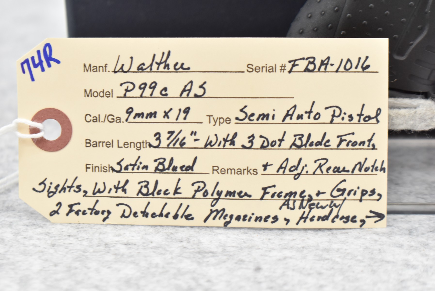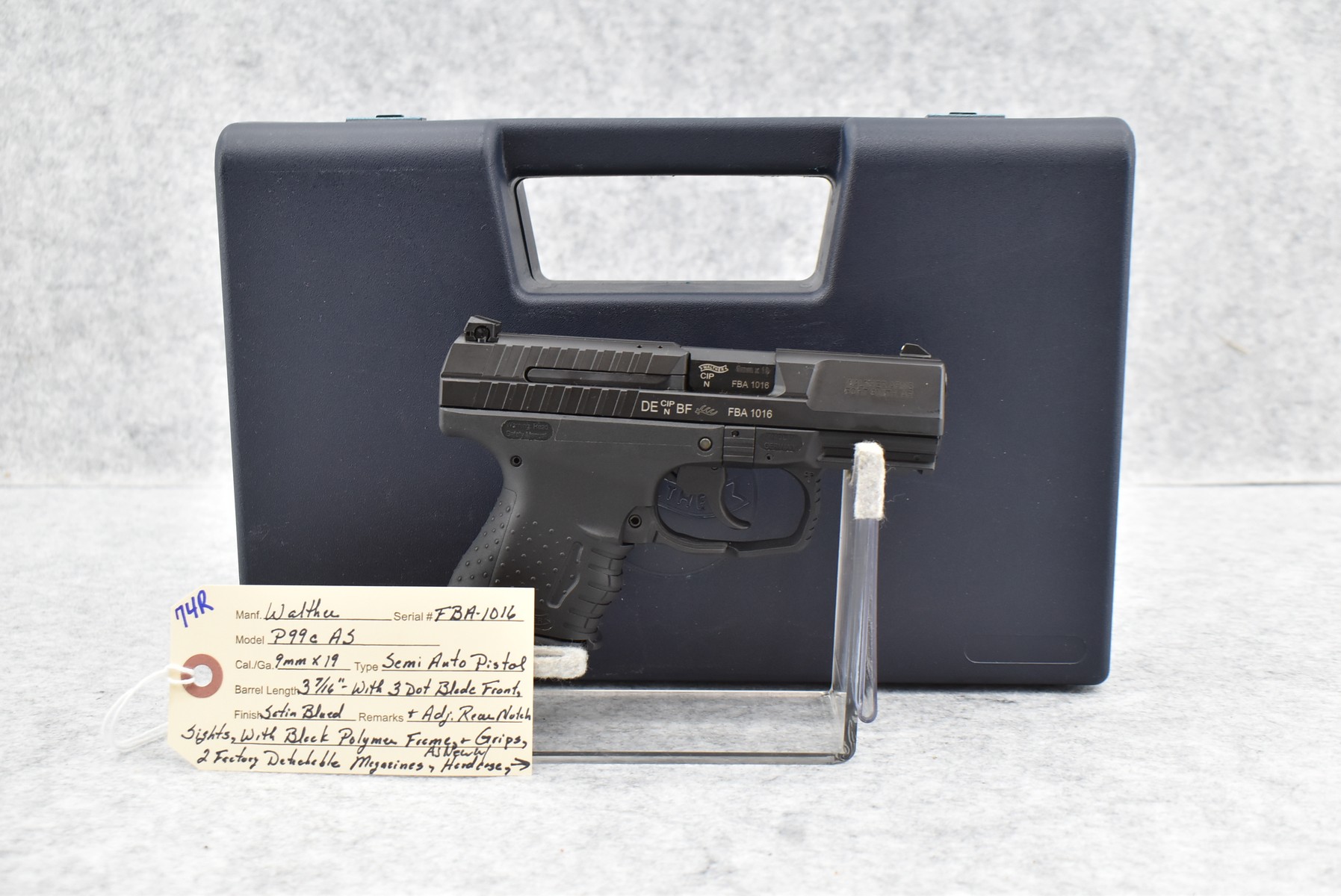 74R. Walther – Mod. P99c AS – 9mm X19 Cal. Semi-Auto Pistol – w/3 7/16” Barrel w/3-Dot Blade Front & Adj. Rear Notch Sights – Satin Blued Finish – w/Black Polymer Frame & Grips – w/2 Factory Detachable Magazines – As New w/Hard Case, Manual & Accessories