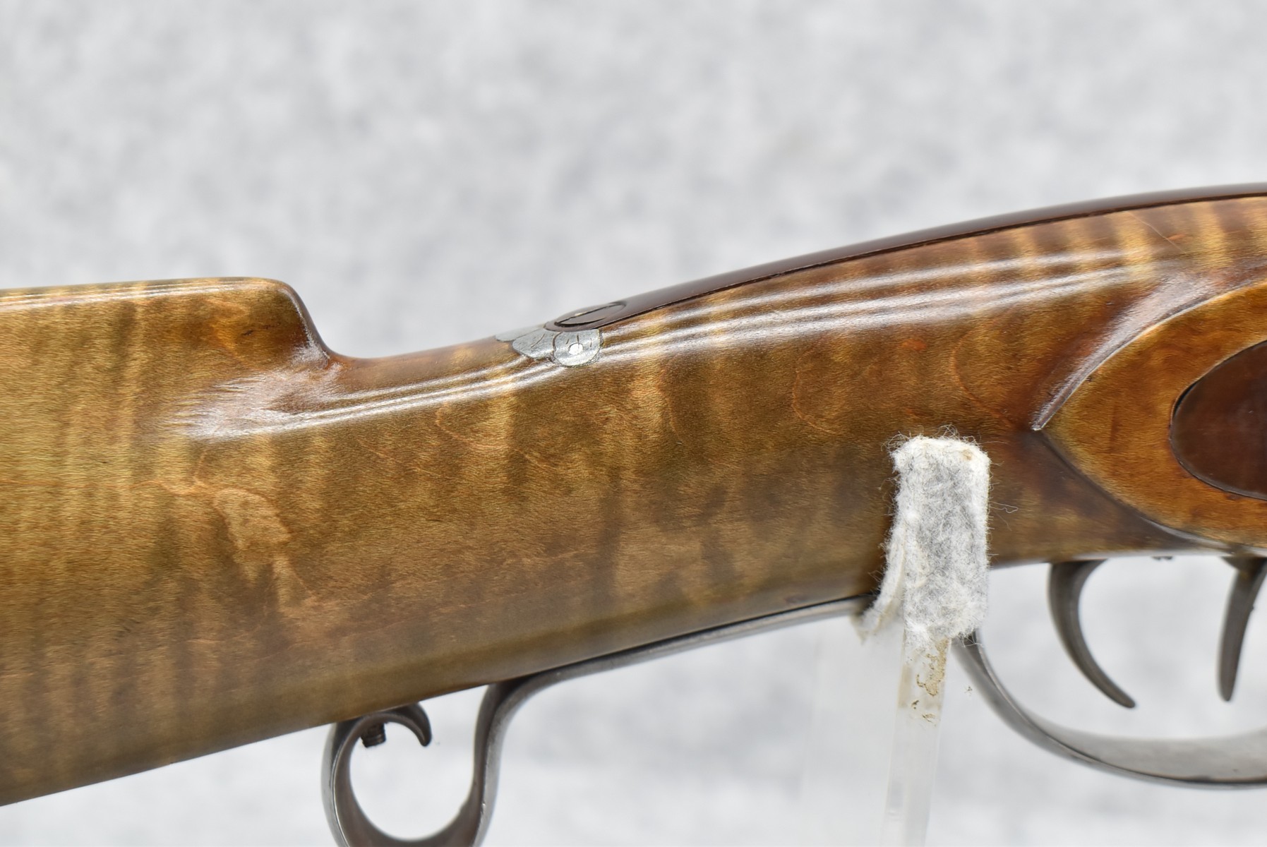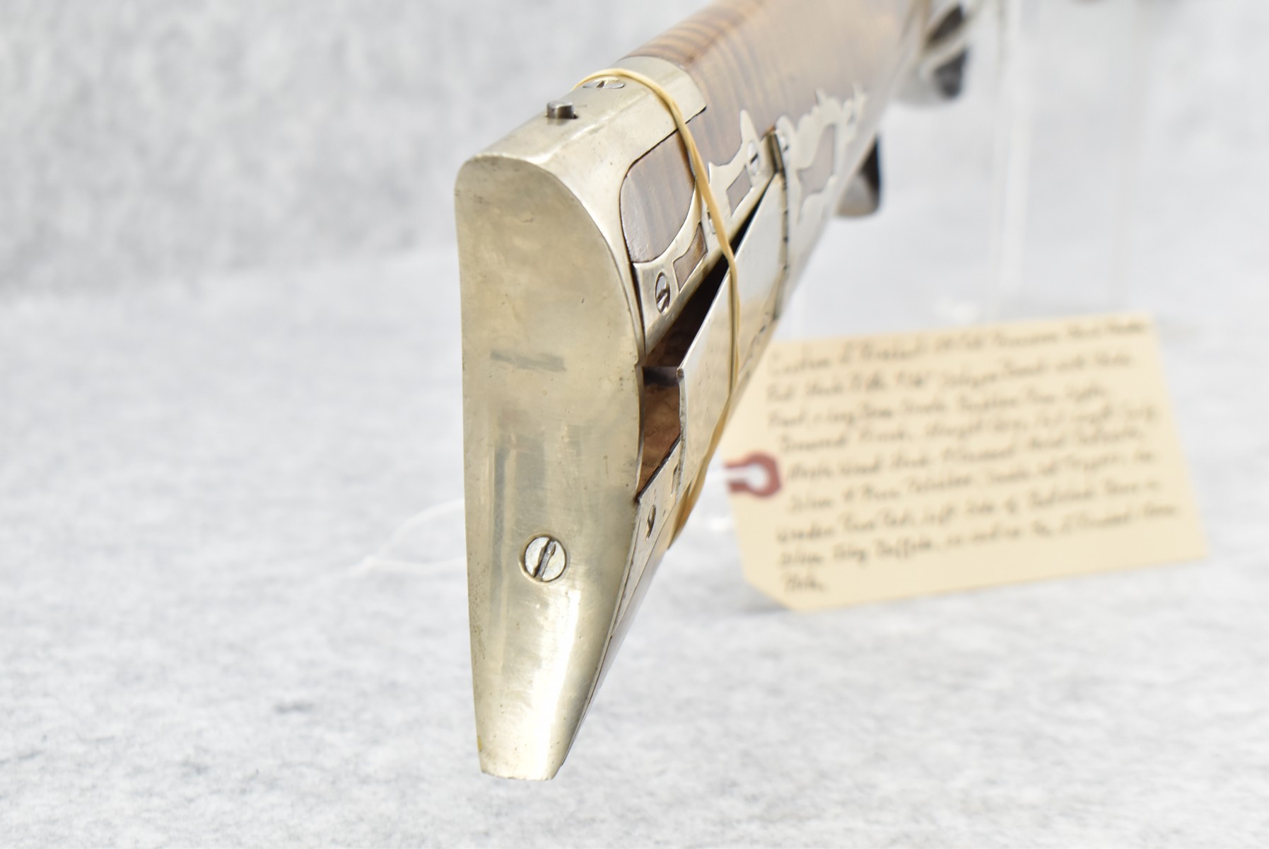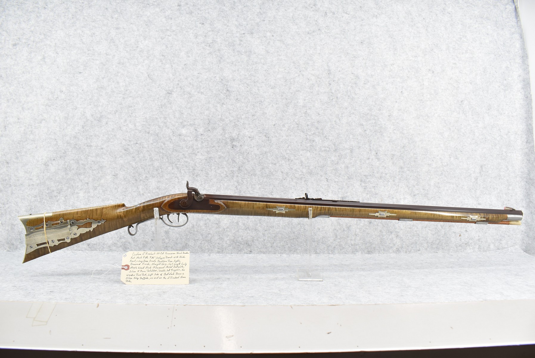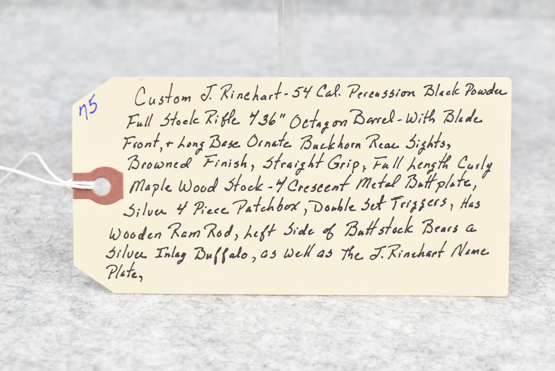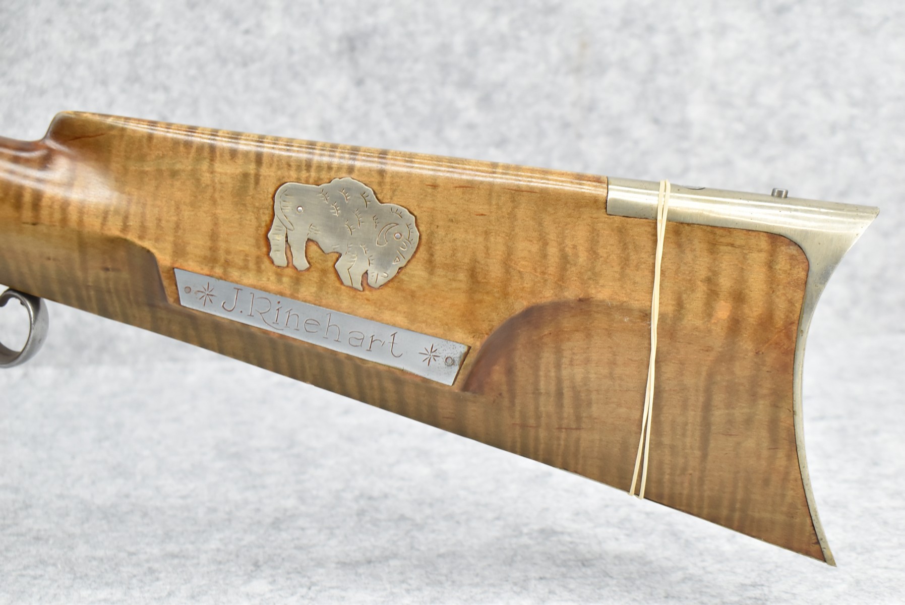 75. Custom J. Rinehart – 54 Cal. Percussion Black Powder Full Stock Rifle – w/36” Octagon Barrel – w/Blade Front & Long Base Ornate Buckhorn Rear Sights – Brown Finish – w/Straight Grip Full Length Curly Maple Wood Stock w/Crescent Metal Butt Plate & Silver 4pc. Patch Box – Left Side of Butt Stock Bears a Silver Inlay Buffalo as Well as the J. Rinehart Name Plate – w/Double Set Triggers – w/Wooden Ram Rod
