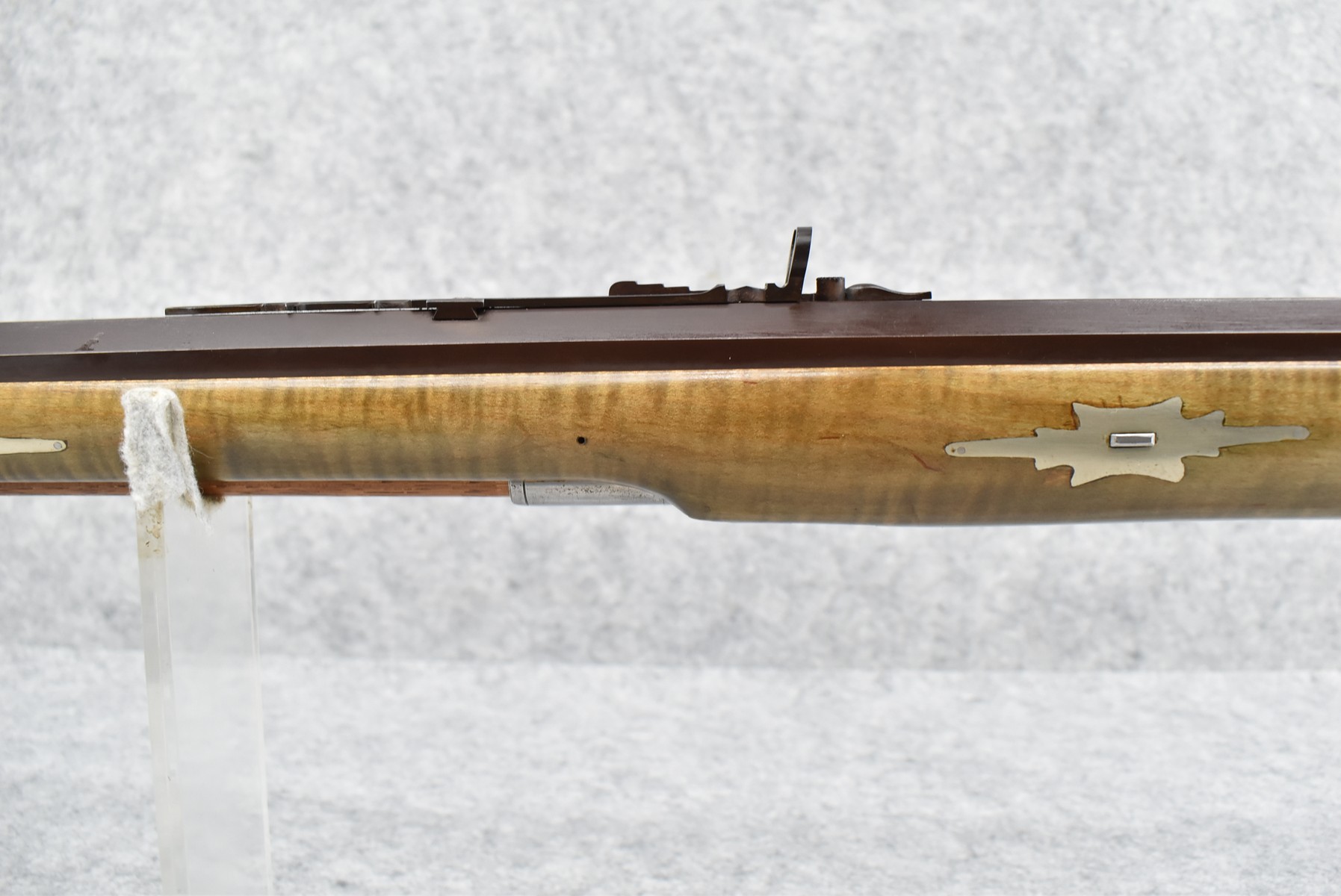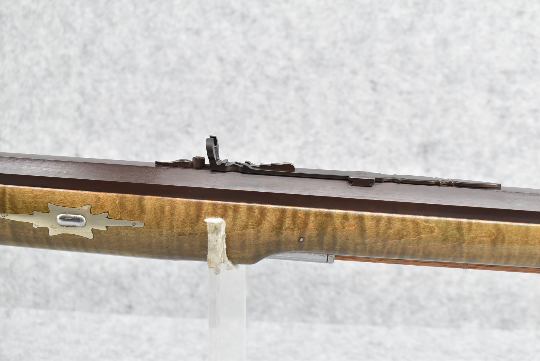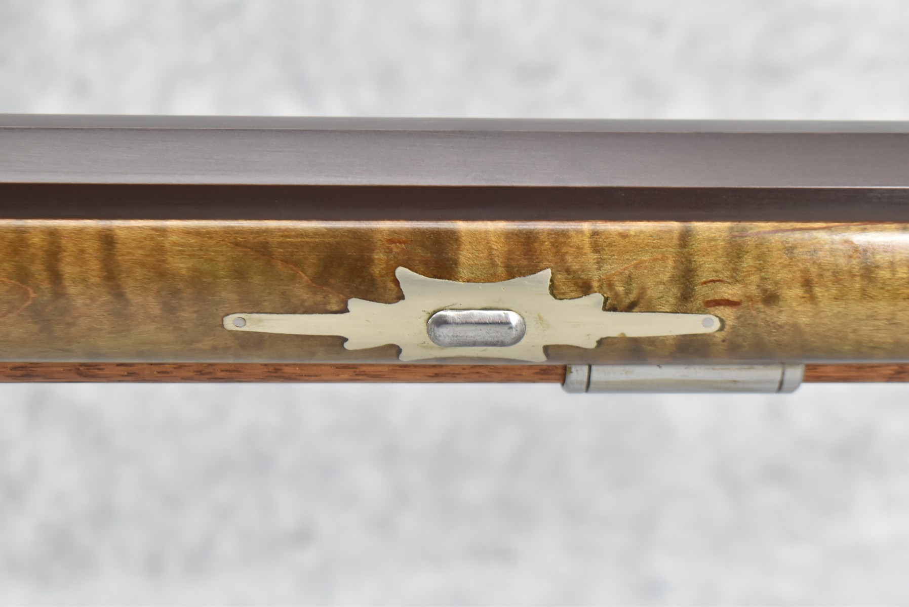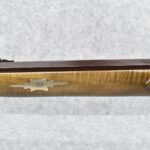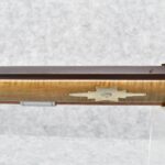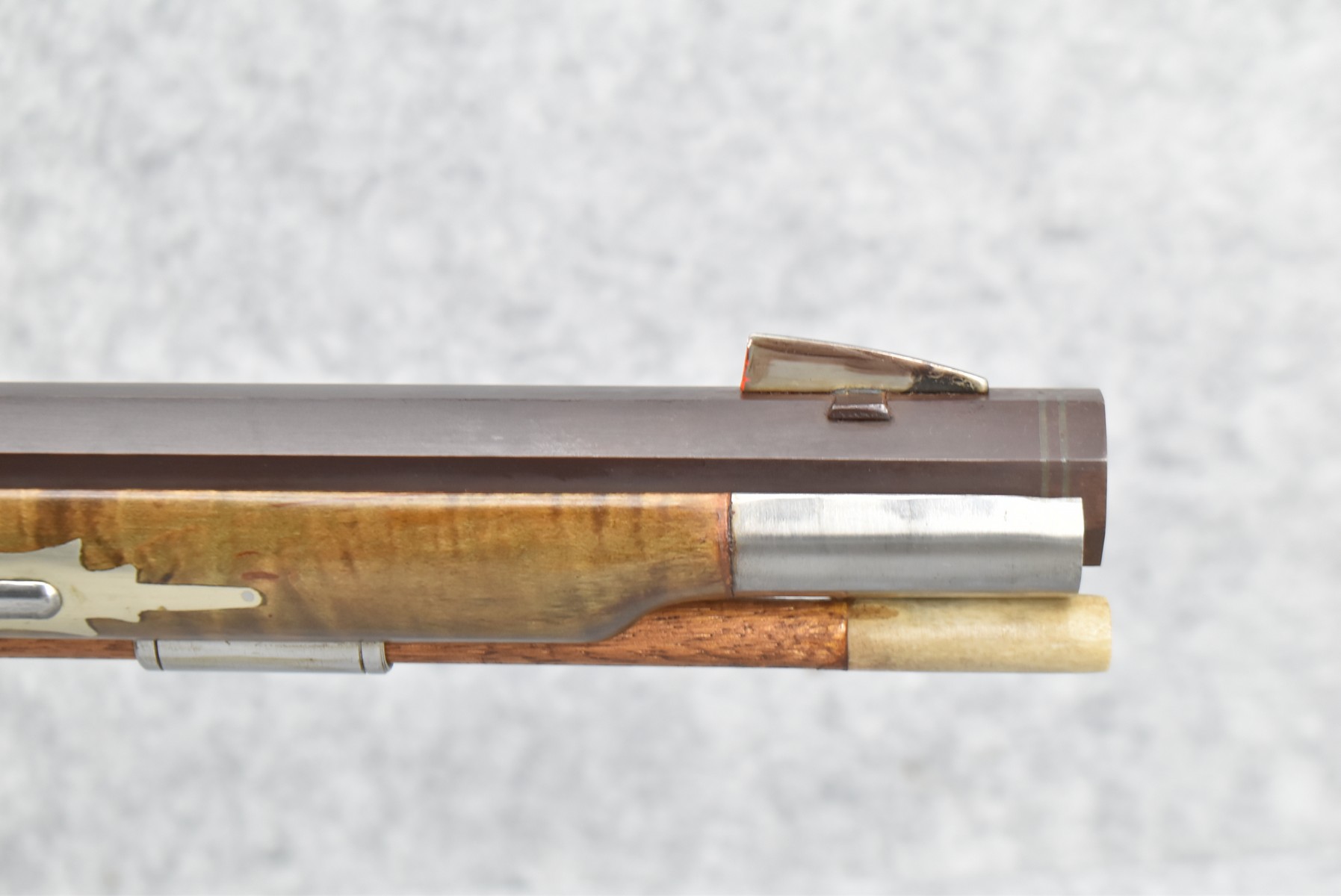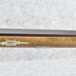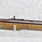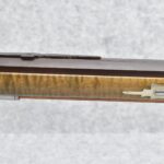 75. Custom J. Rinehart – 54 Cal. Percussion Black Powder Full Stock Rifle – w/36” Octagon Barrel – w/Blade Front & Long Base Ornate Buckhorn Rear Sights – Brown Finish – w/Straight Grip Full Length Curly Maple Wood Stock w/Crescent Metal Butt Plate & Silver 4pc. Patch Box – Left Side of Butt Stock Bears a Silver Inlay Buffalo as Well as the J. Rinehart Name Plate – w/Double Set Triggers – w/Wooden Ram Rod