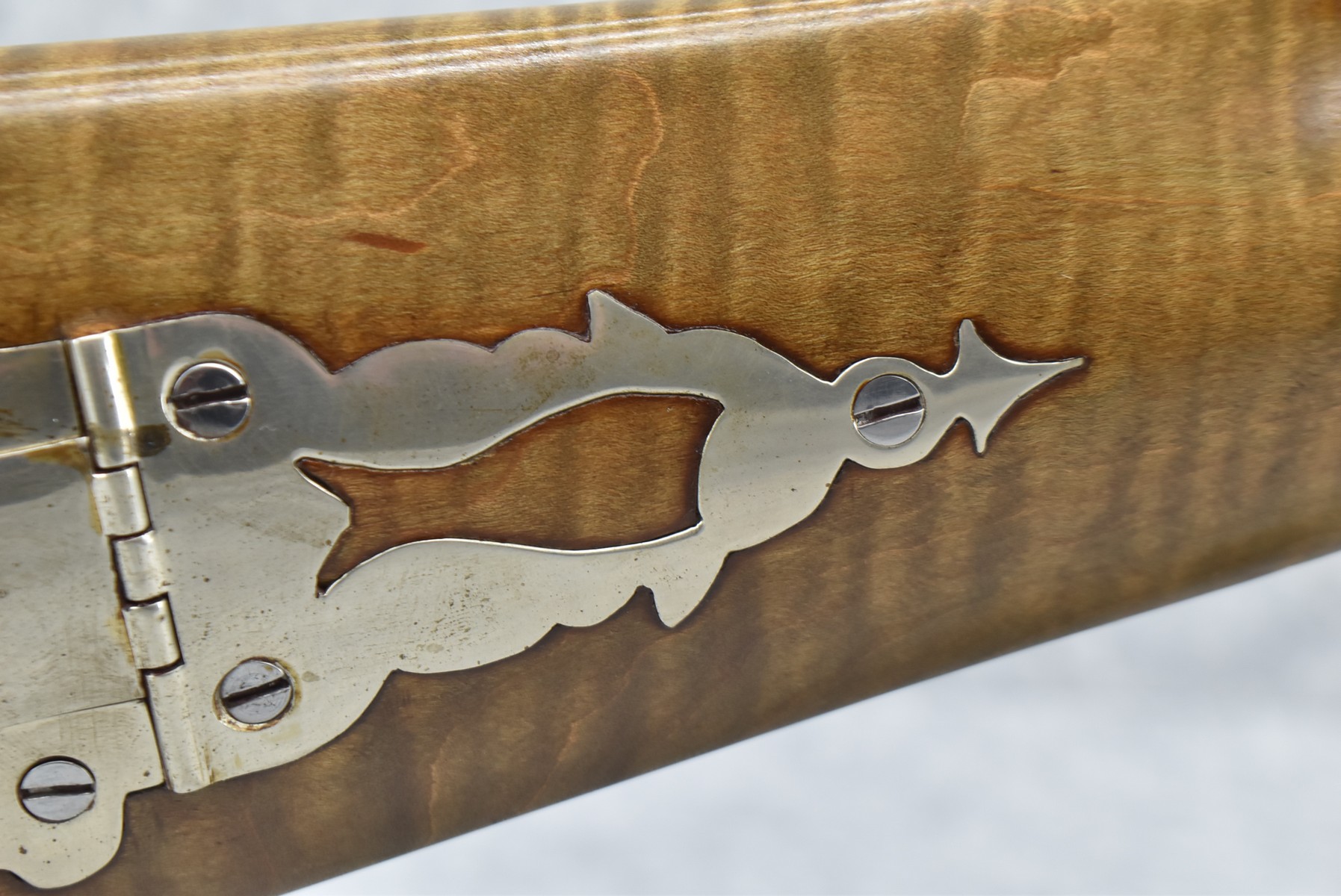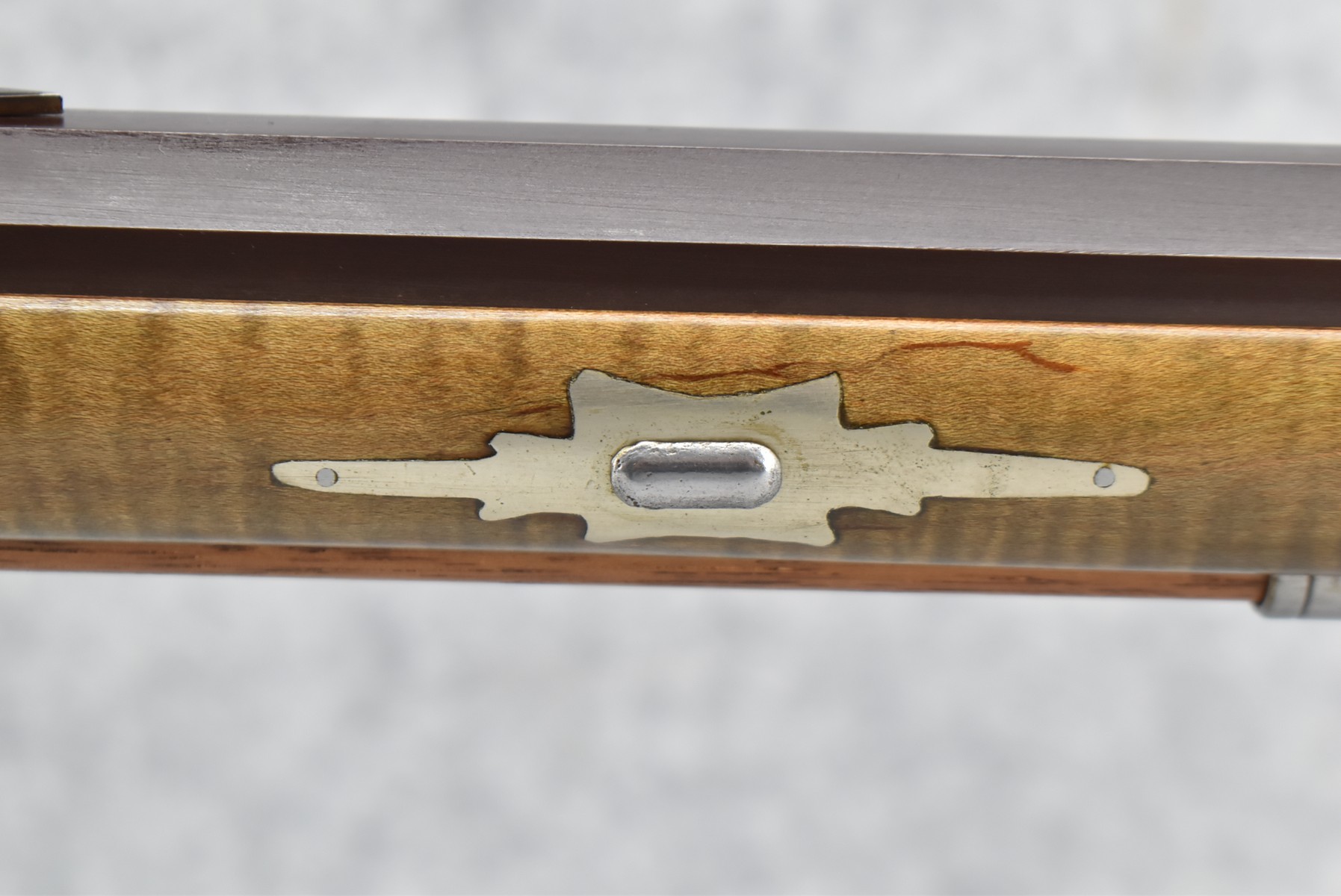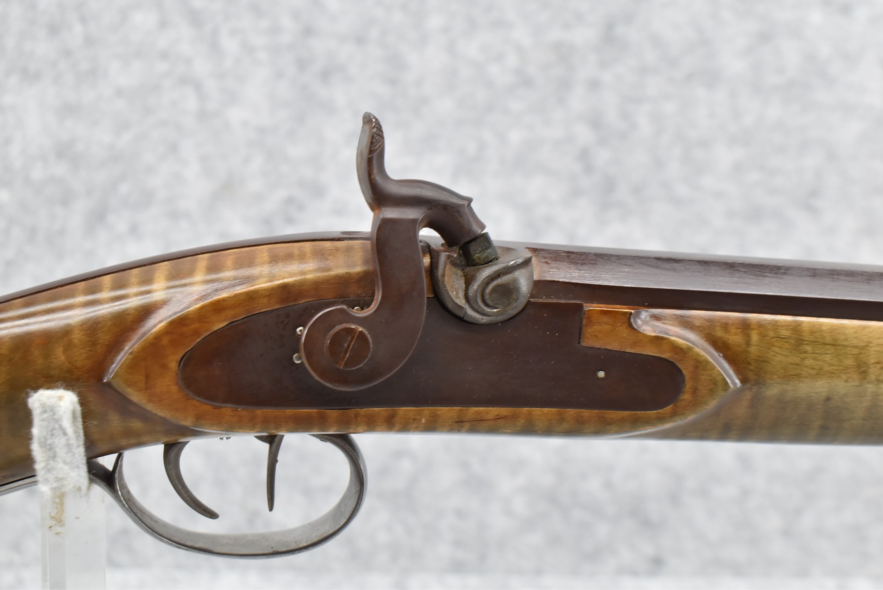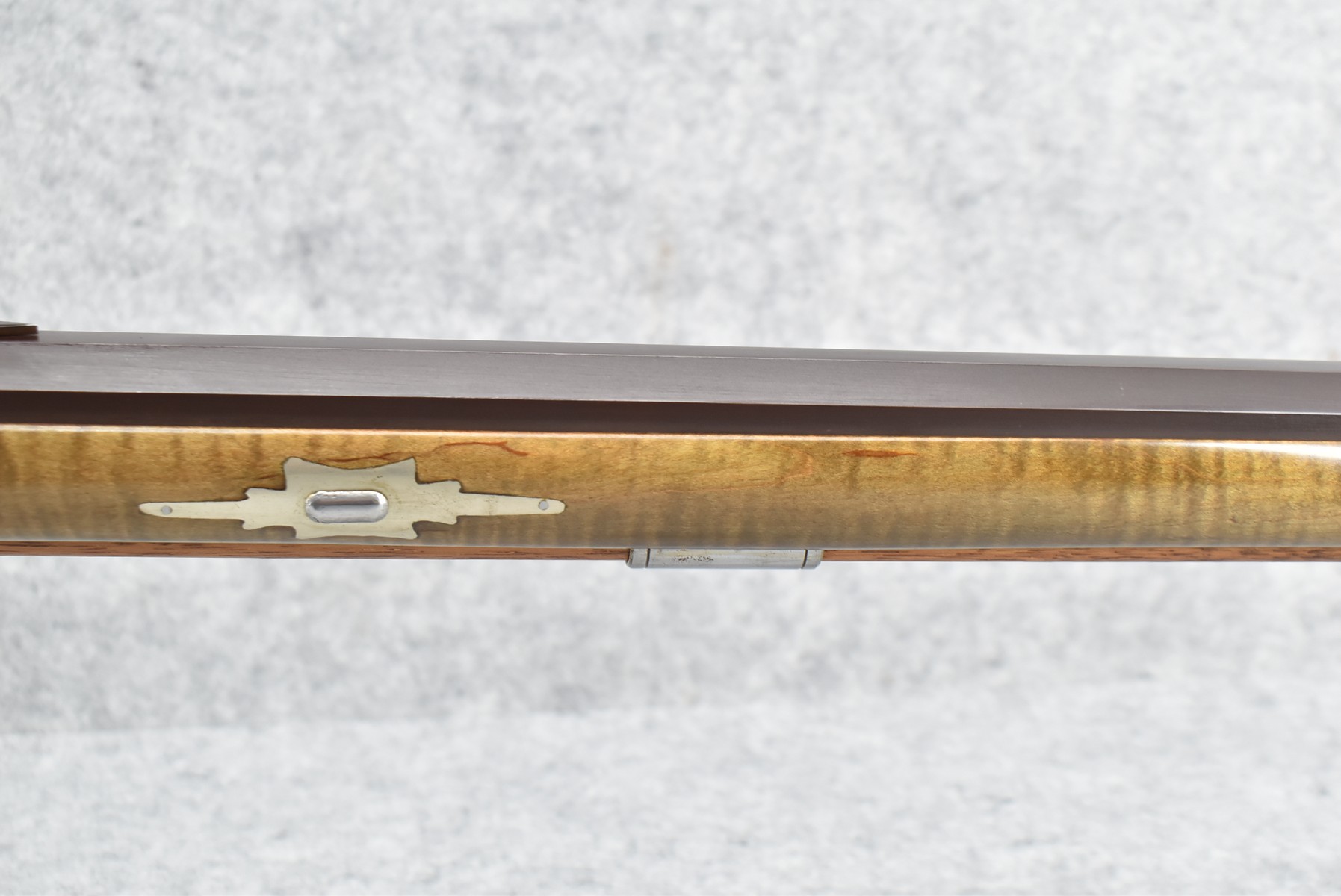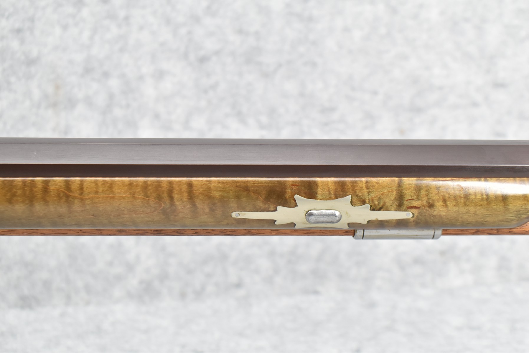 75. Custom J. Rinehart – 54 Cal. Percussion Black Powder Full Stock Rifle – w/36” Octagon Barrel – w/Blade Front & Long Base Ornate Buckhorn Rear Sights – Brown Finish – w/Straight Grip Full Length Curly Maple Wood Stock w/Crescent Metal Butt Plate & Silver 4pc. Patch Box – Left Side of Butt Stock Bears a Silver Inlay Buffalo as Well as the J. Rinehart Name Plate – w/Double Set Triggers – w/Wooden Ram Rod