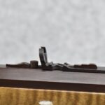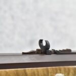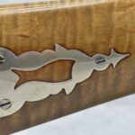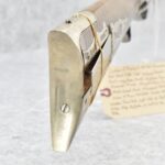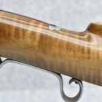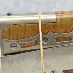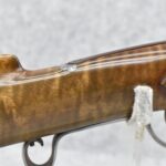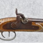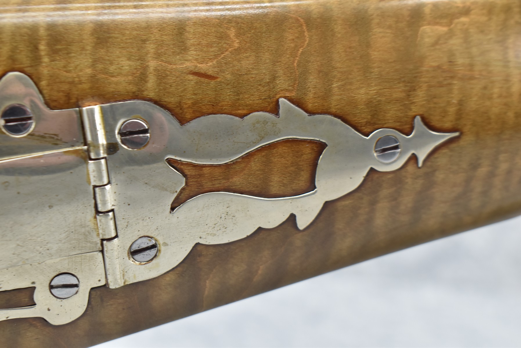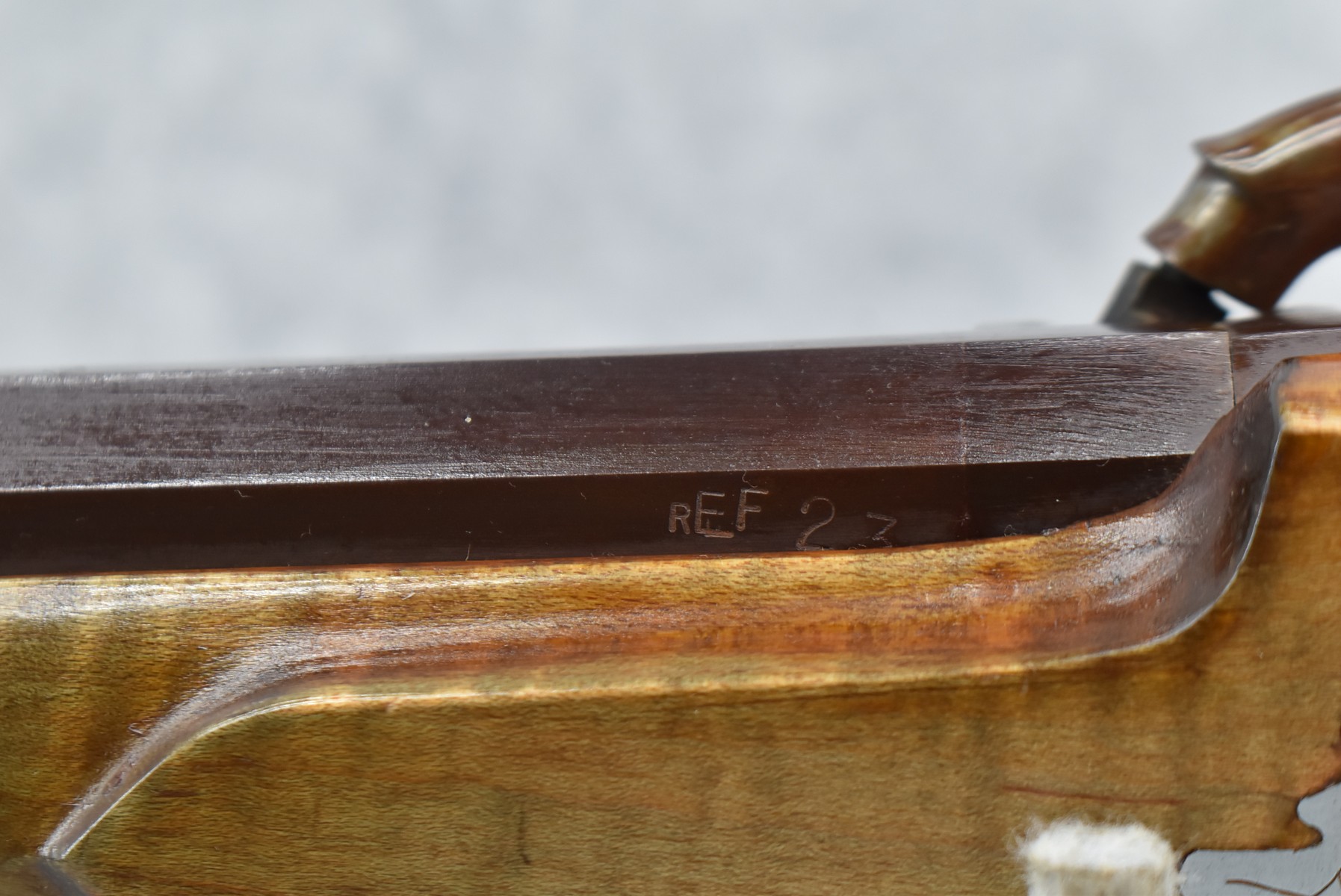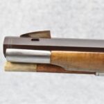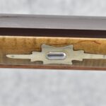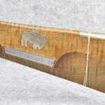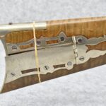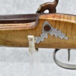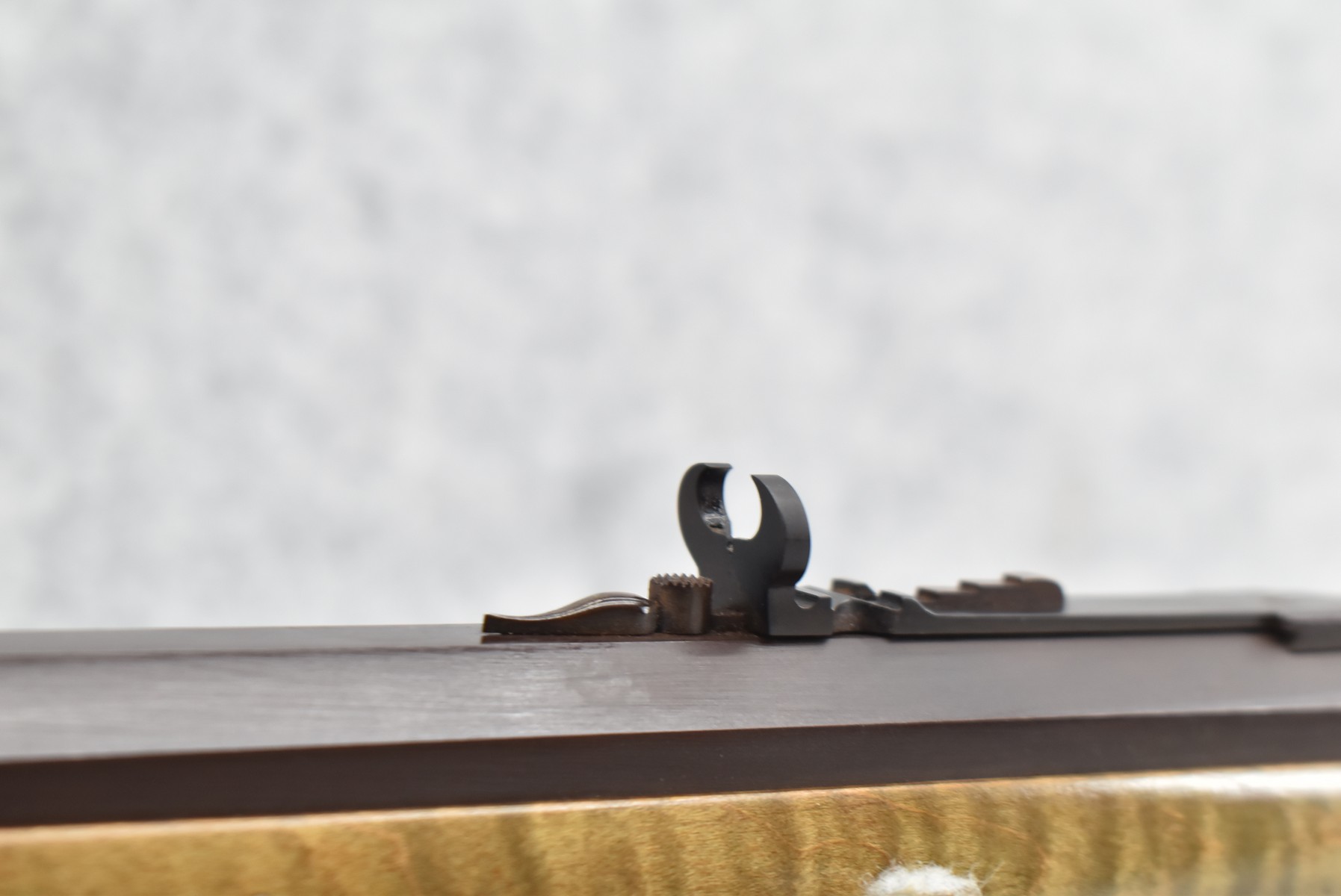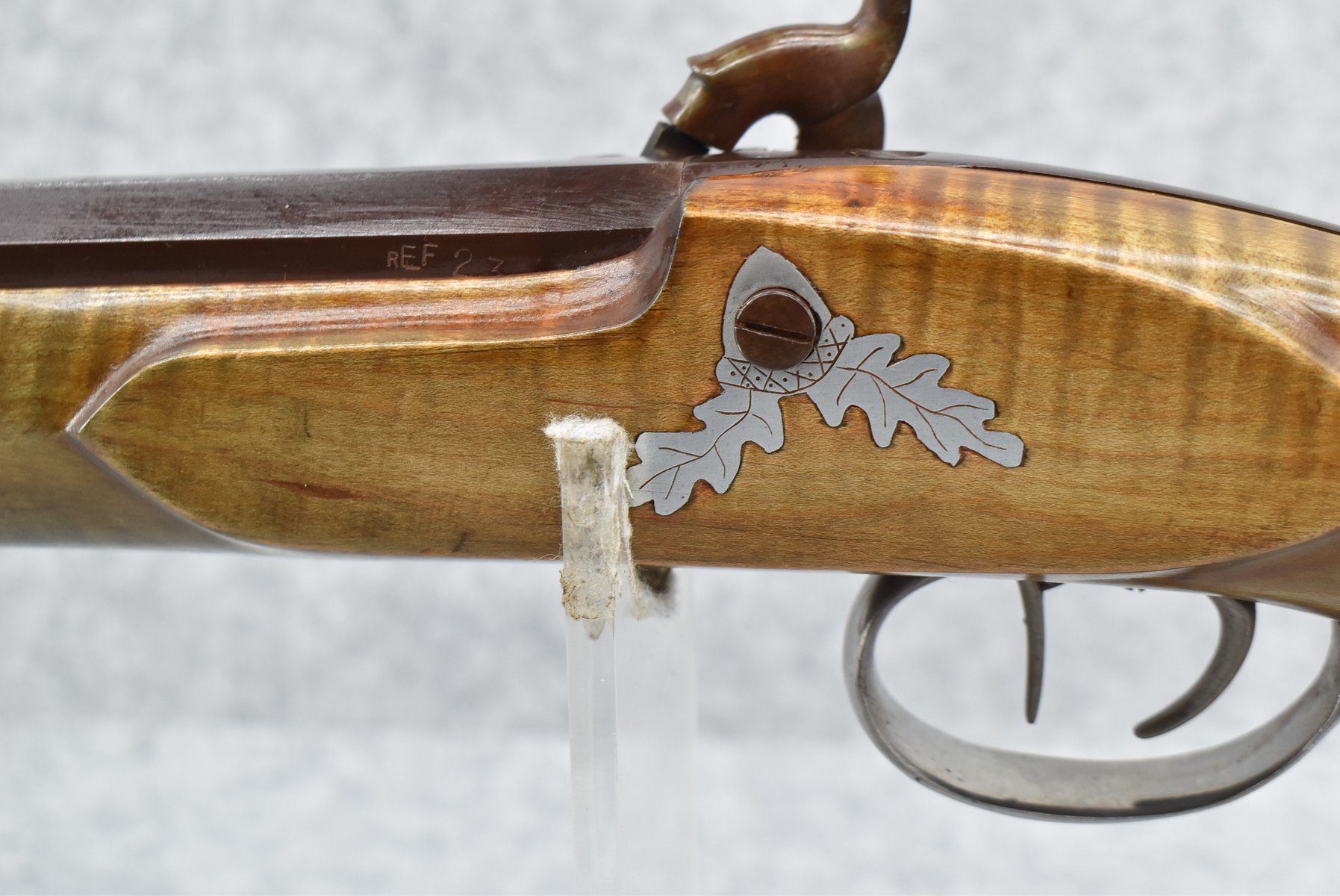 75. Custom J. Rinehart – 54 Cal. Percussion Black Powder Full Stock Rifle – w/36” Octagon Barrel – w/Blade Front & Long Base Ornate Buckhorn Rear Sights – Brown Finish – w/Straight Grip Full Length Curly Maple Wood Stock w/Crescent Metal Butt Plate & Silver 4pc. Patch Box – Left Side of Butt Stock Bears a Silver Inlay Buffalo as Well as the J. Rinehart Name Plate – w/Double Set Triggers – w/Wooden Ram Rod