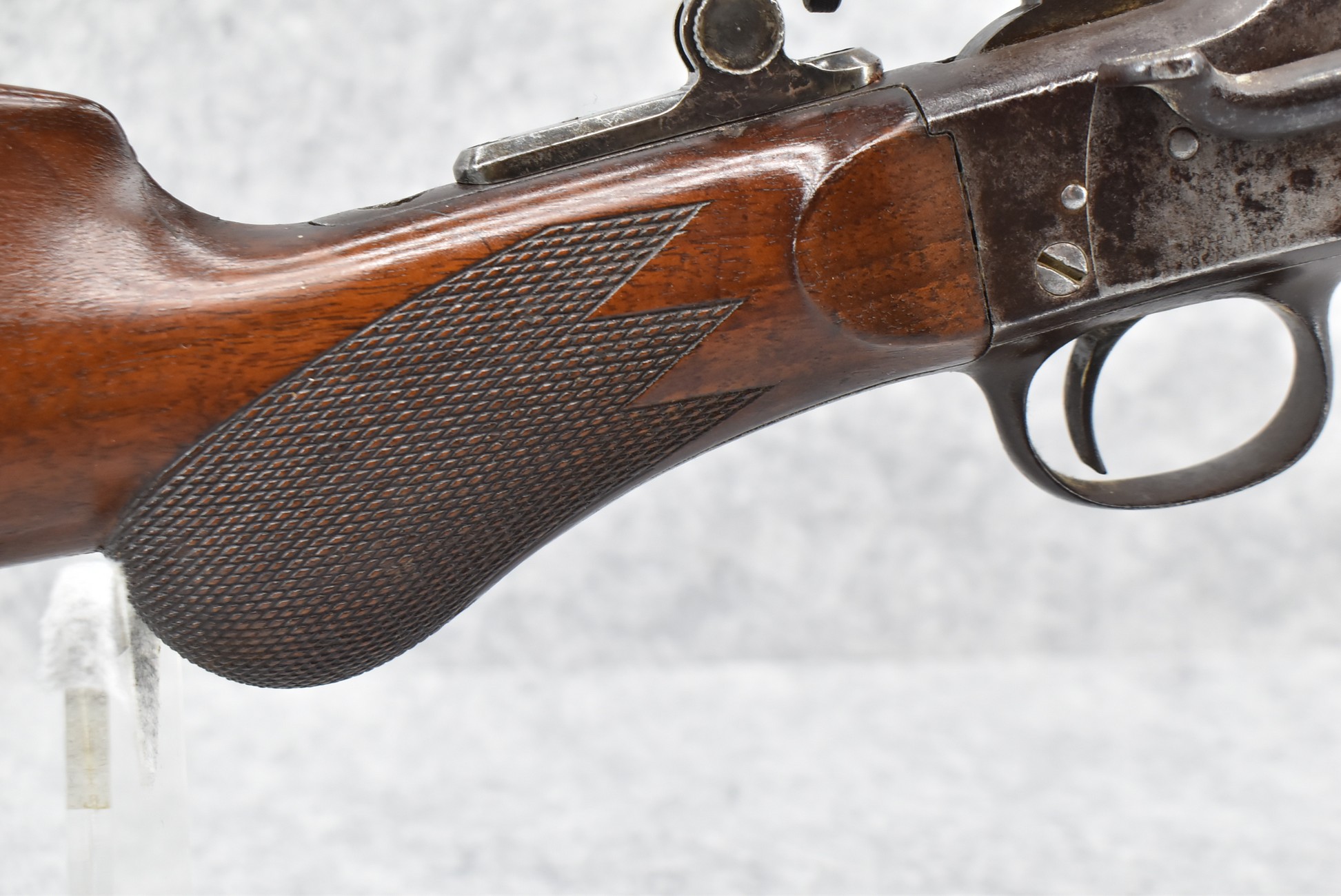 75. Remington – Mod. Remington-Hepburn No. 3 Target Rifle – 45-70 Cal. Single Shot Breech Load Rifle – w/30” Heavy Octagon Barrel w/Target Globe Front w/Level & Wind Adj. & Sporting Rear Sights – Blued/Gray Finish – w/Checkered Round Knob Pistol Grip Wood Butt Stock w/Matching Wood Smooth Forearm w/Metal Forend Tip w/Metal Butt Plate – w/Long Ragne Fine Adj. Veneer Peep Tang Sight