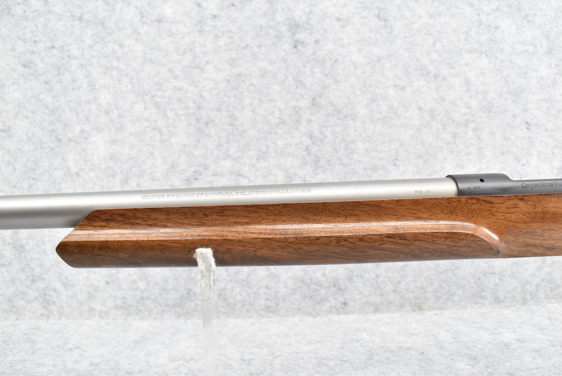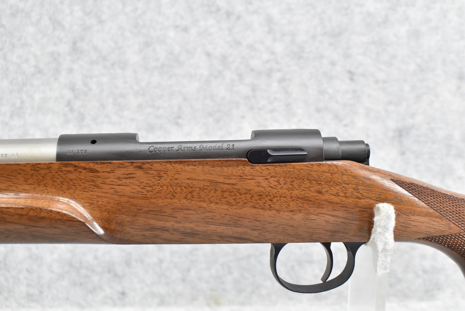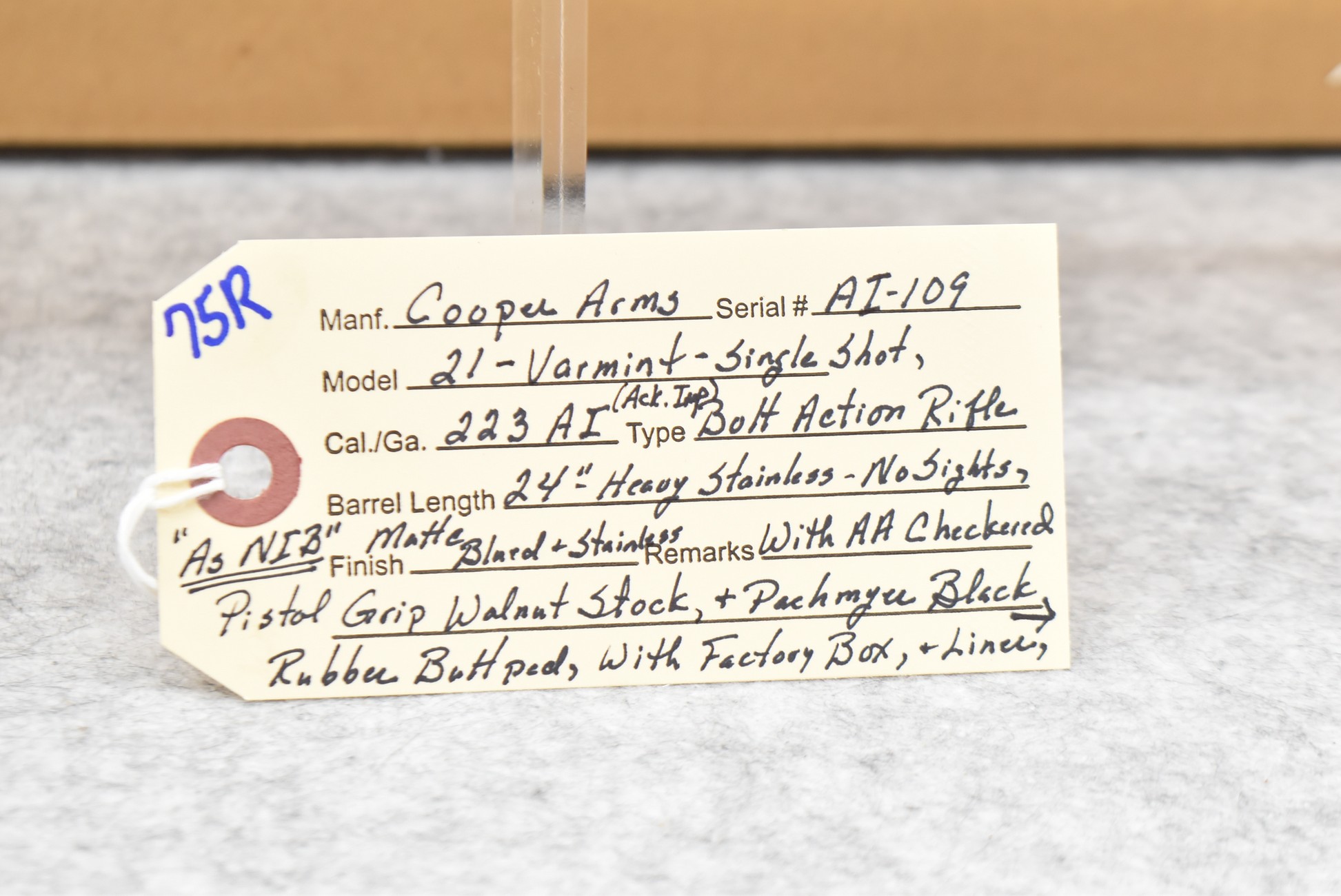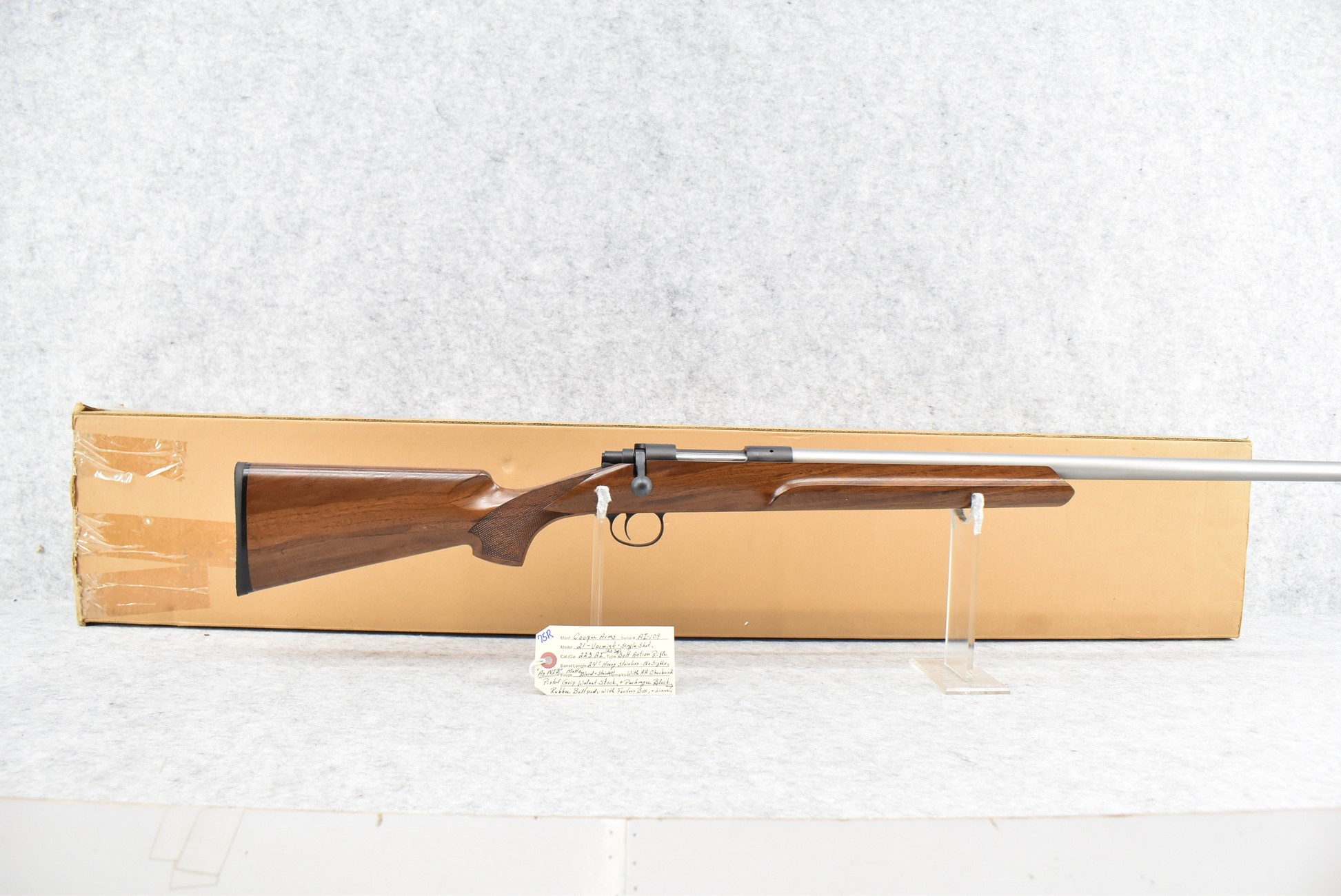 75R. Cooper Arms – Mod. 21 Varmint – 223 Ack. Imp. Cal. Bolt Action Single Shot Rifle – w/24” Heavy Stainless Barrel – Matte Blued/Stainless Finish – w/AA Checkered Pistol Grip Walnut Stock w/Pachmayr Butt Pad – Unfired w/Factory Box & Liner