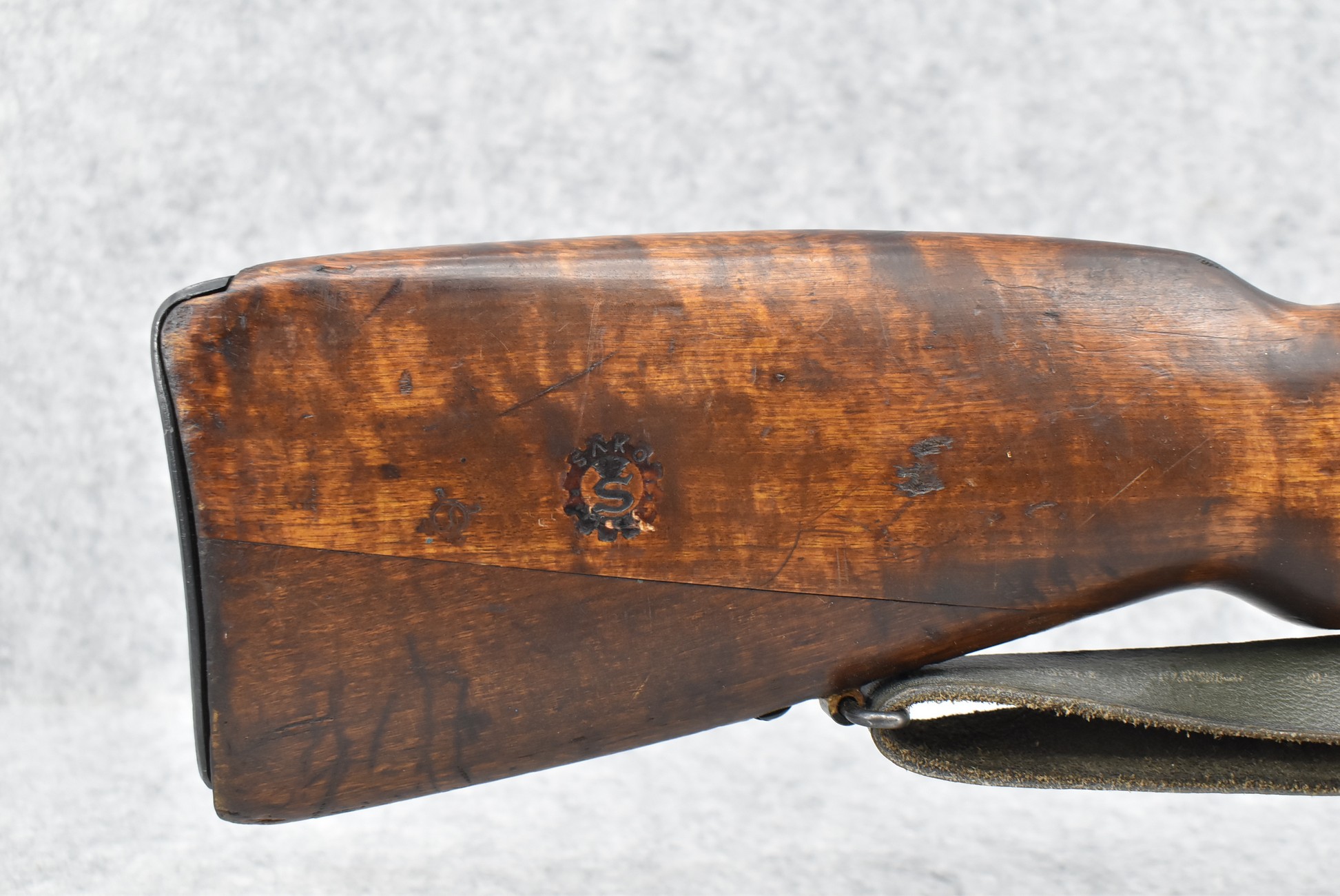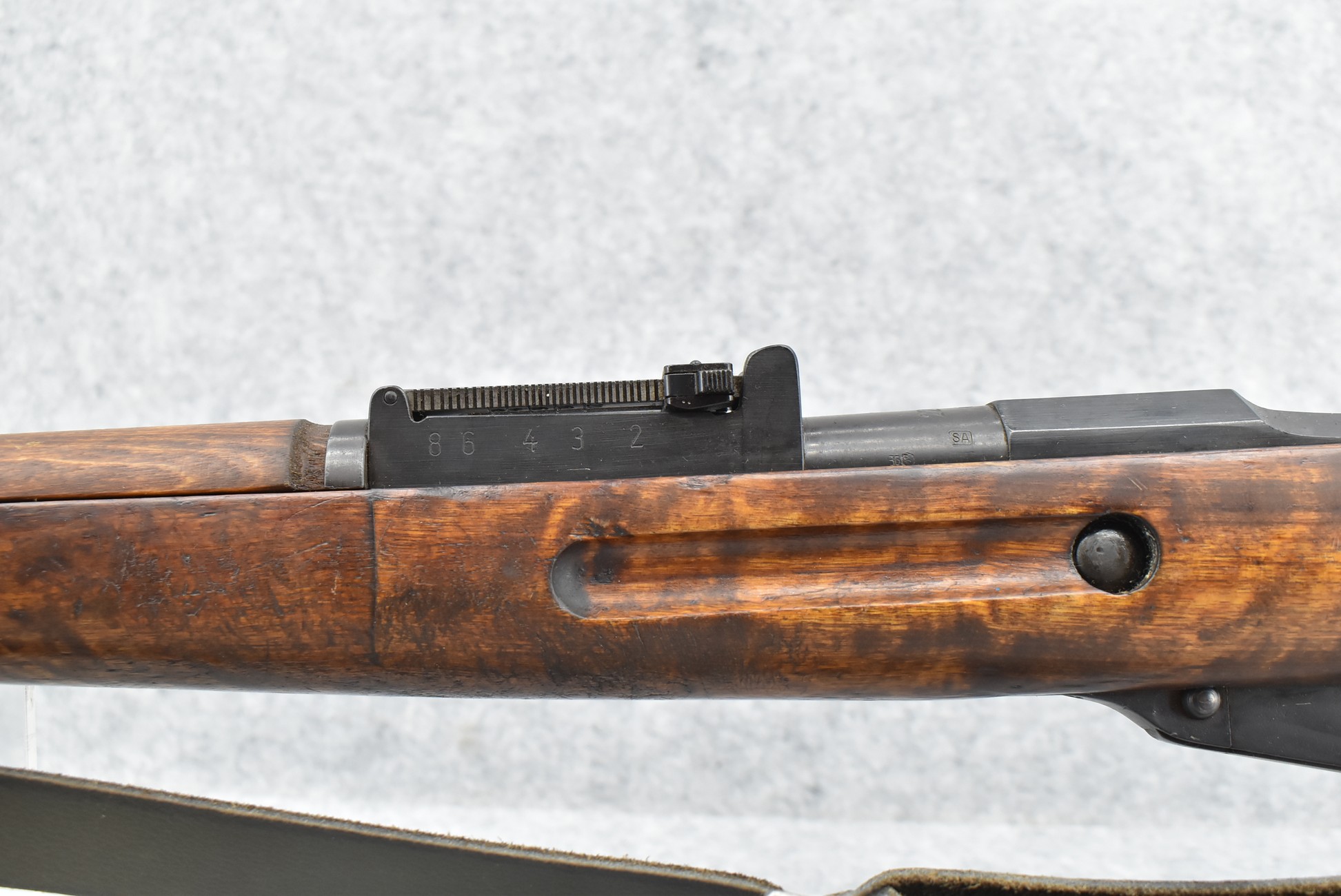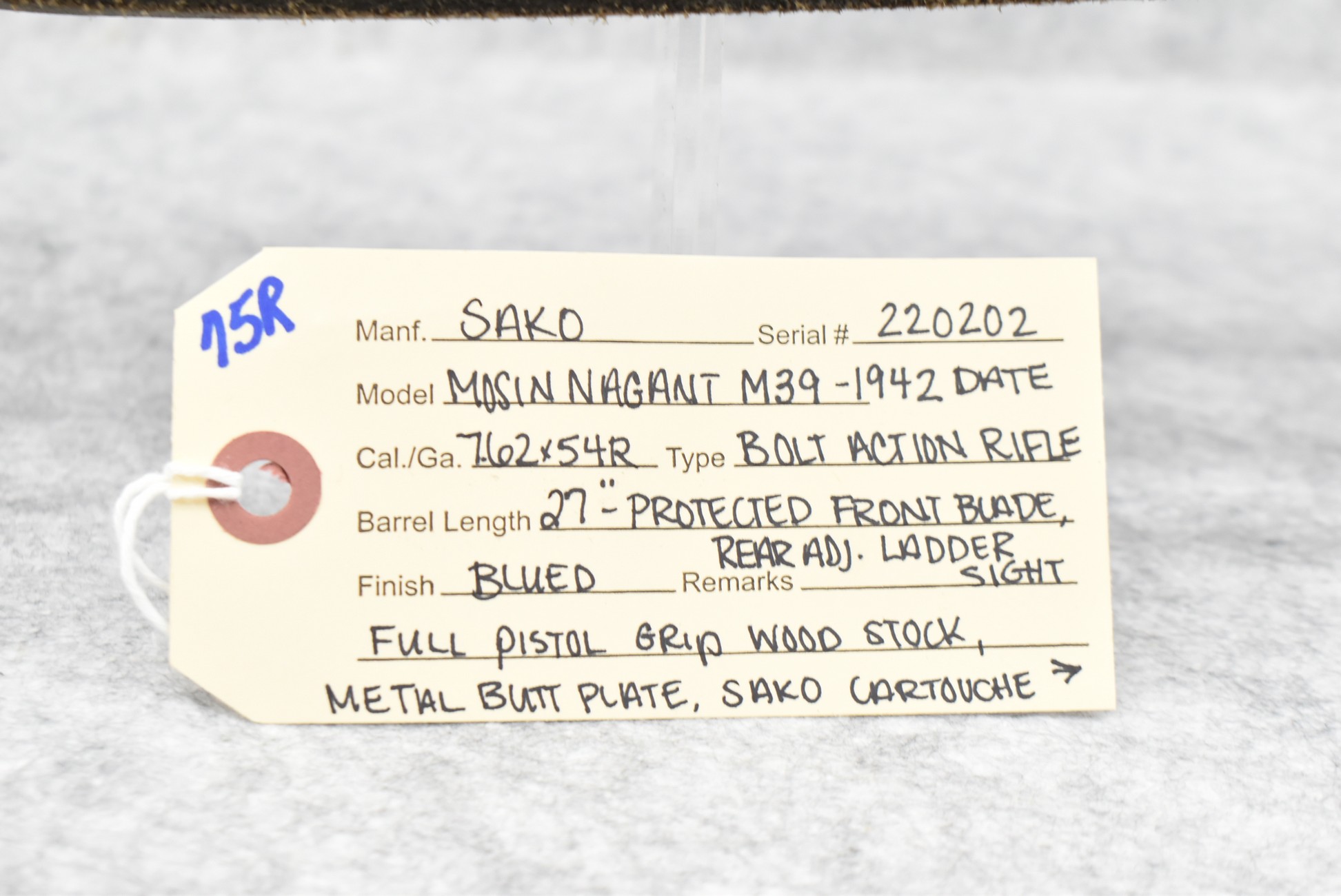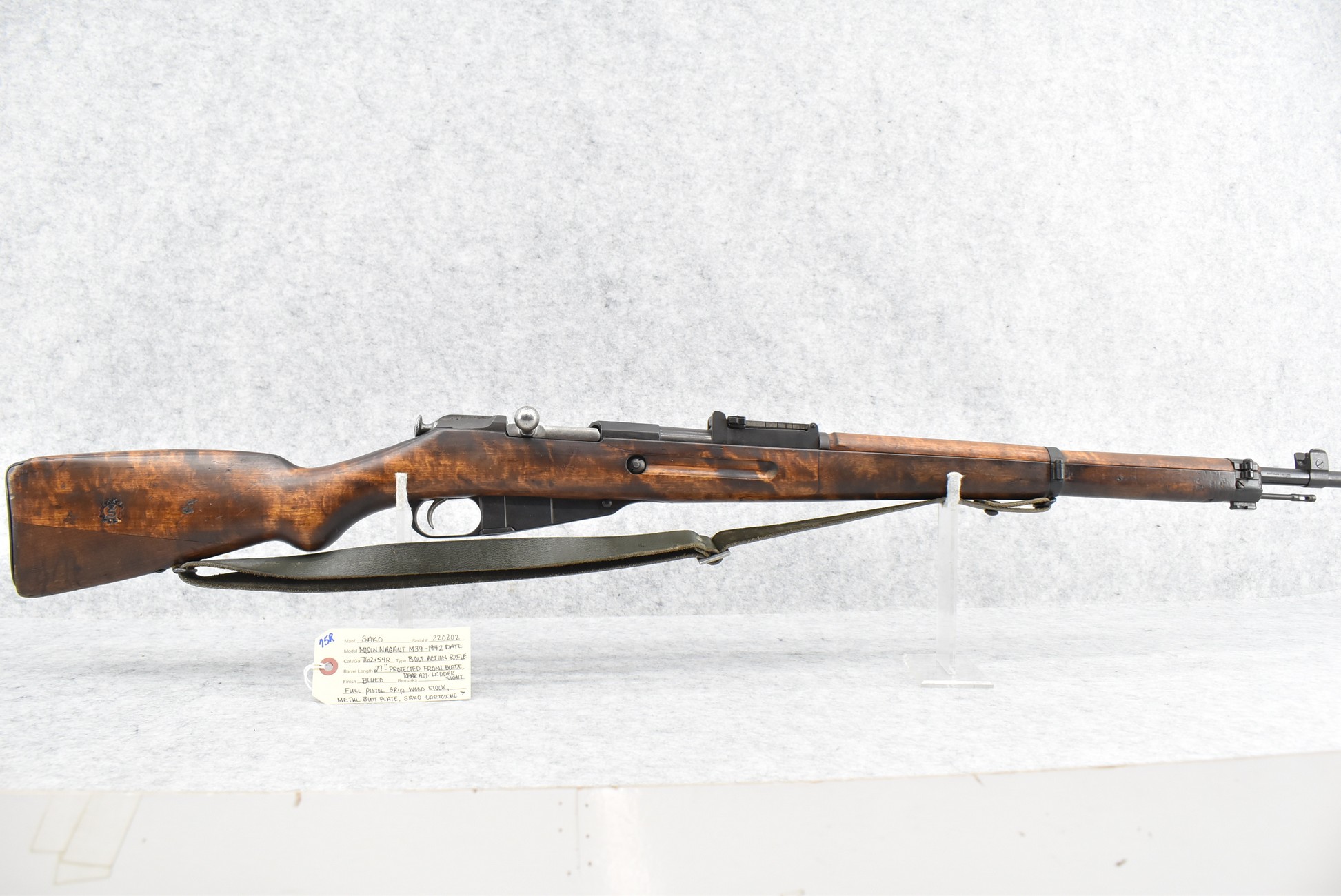 75R. Sako – Mod. Mosin Nagant – 7.62x54R Cal. Bolt Action Rifle – w/27” Barrel w/Protected Blade Front and Adjustable Rear Ladder Sights – Blued Finish – w/Full Pistol Grip Wood Stock w/Metal Butt Plate – w/Sako Cartouche – w/Cleaning Rod – w/Bayonet Lug – w/Leather Sling – Bolt Numbers Match to Gun – Import Marked – SA Marked – Dated 1942