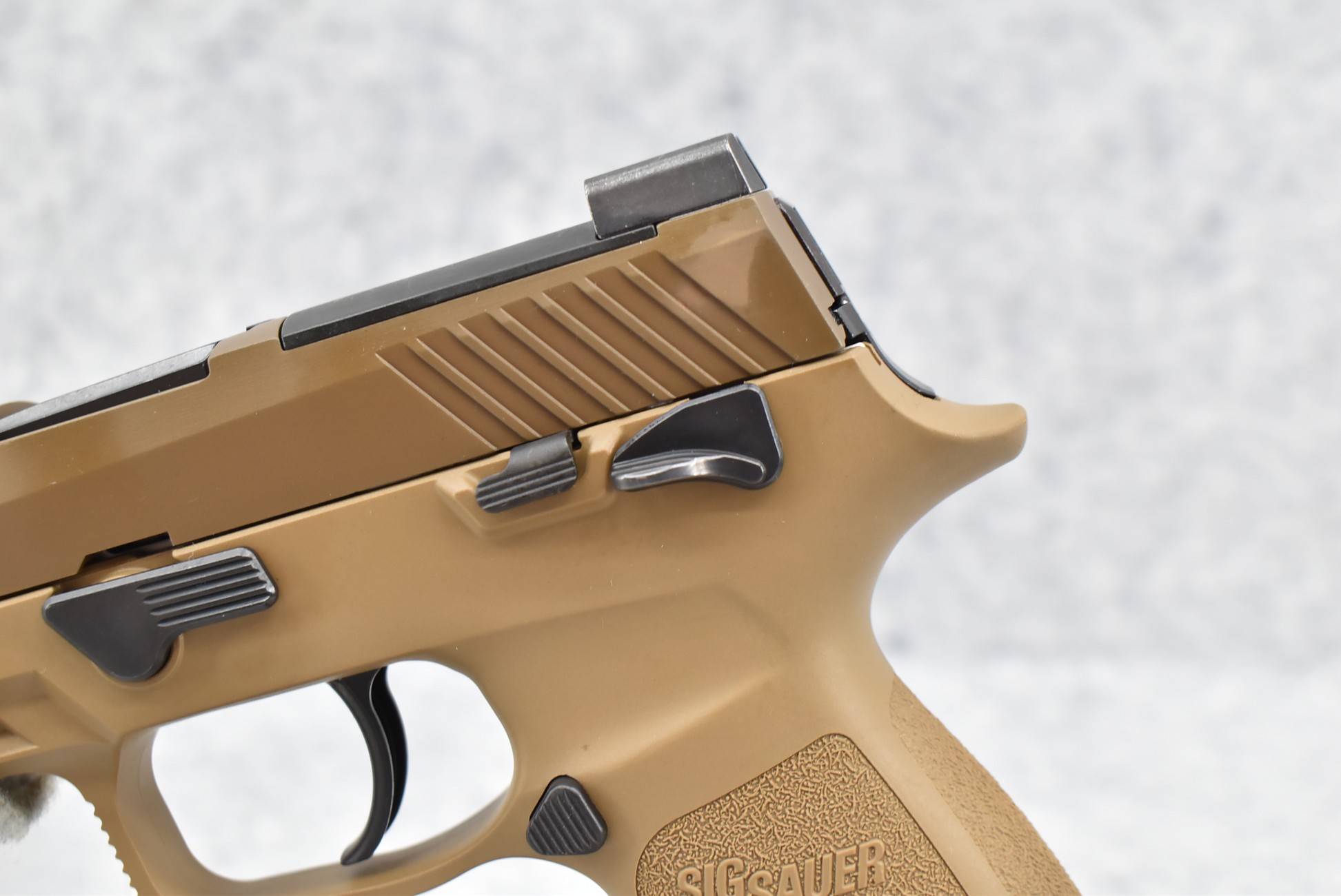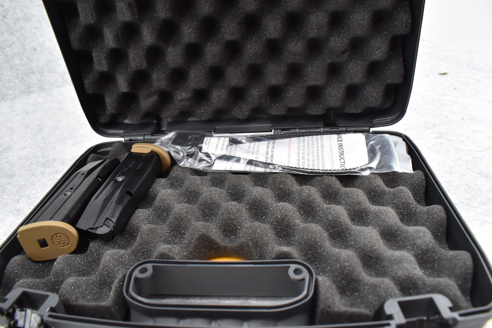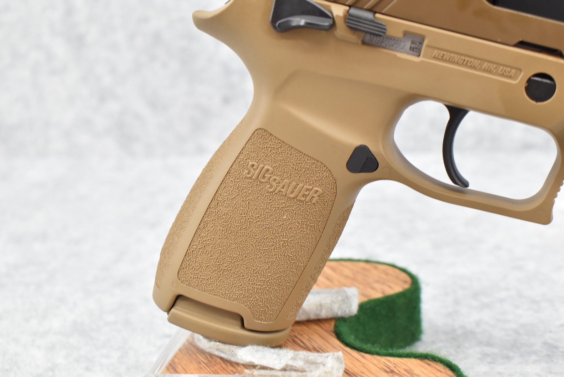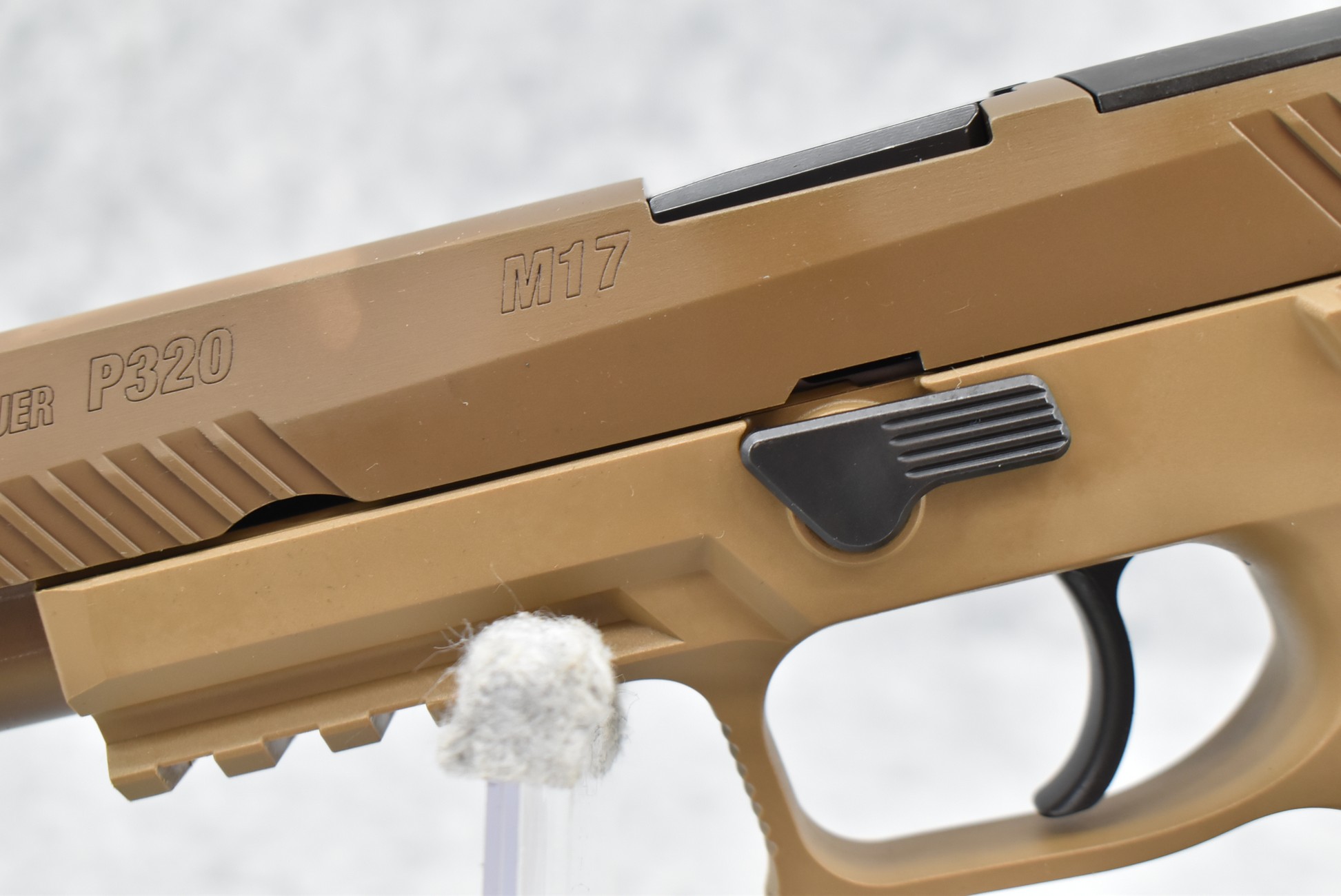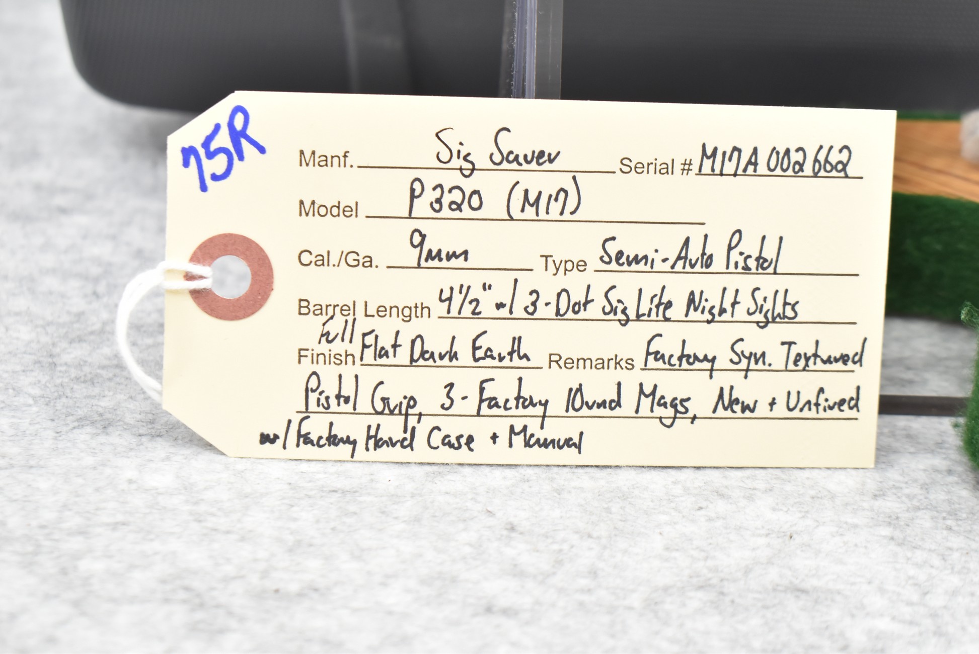 75R. Sig Sauer – Mod. P320 (M17) – 9mm Cal. Semi-Auto Pistol – w/4 ½” Barrel w/3-Dot SigLite Night Sights – Full Flat Dark Earth Finish – w/Factory Synthetic Textured Pistol Grip – w/3 Factory 10Rd Mags – New & Unfired w/Factory Hard Case & Manual