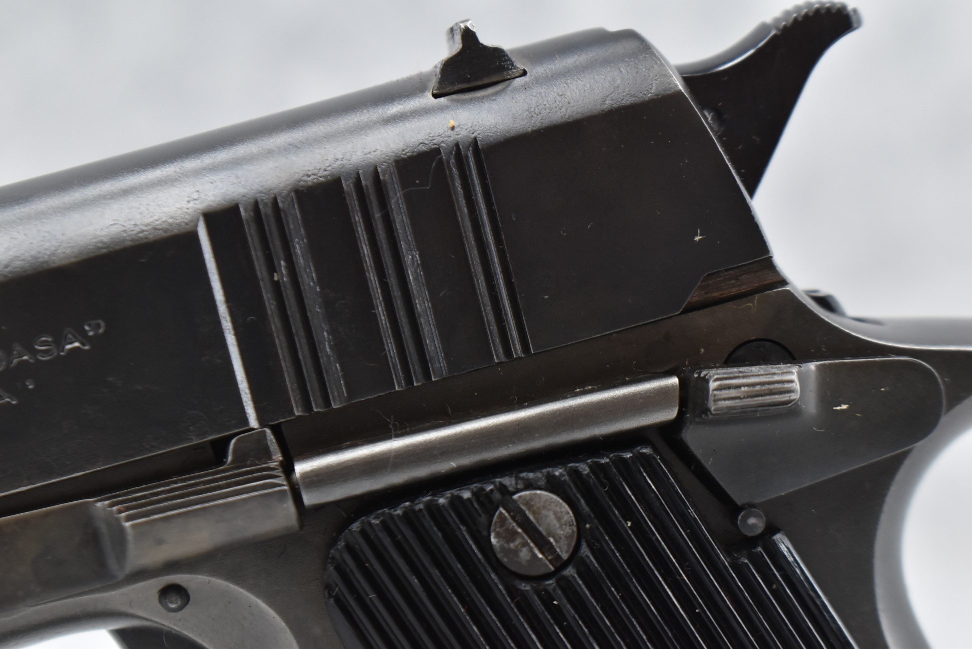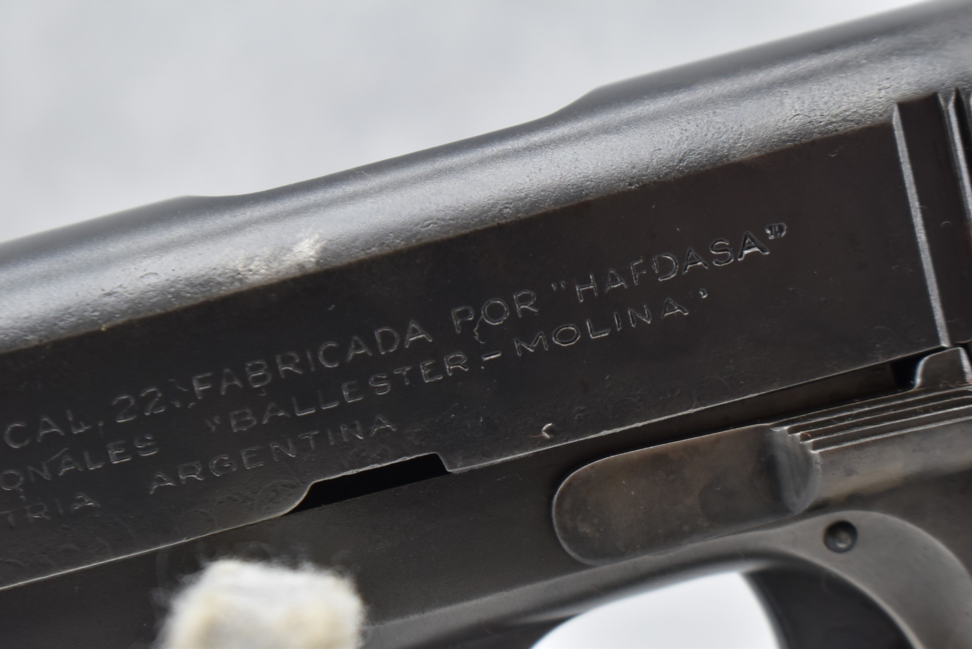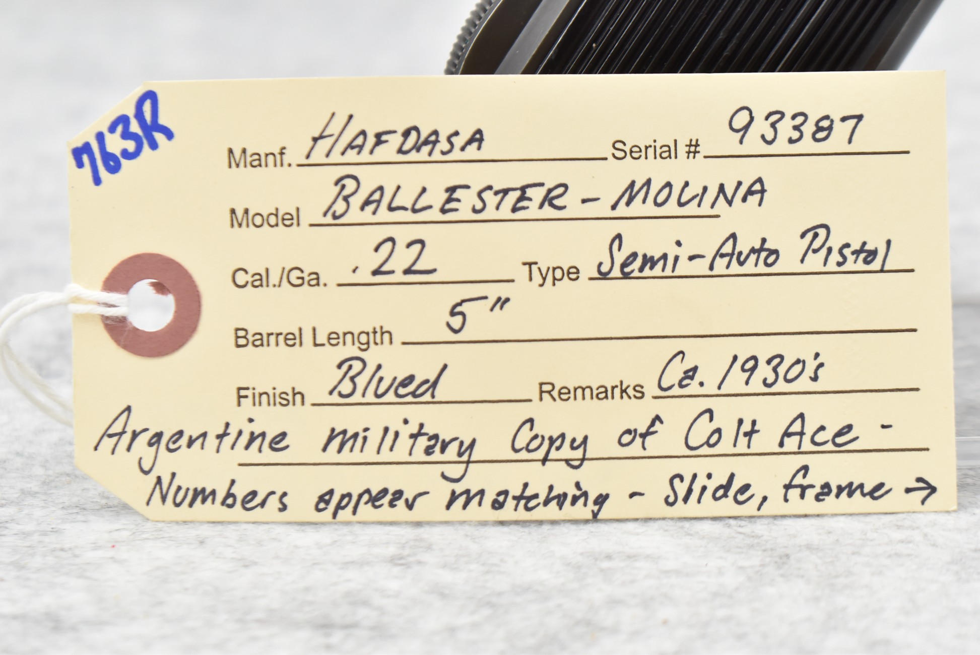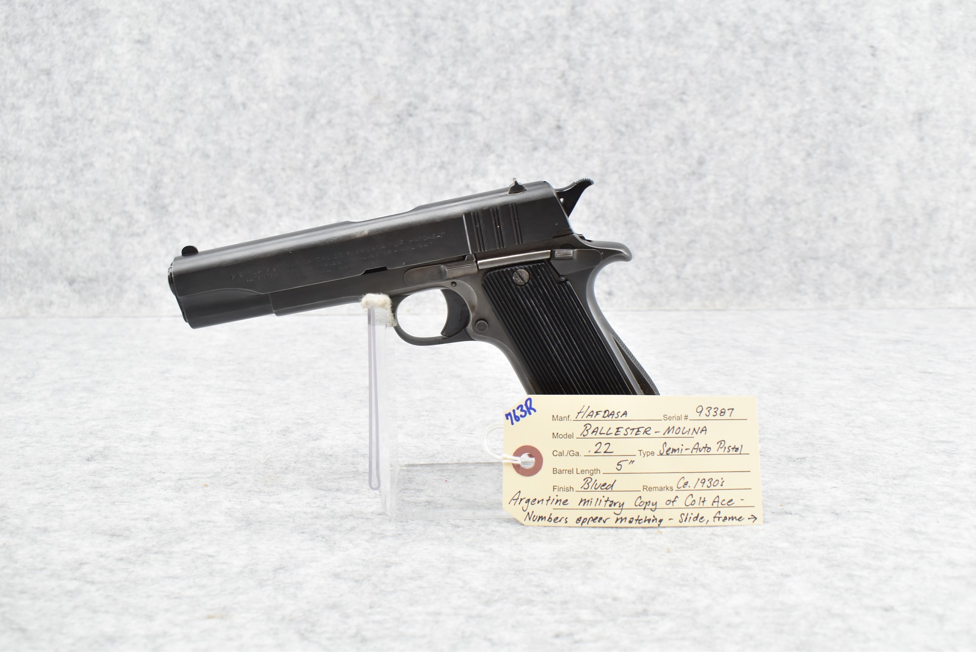 763R. Hafdasa – Mod. Ballester-Molina – 22 Cal. Semi-Auto Pistol – w/5” Barrel w/Sights – Blued Finish – w/Factory Grips – w/Original Mag – Numbers Appear Matching (Frame, Slide & Barrel) – Circa 1930’s Argentine Military Copy of Colt Ace
