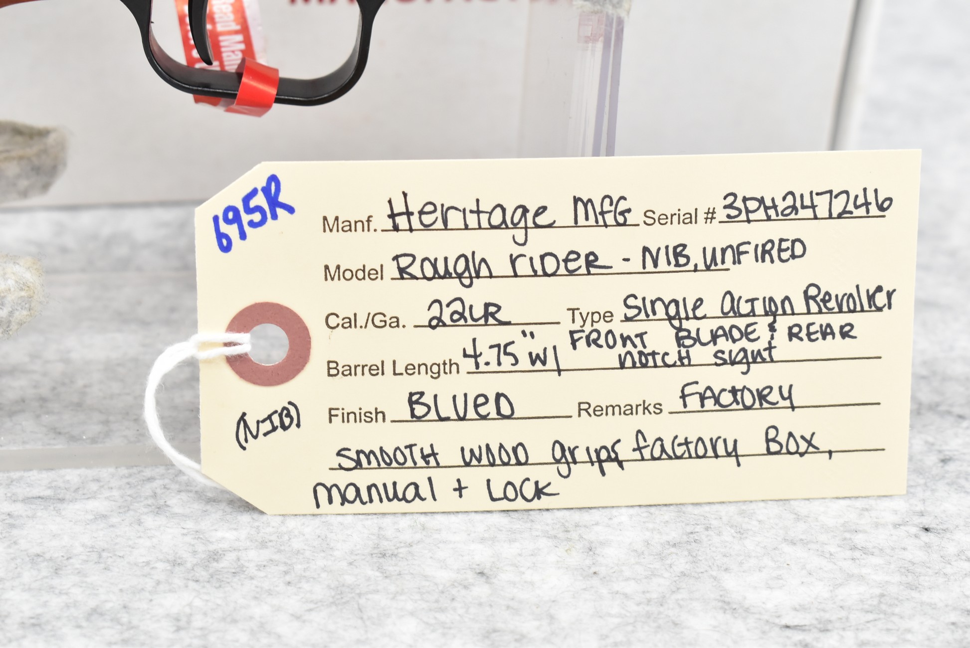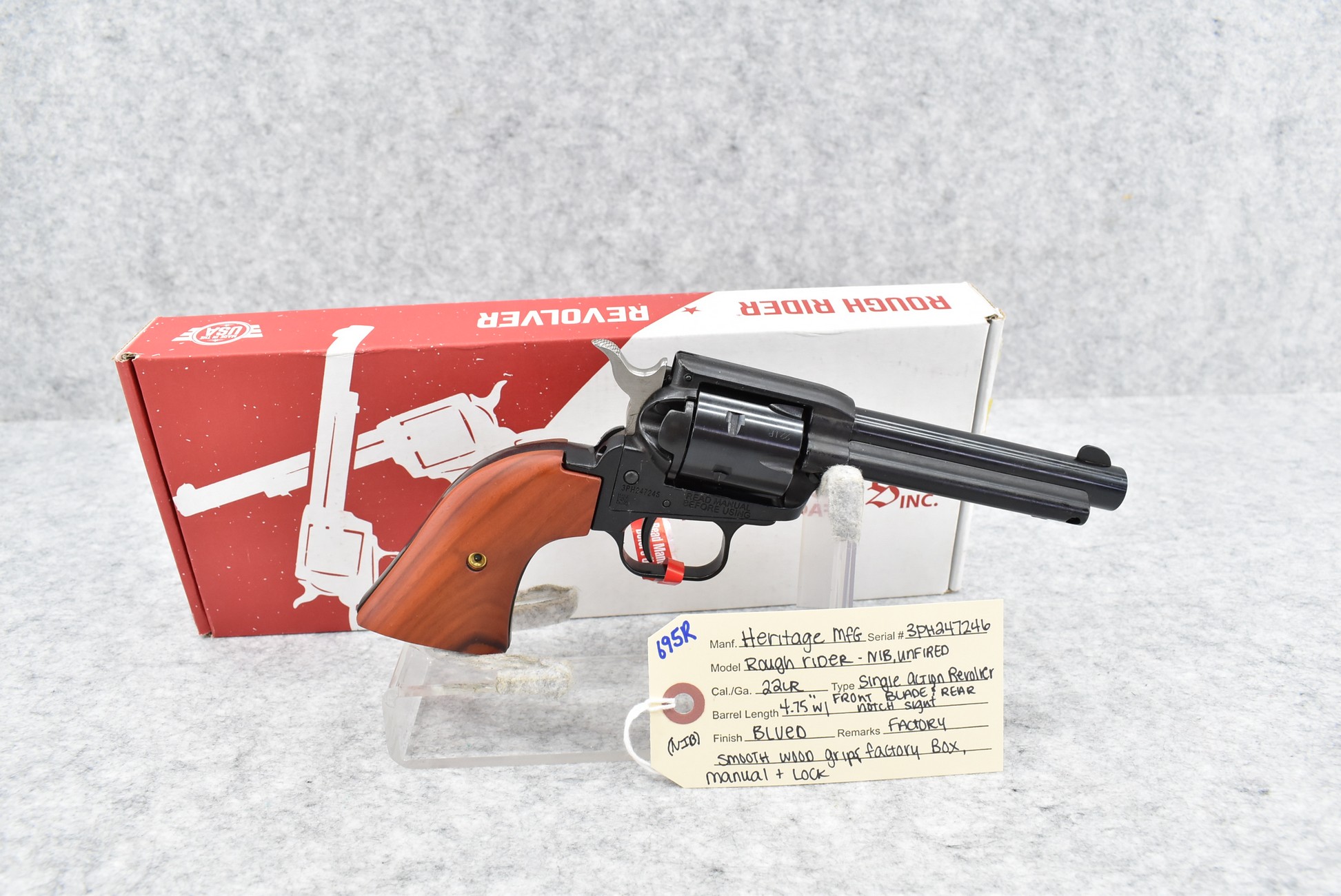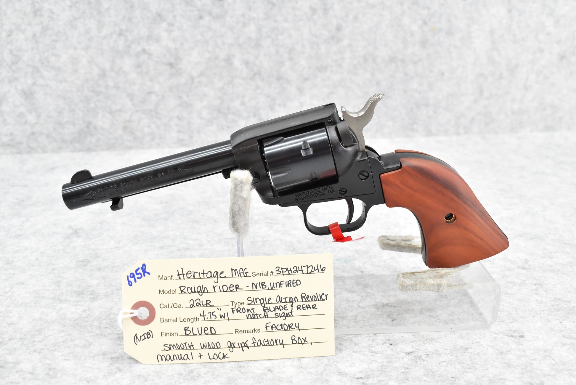 695R. Heritage Mfg. – Mod. Rough Rider – 22LR Cal. Single Action Revolver – w/4.75” Barrel w/Front Blade & Rear Notch Sights – Blued Finish – w/Factory Smooth Wood Grips – New w/Factory Box & Manual