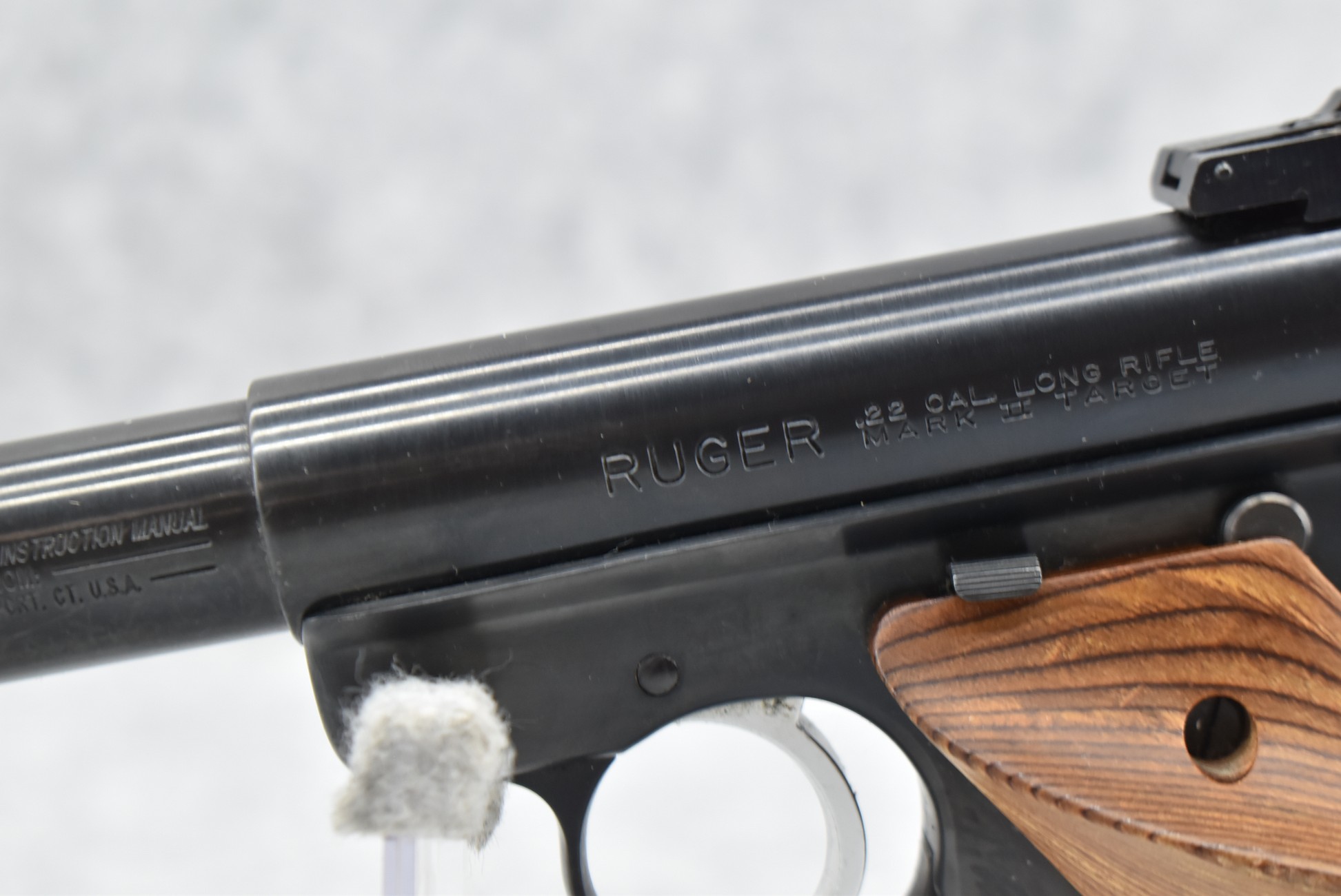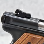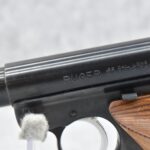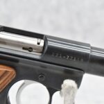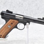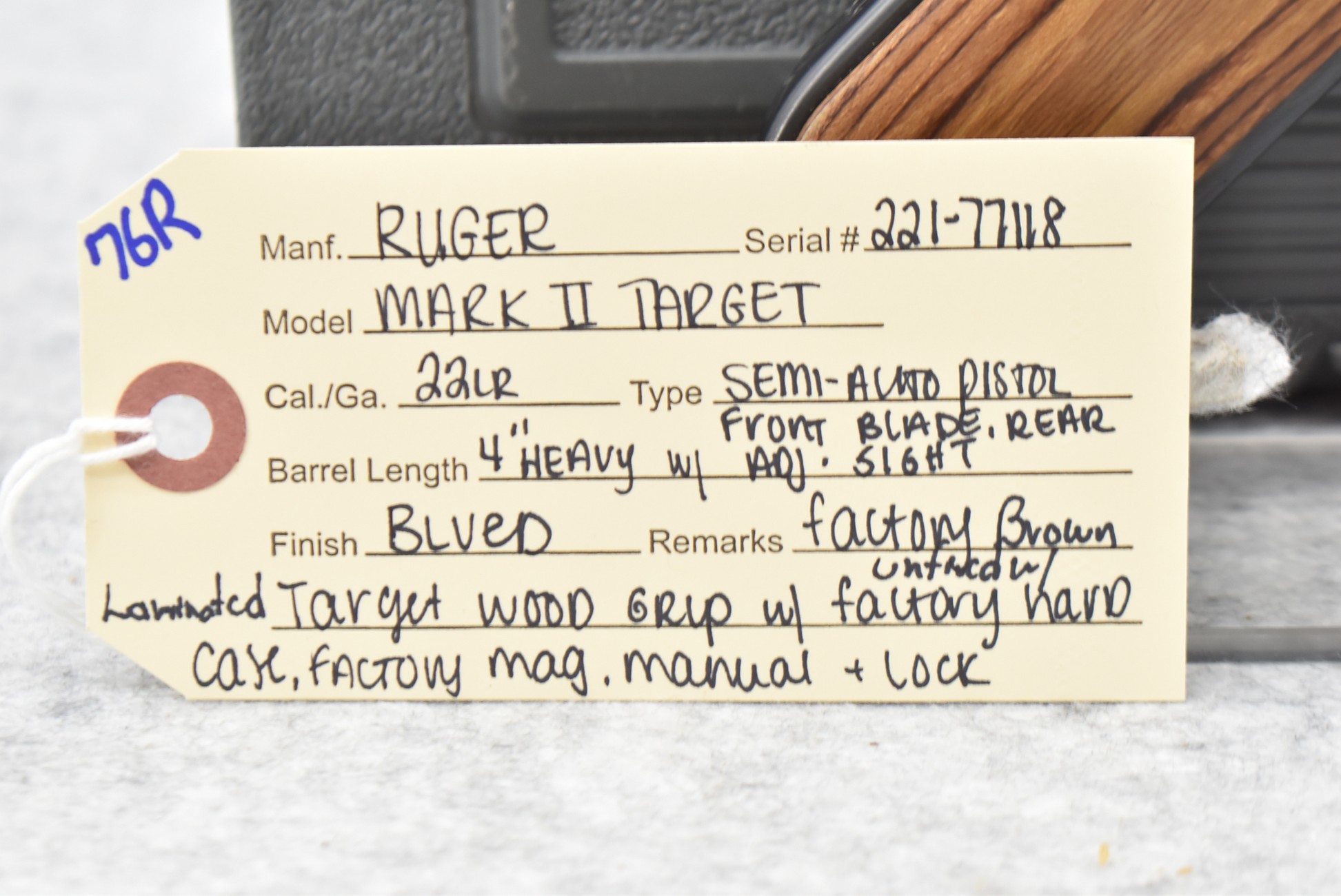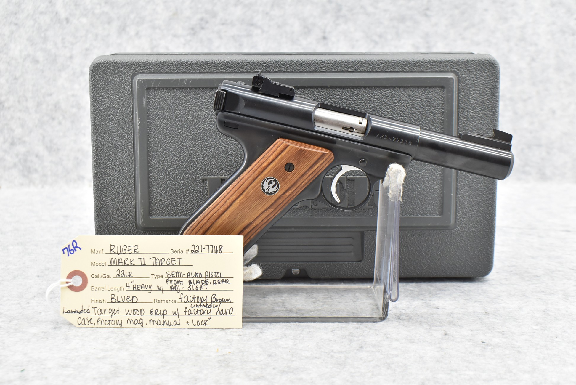 76R. Ruger – Mod. Mark II Target – 22LR Cal. Semi-Auto Pistol – w/4” Heavy Barrel w/Blade Front and Adjustable Rear Sights – Blued Finish – w/Factory Brown Laminated Target Wood Grip – Unfired in Factory Hard Case w/Factory Magazine and Manual