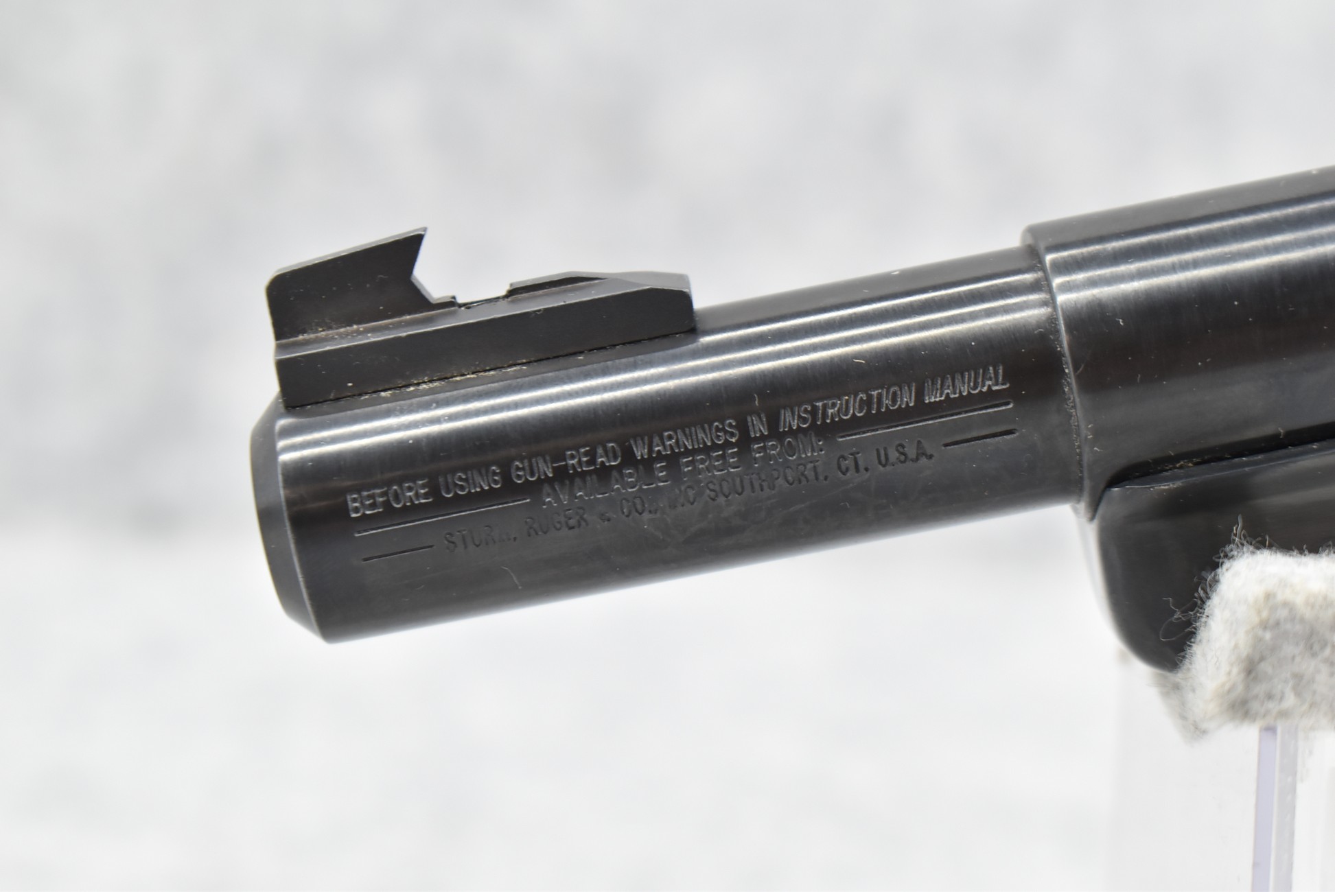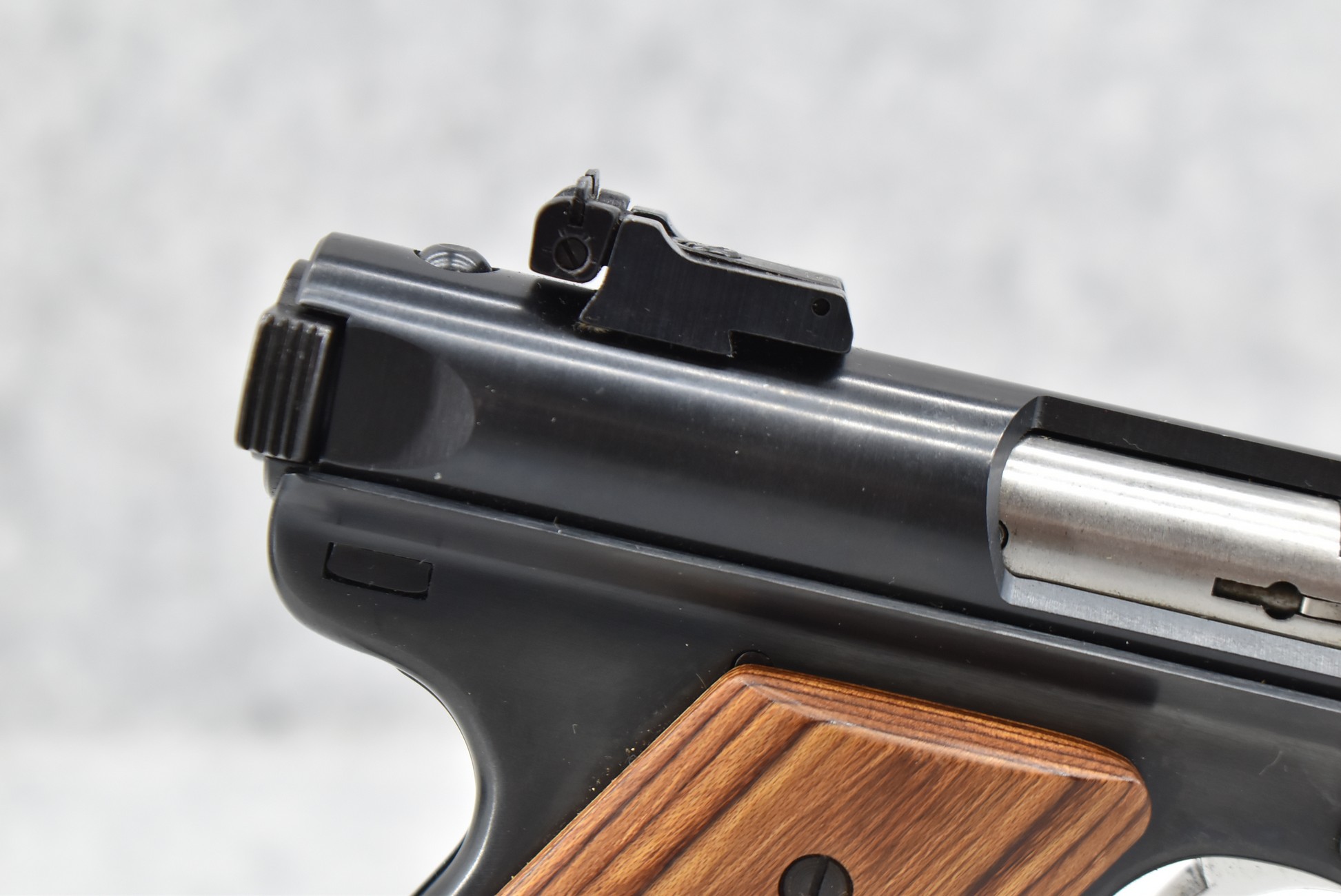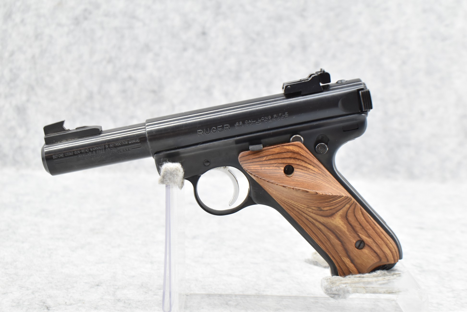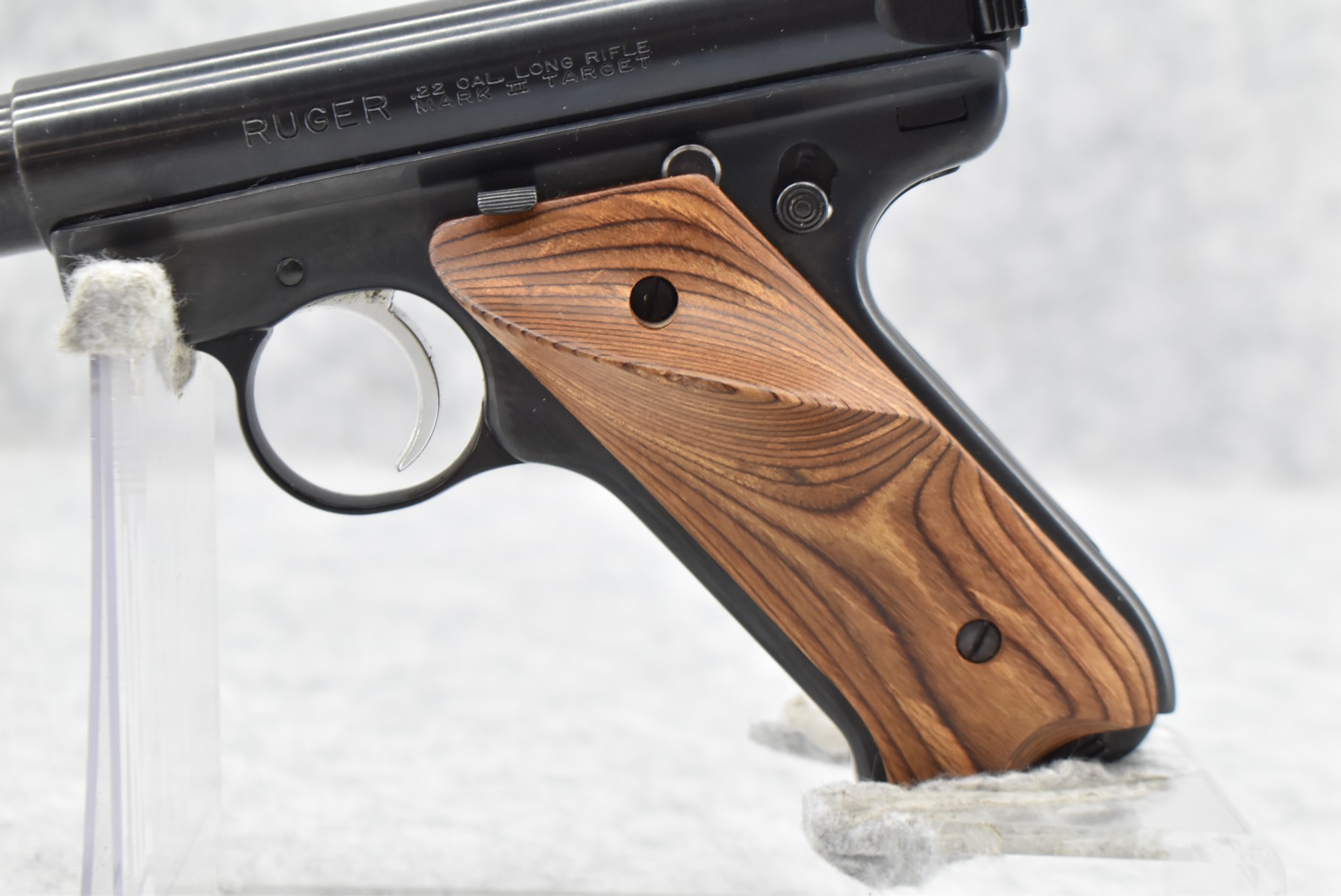 76R. Ruger – Mod. Mark II Target – 22LR Cal. Semi-Auto Pistol – w/4” Heavy Barrel w/Blade Front and Adjustable Rear Sights – Blued Finish – w/Factory Brown Laminated Target Wood Grip – Unfired in Factory Hard Case w/Factory Magazine and Manual