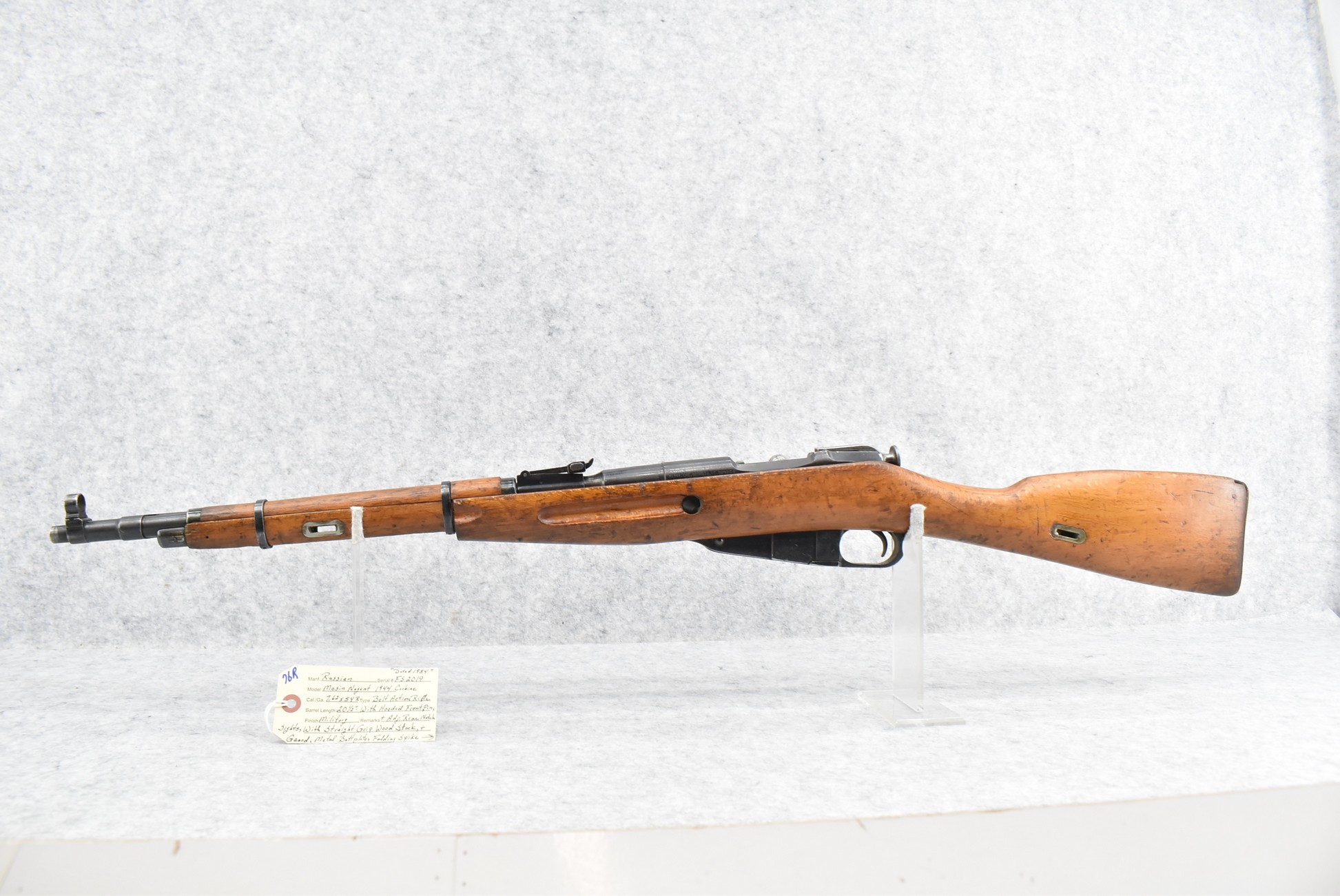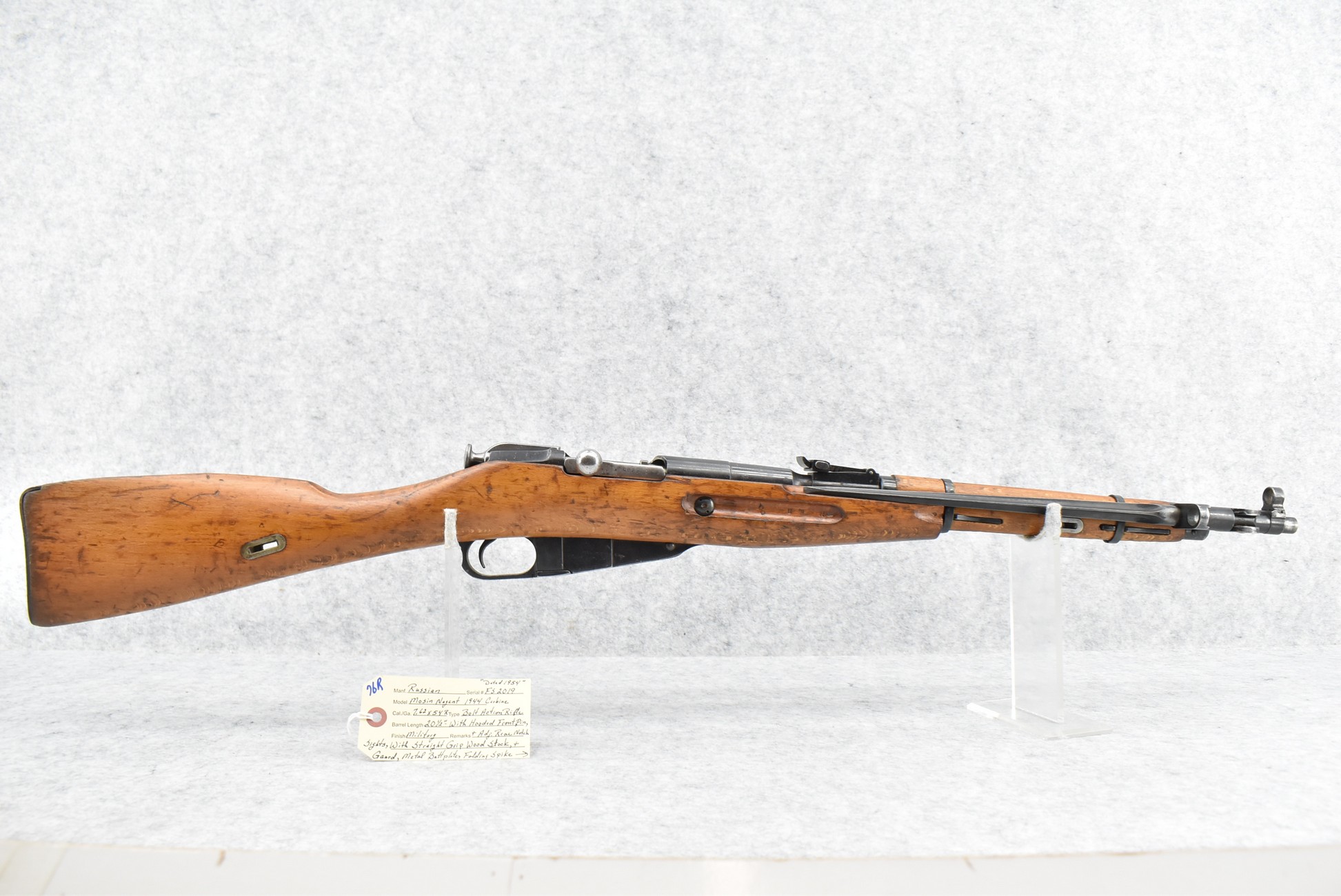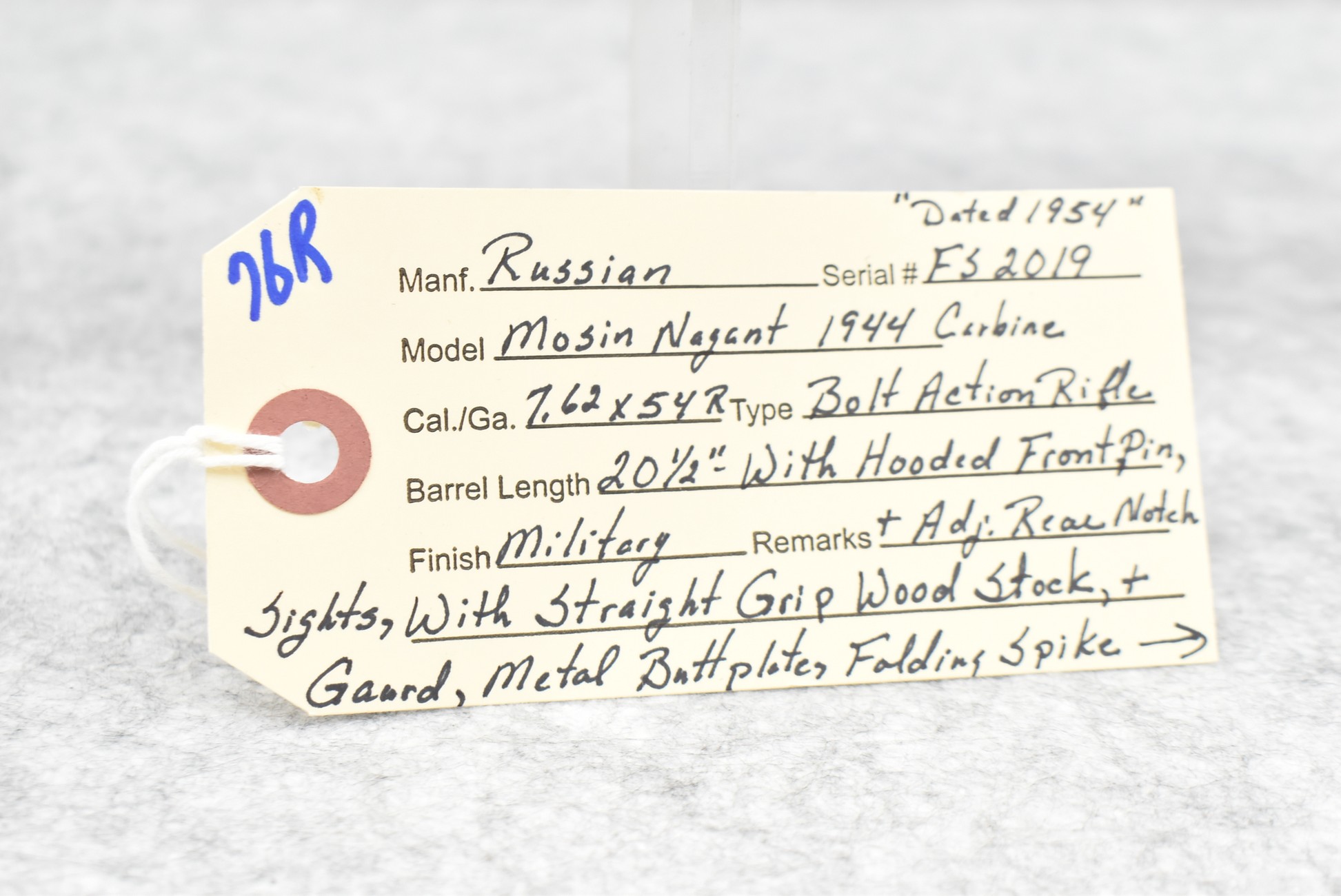 76R. Russian – Mod. Mosin Nagant 1944 Carbine – 7.62x54R Cal. Bolt Action Rifle – w/20½” Barrel w/Hooded Pin Front and Adjustable Rear Notch Sights – Military Finish – w/Straight Grip Wood Stock and Guard w/Metal Butt Plate – w/Folding Spike Bayonet – Import Marked – Dated 1954