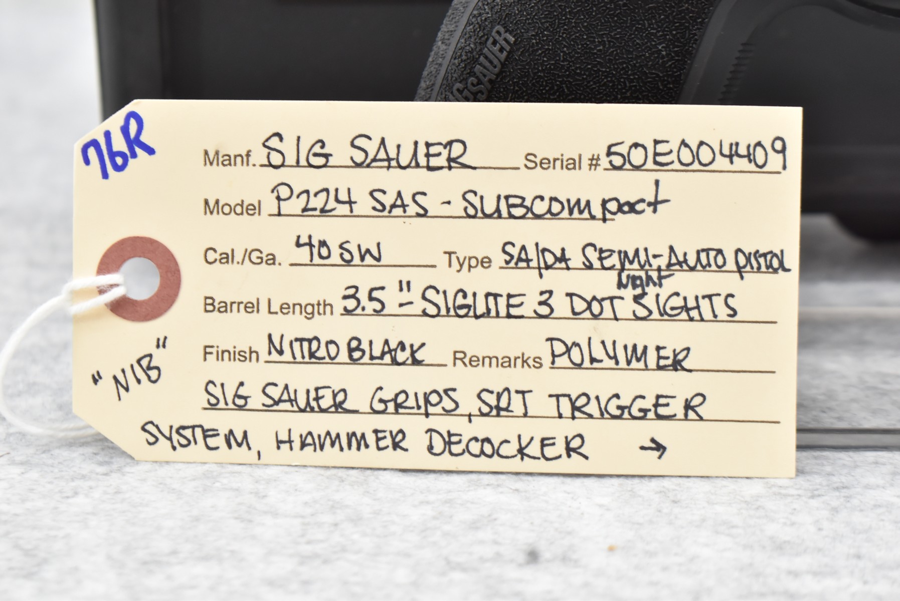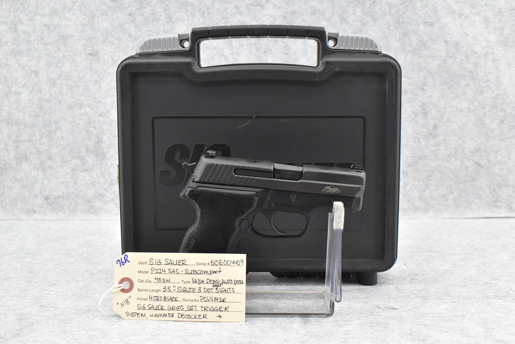 76R. Sig Sauer – Mod. P224 SAS-Subcompact – 40 S&W Cal. Semi-Auto Pistol – w/3.5” Barrel w/3-Dot Night Sights – Nitro Black Finish – w/Polymer Sig Sauer Grips – w/SRT Trigger System – w/Hammer Decocker – w/2 Sig Sauer 10Rd Mags – New w/Factory Box, Manuals & Lock