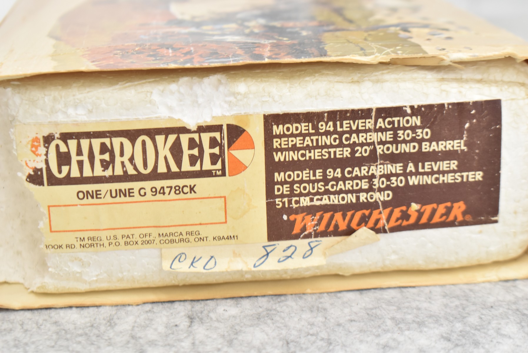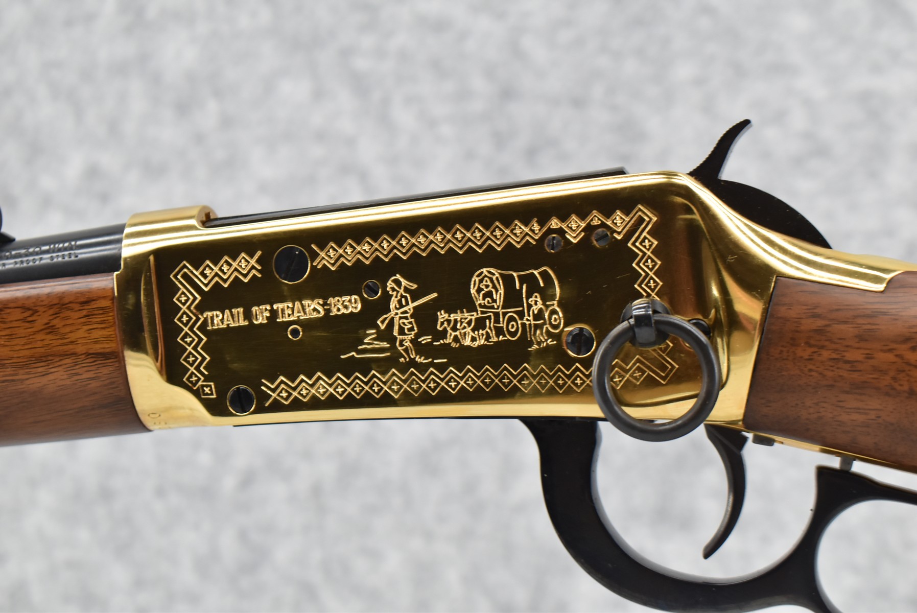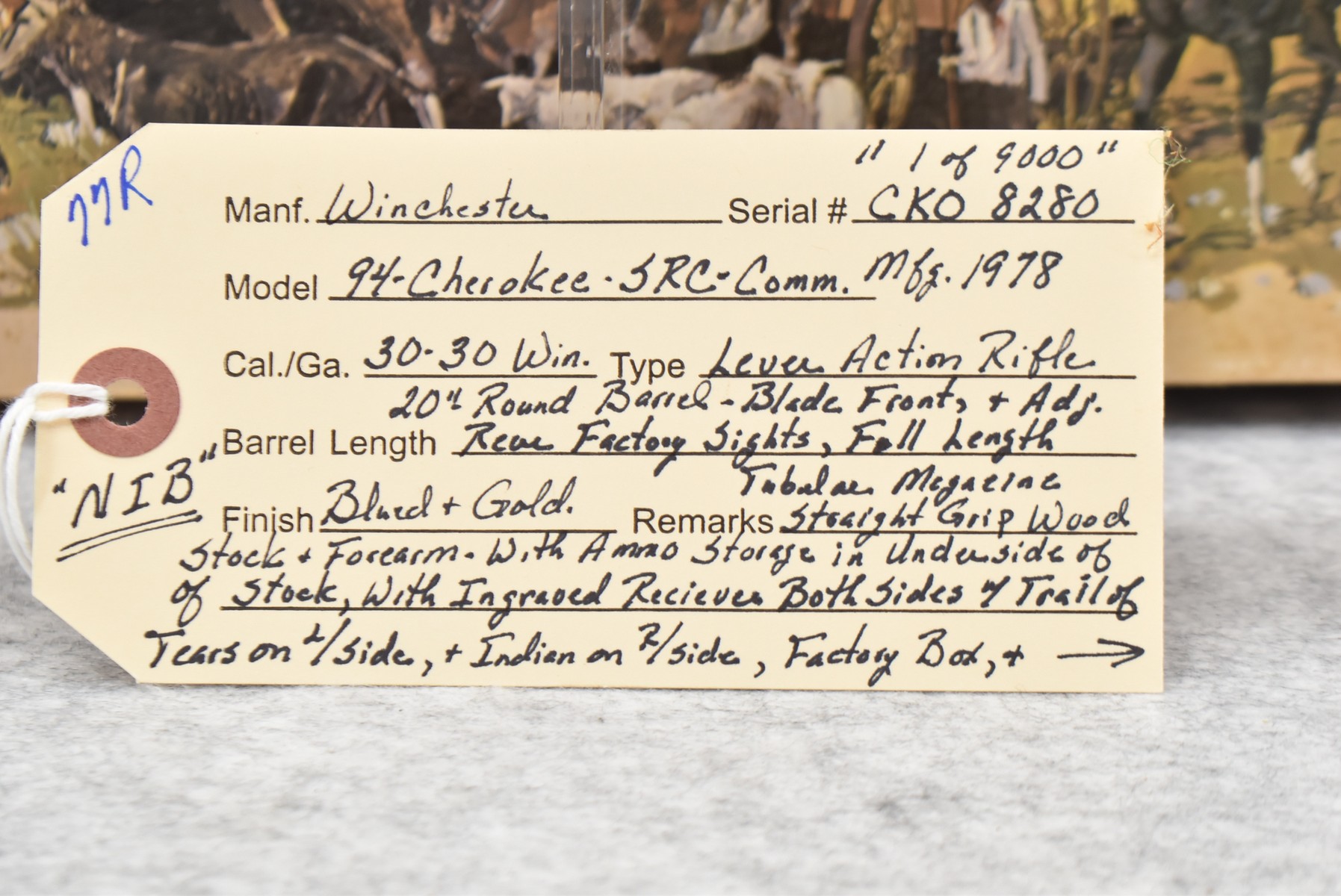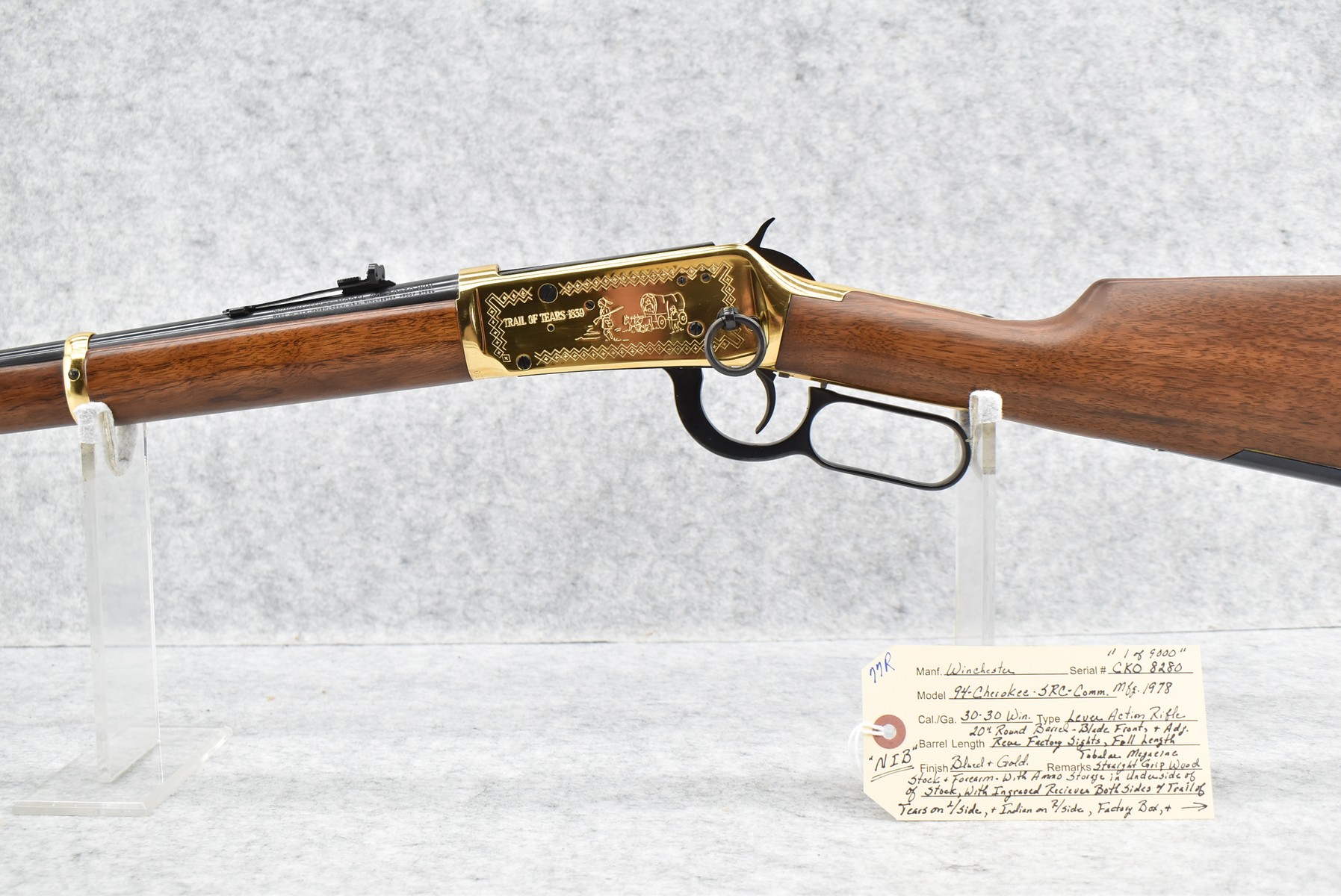 77R.       Winchester – Mod. 94 Saddle Ring Carbine “Cherokee” Commemorative – 30-30 Win. Cal. Lever Action Rifle – w/20” Round Barrel w/Blade Front & Adj. Rear Factory Sights w/Full Length Tubular Magazine – Blued & Gold Finish – w/Engraved Receiver on Both Sides w/Trail of Tears on Left Side & Indian on Right Side – w/Straight Grip Wood Stocks w/Ammo Storage in Underside of Stock – New w/Factory Box, Sleeve & Booklet – 1 of 9,000, Mfg. in 1978