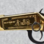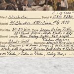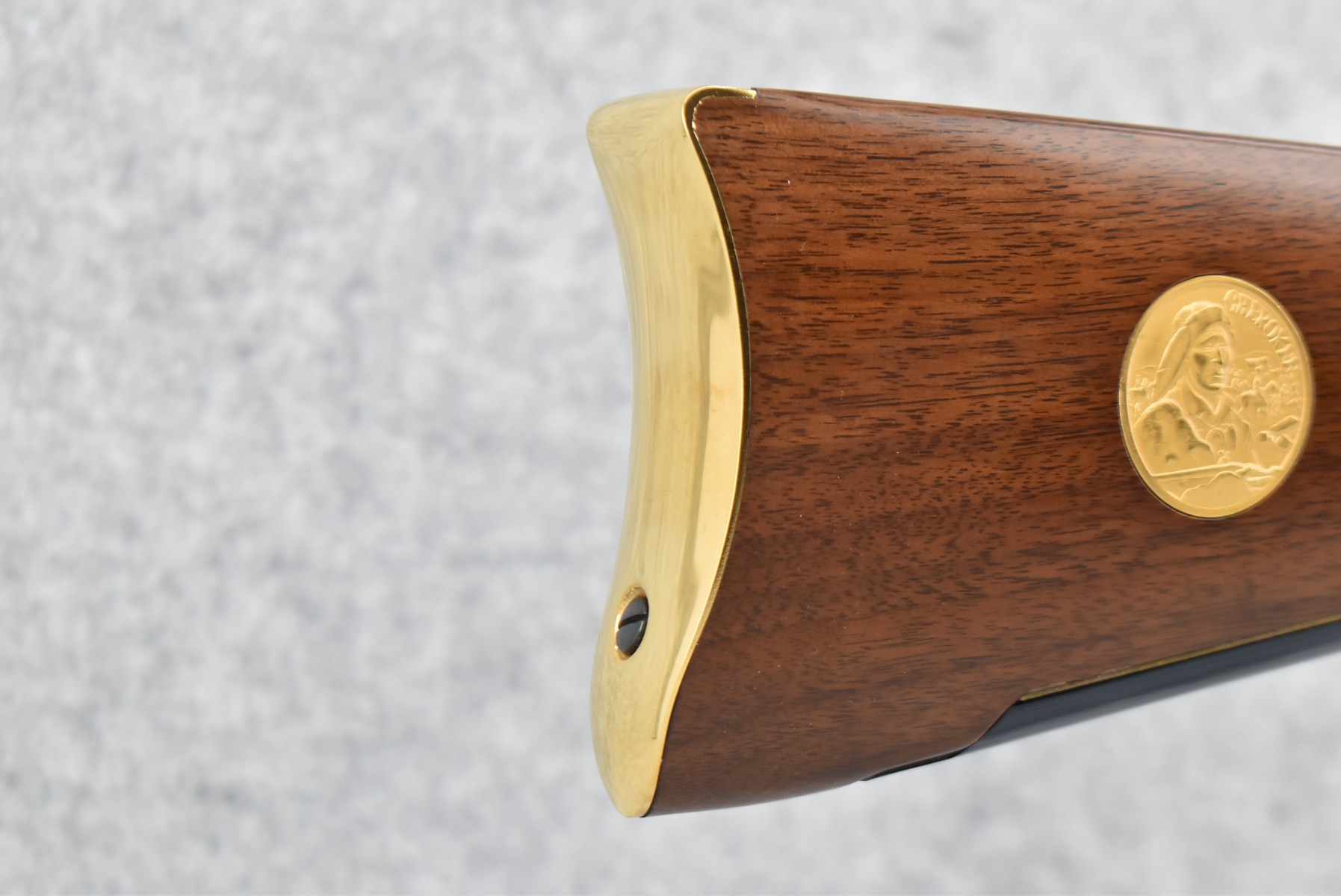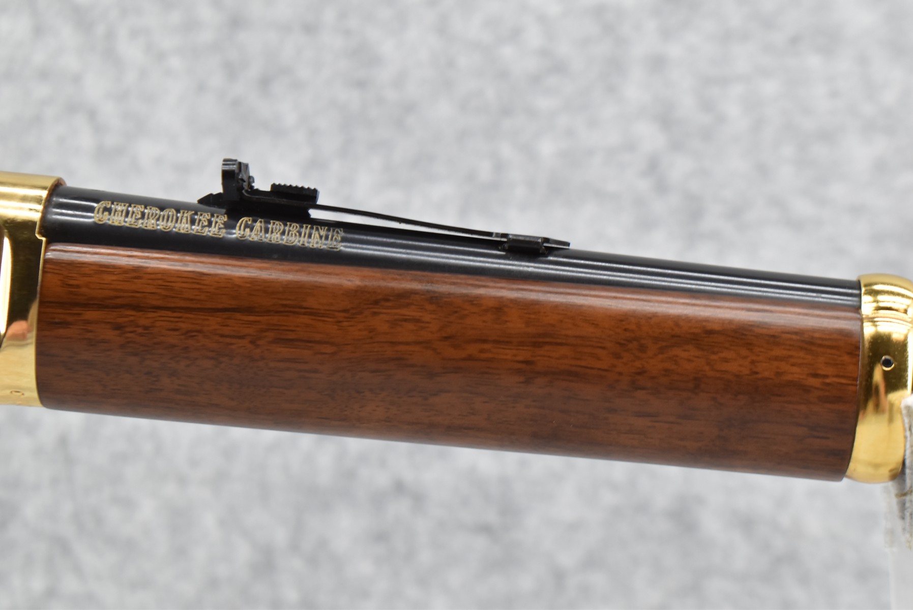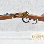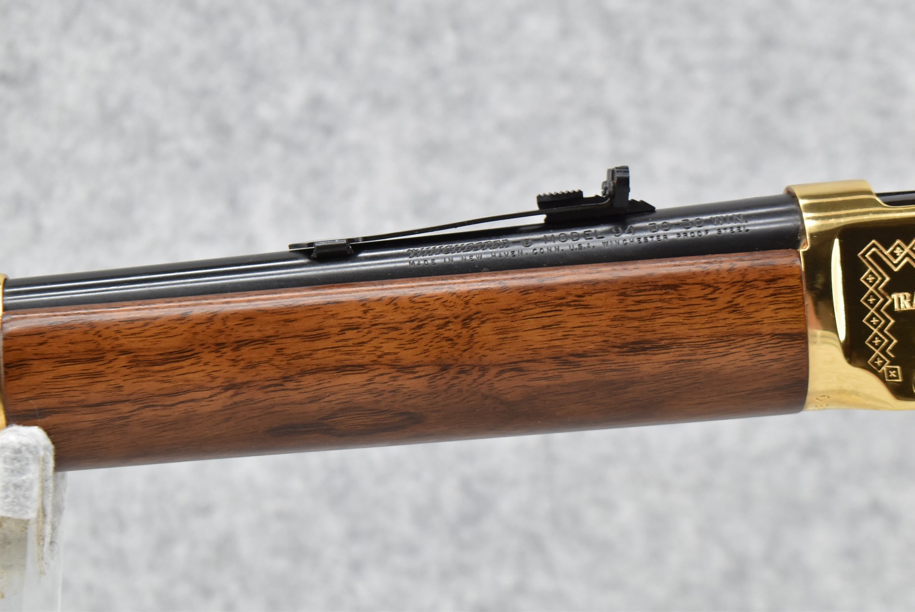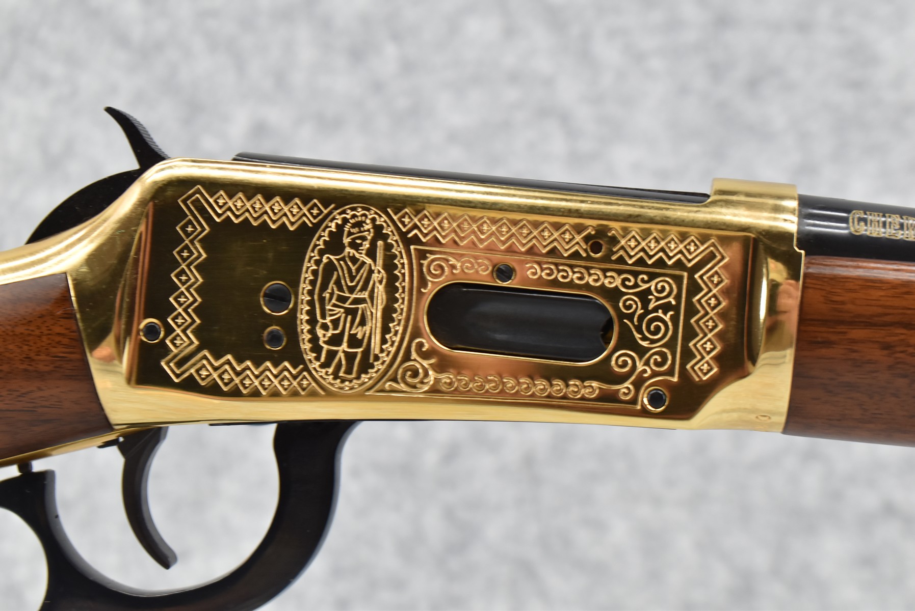 77R.       Winchester – Mod. 94 Saddle Ring Carbine “Cherokee” Commemorative – 30-30 Win. Cal. Lever Action Rifle – w/20” Round Barrel w/Blade Front & Adj. Rear Factory Sights w/Full Length Tubular Magazine – Blued & Gold Finish – w/Engraved Receiver on Both Sides w/Trail of Tears on Left Side & Indian on Right Side – w/Straight Grip Wood Stocks w/Ammo Storage in Underside of Stock – New w/Factory Box, Sleeve & Booklet – 1 of 9,000, Mfg. in 1978