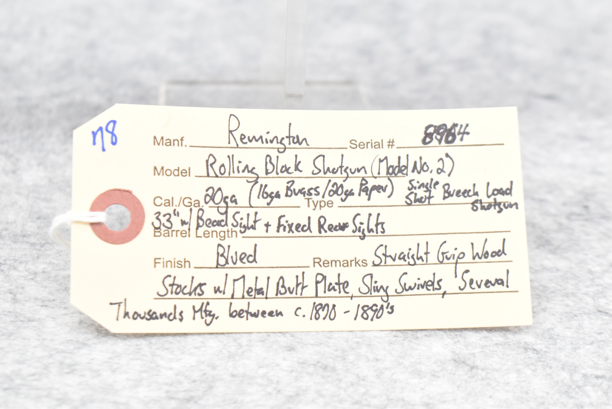 78. Remington – Mod. Rolling Block Shotgun (Model No. 2) – 20ga. (16ga. Brass/20ga. Paper) Single Shot Breech Load Shotgun – w/33” Barrel w/Bead Sight & Fixed Rear Sights – Blued Finish – w/Straight Grip Wood Stocks w/Metal Butt Plate – w/Sling Swivels – Several Thousand Made Between Circa 1870-1890’s
