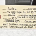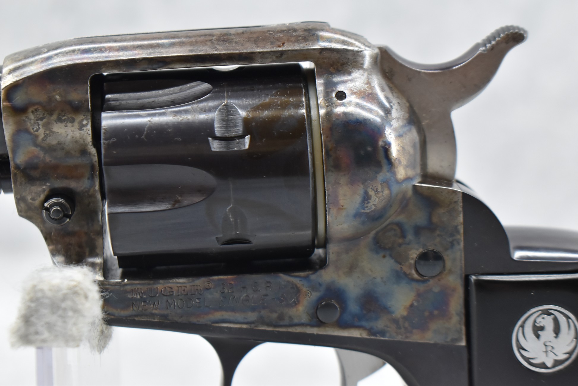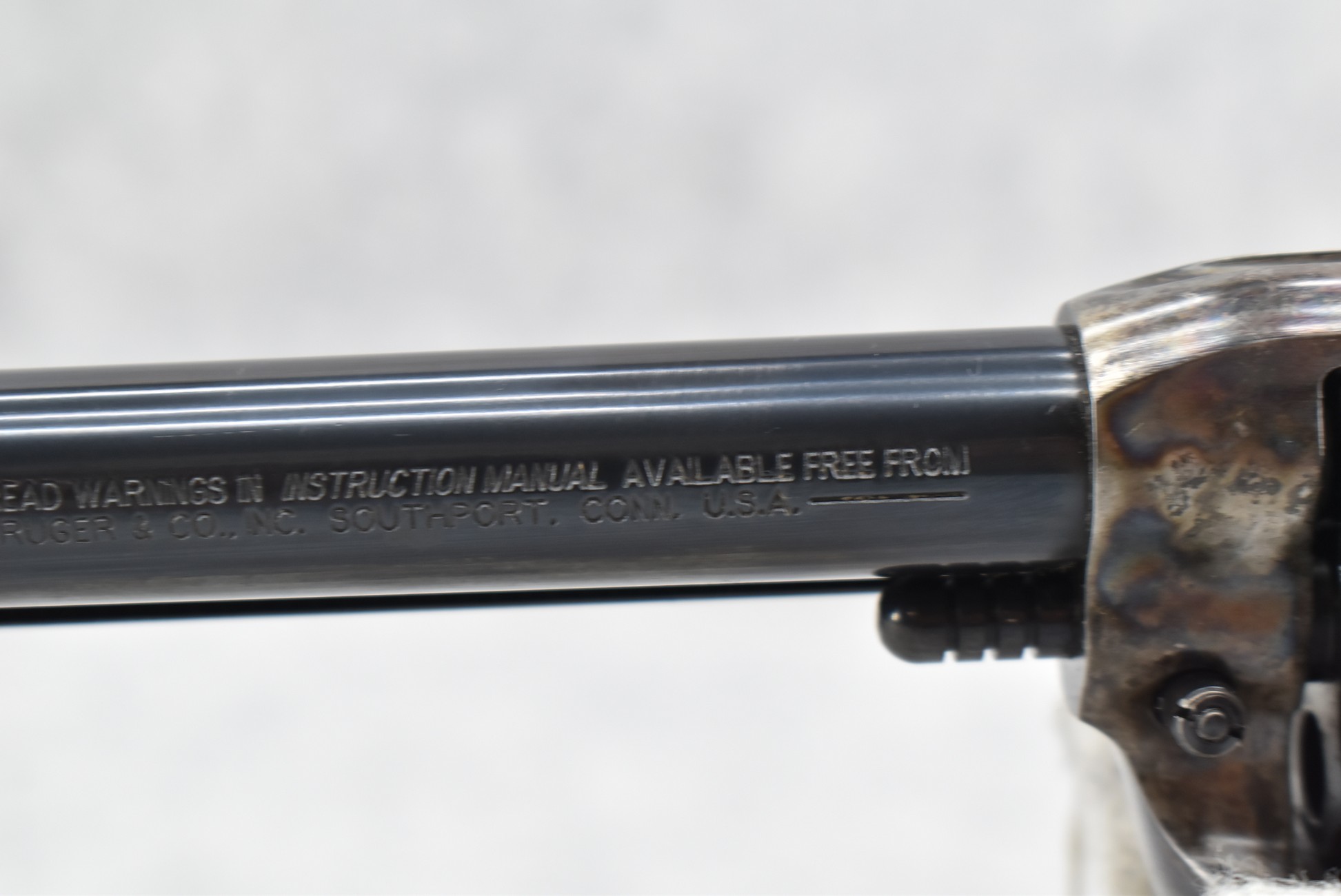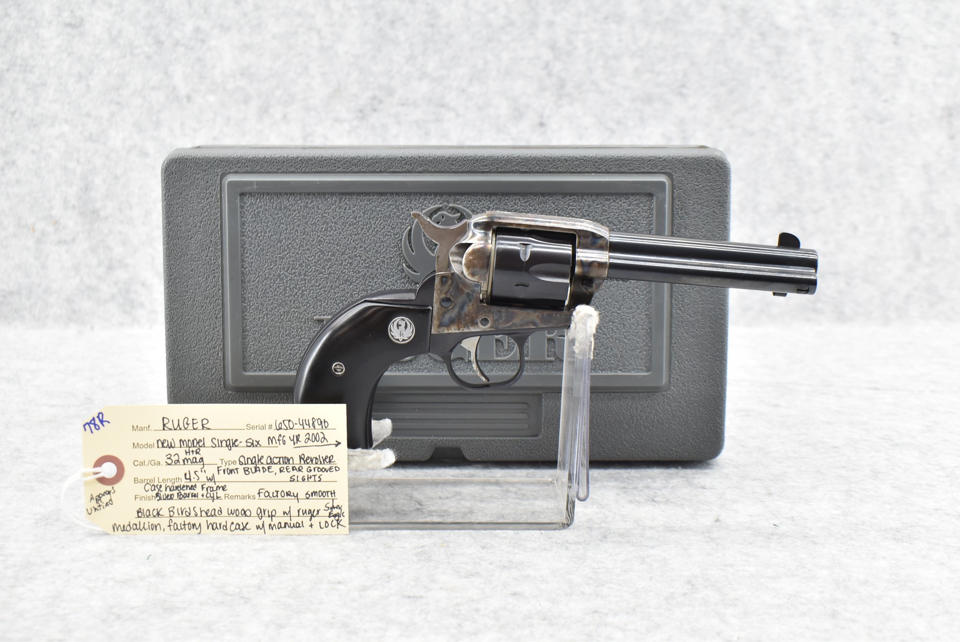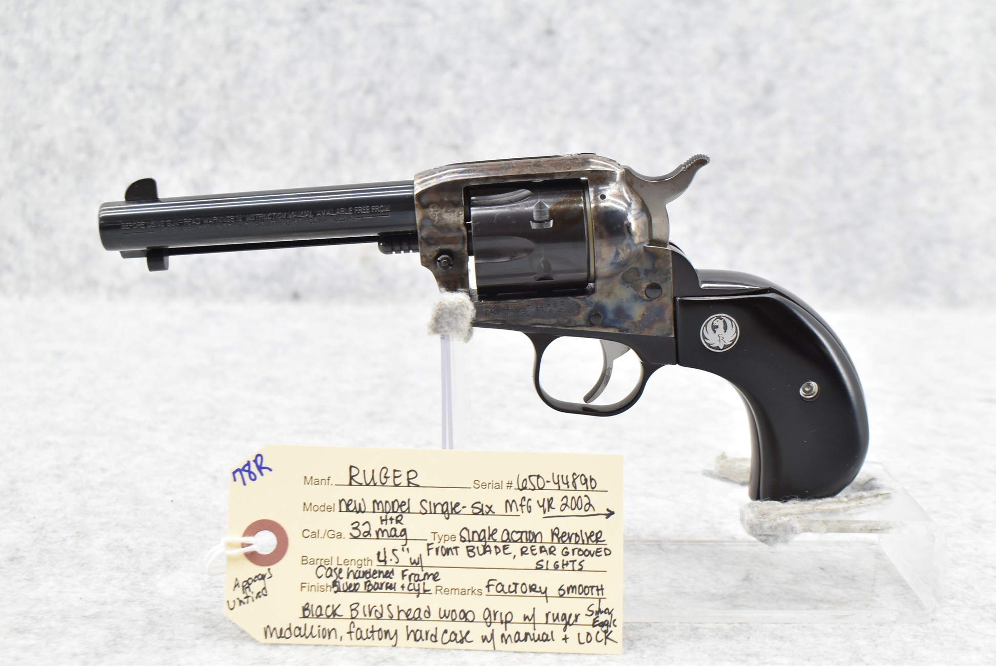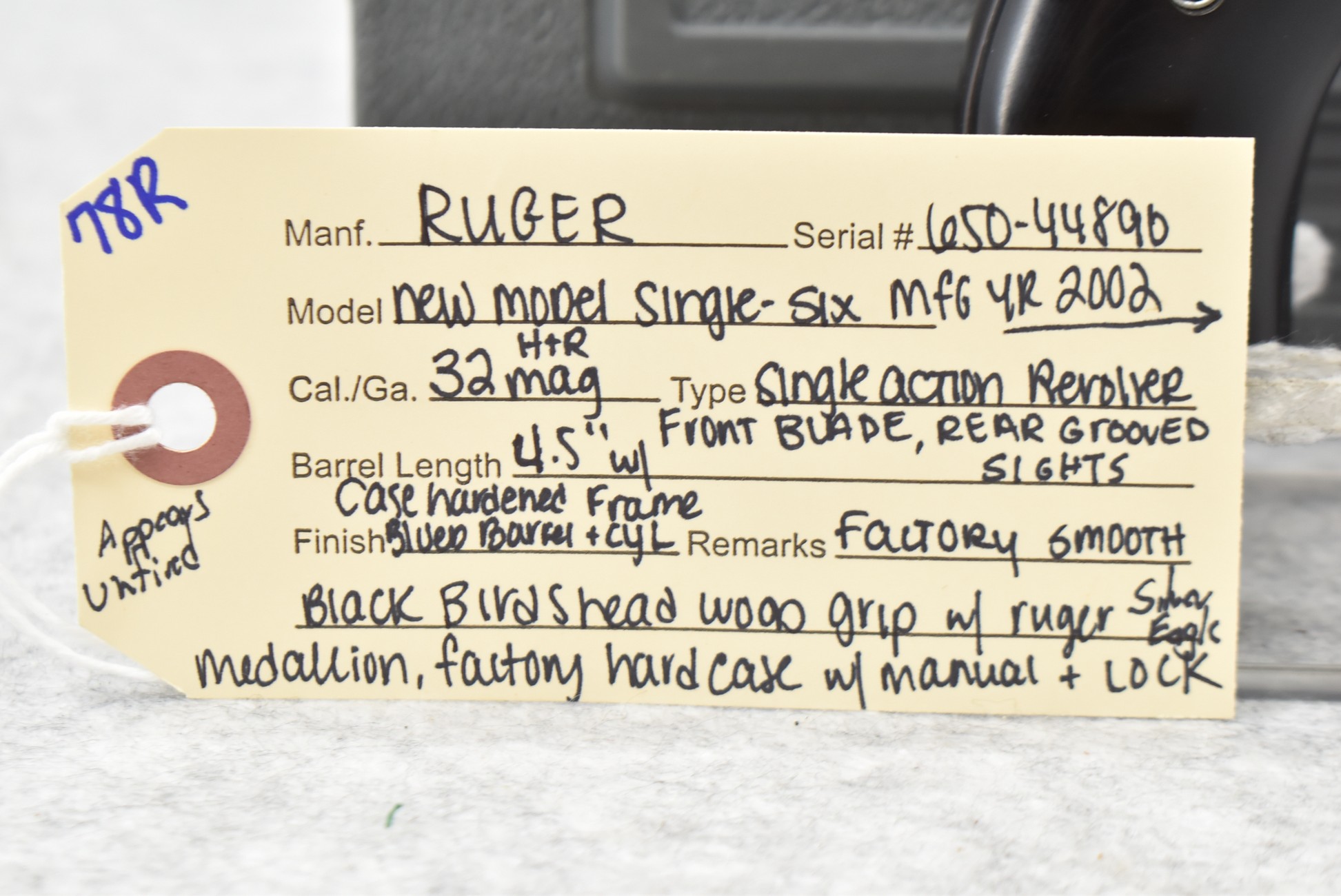 78R. Ruger – Mod. New Model Single Six Manufactured 2002 – 32 H&R Mag. Cal. Single Action Revolver – w/4½” Barrel w/Blade Front and Groove Rear Sights – Blued Barrel and Cylinder w/Case Hardened Frame – w/Factory Smooth Black Birdshead Wood Grip w/Ruger Silver Eagle Medallion – Lipsey’s Distributor Exclusive Limited Run – Appears Unfired in Factory Hard Case w/Manual