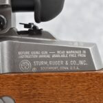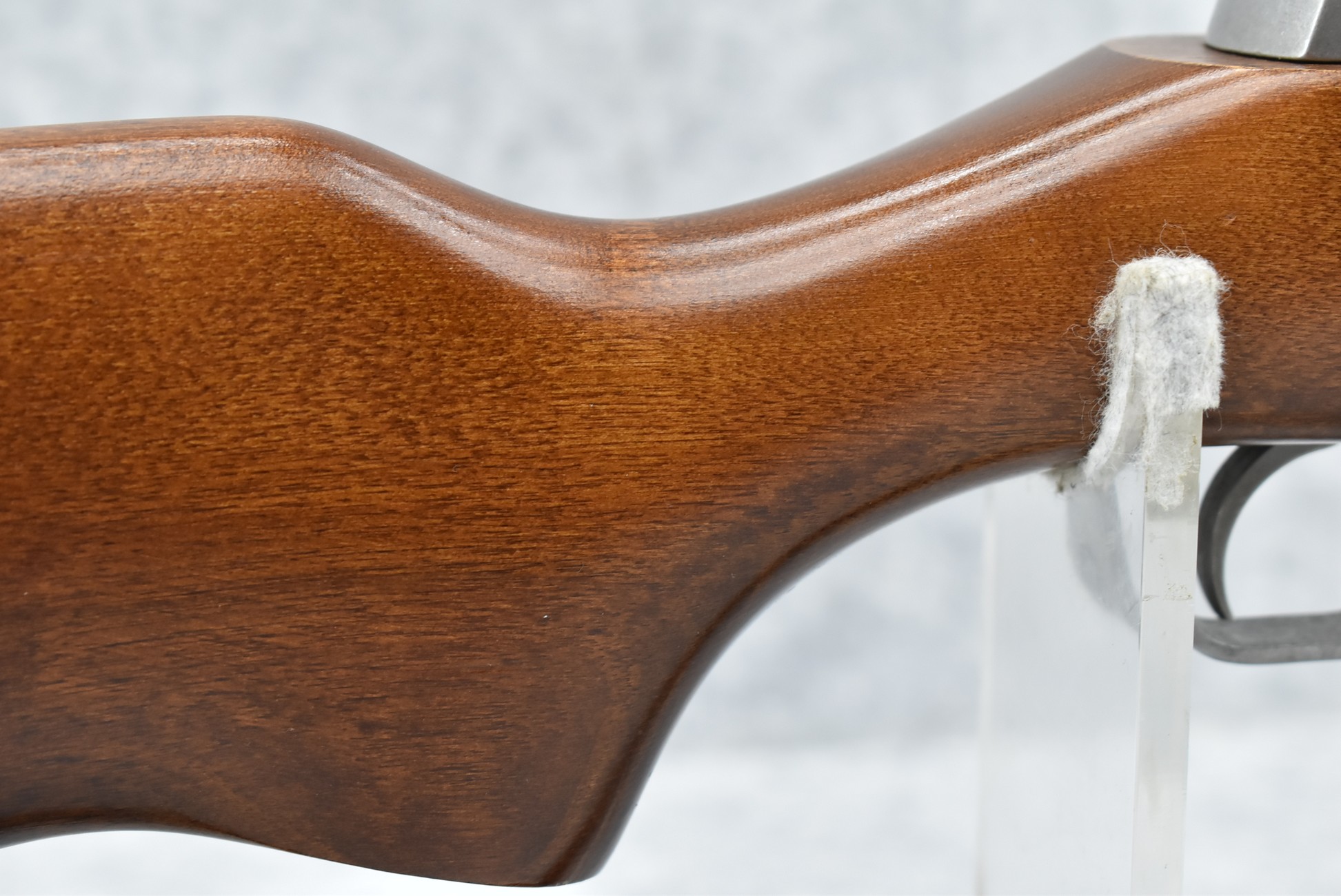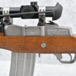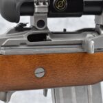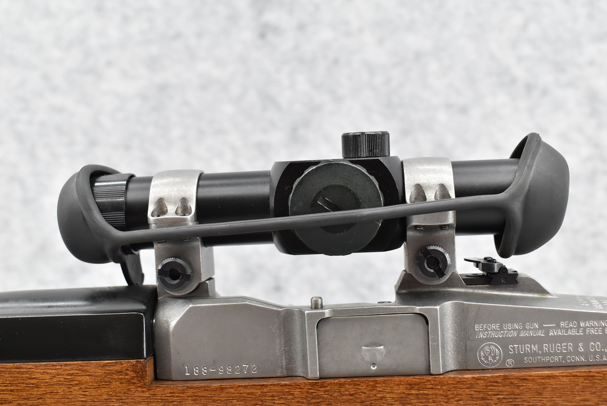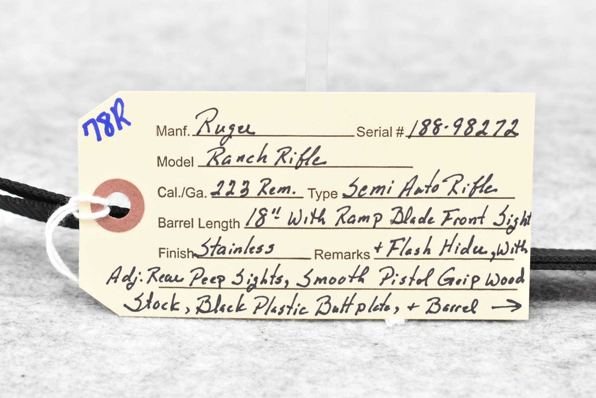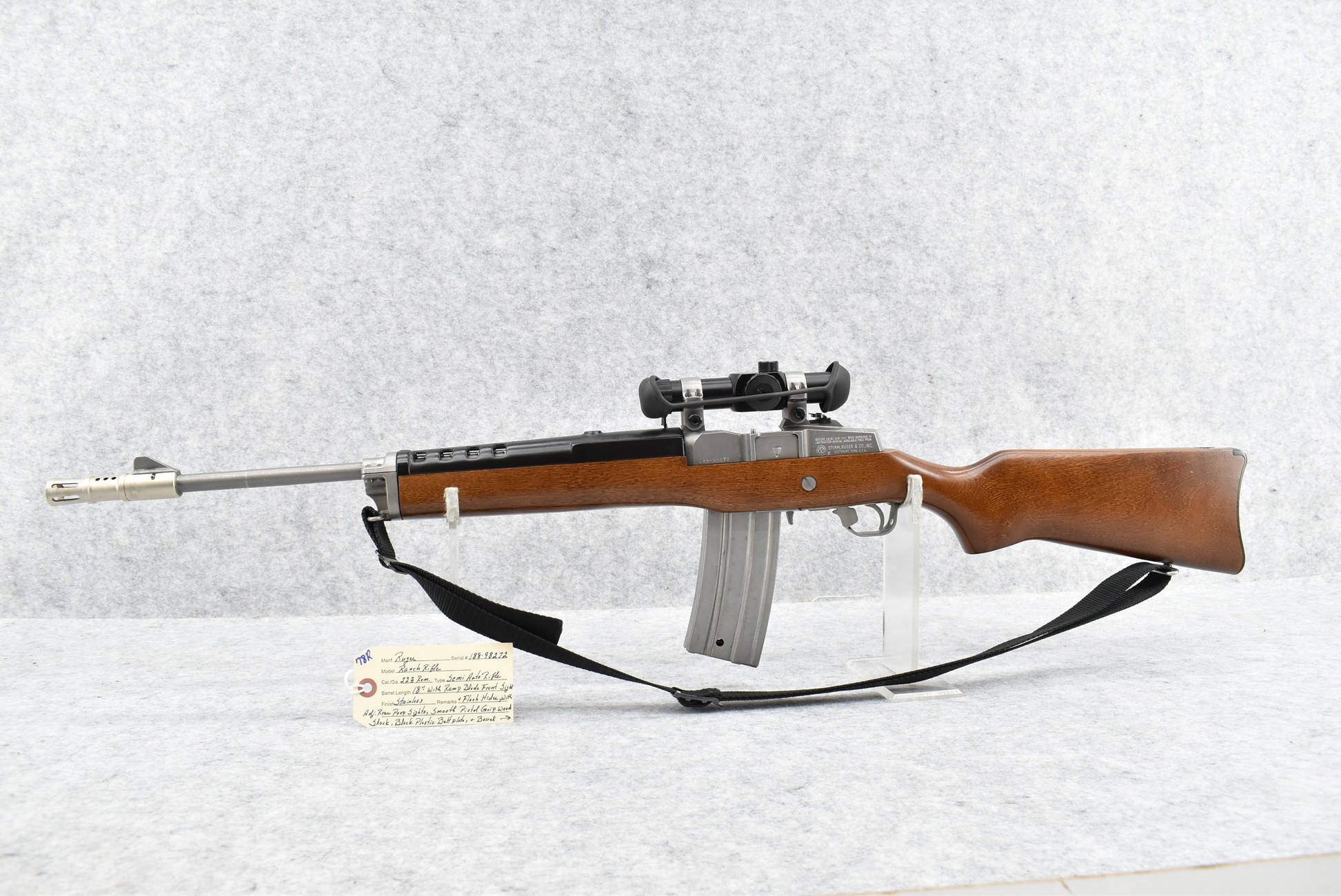 78R. Ruger – Mod. Ranch Rifle – 223 Rem. Cal. Semi-Auto Rifle – w/18” Barrel w/Ramp Blade Front Sight, Flash Hider, and Adjustable Rear Peep Sight – Stainless Finish – w/Smooth Pistol Grip Wood Stock w/Butt Plate – w/1 Detachable Magazine – w/Simmons Red Dot Holographic Sight and Scope Cover – w/Black Nylon Sling
