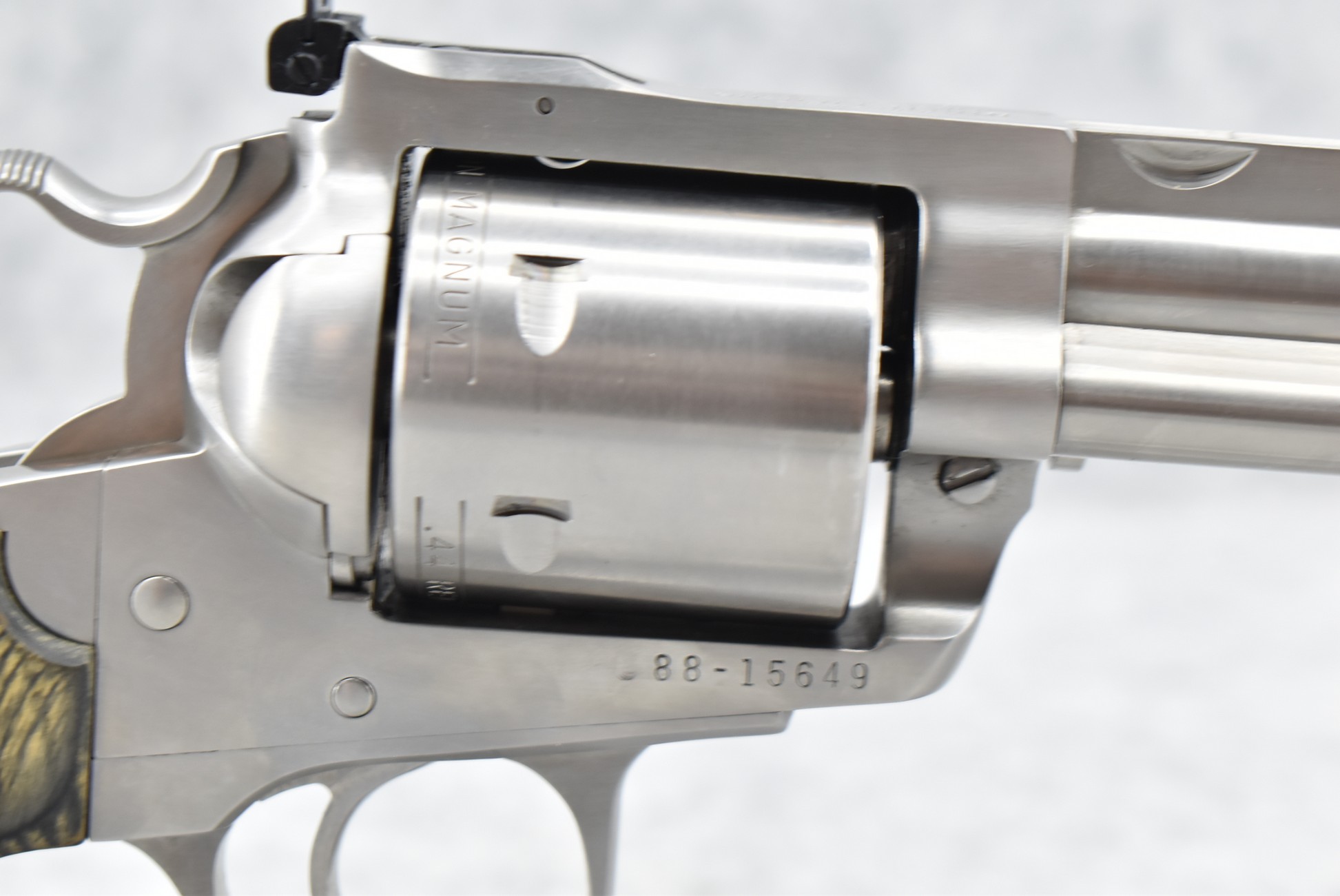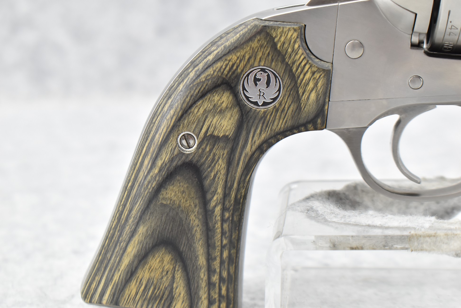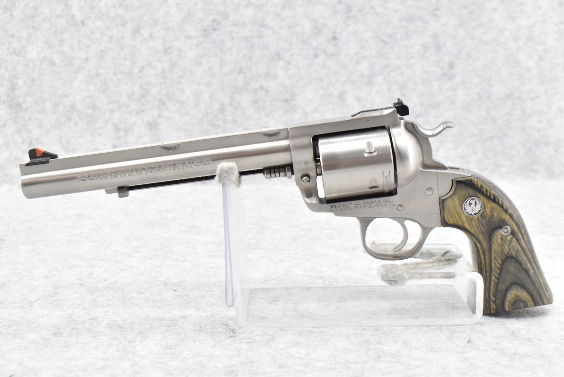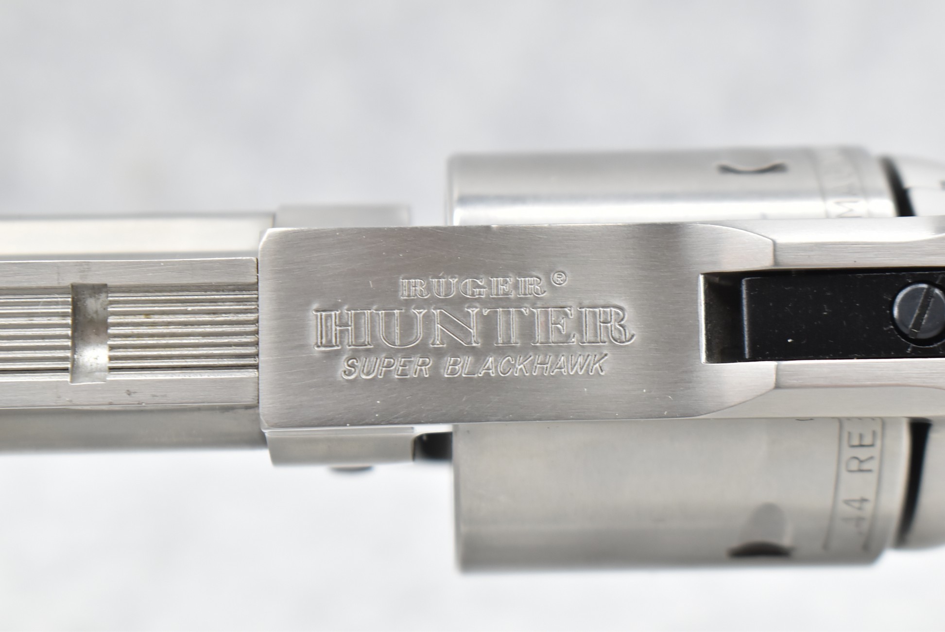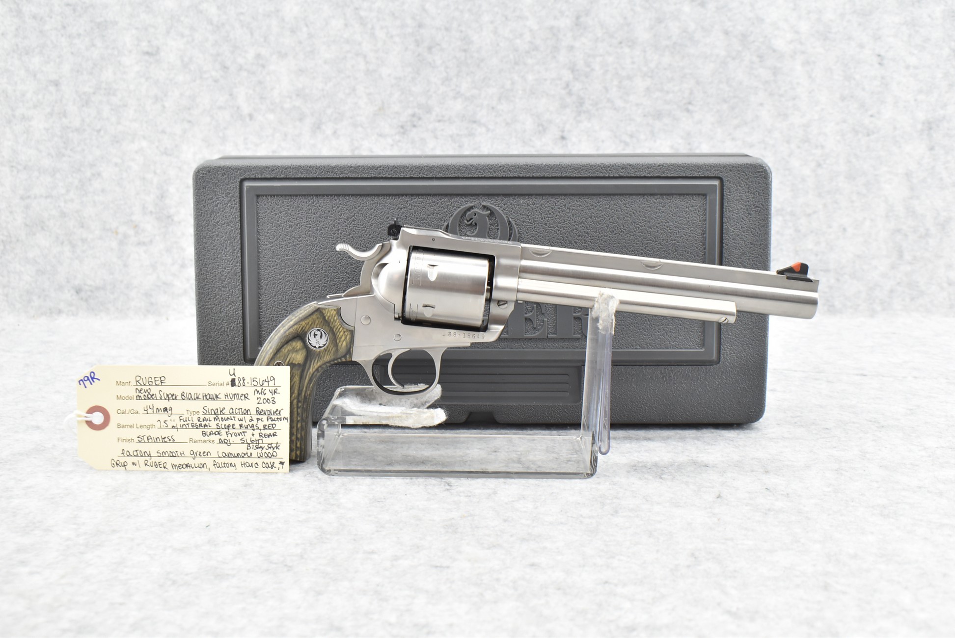79R. Ruger – Mod. New Model Super Blackhawk Hunter – 44 Mag. Cal. Single Action Revolver – w/7½” Barrel w/Red Blade Front and Adjustable Rear Sights – Stainless Finish – w/Factory Smooth Green Laminated Bisley Style Wood Grip w/Ruger Medallion – w/Full Rail Mount w/2-Piece Factory Integral Scope Rings – w/Factory Hard Case and Manual – Mfg. 2003