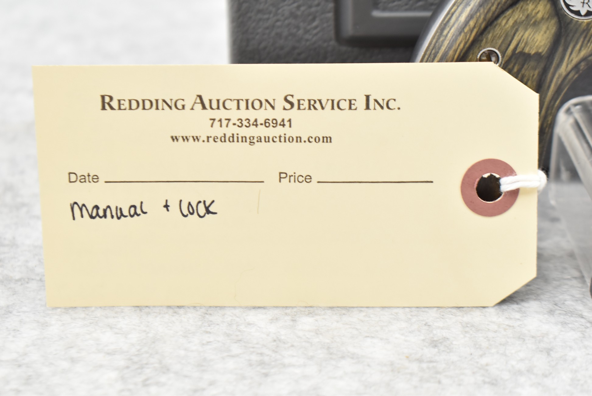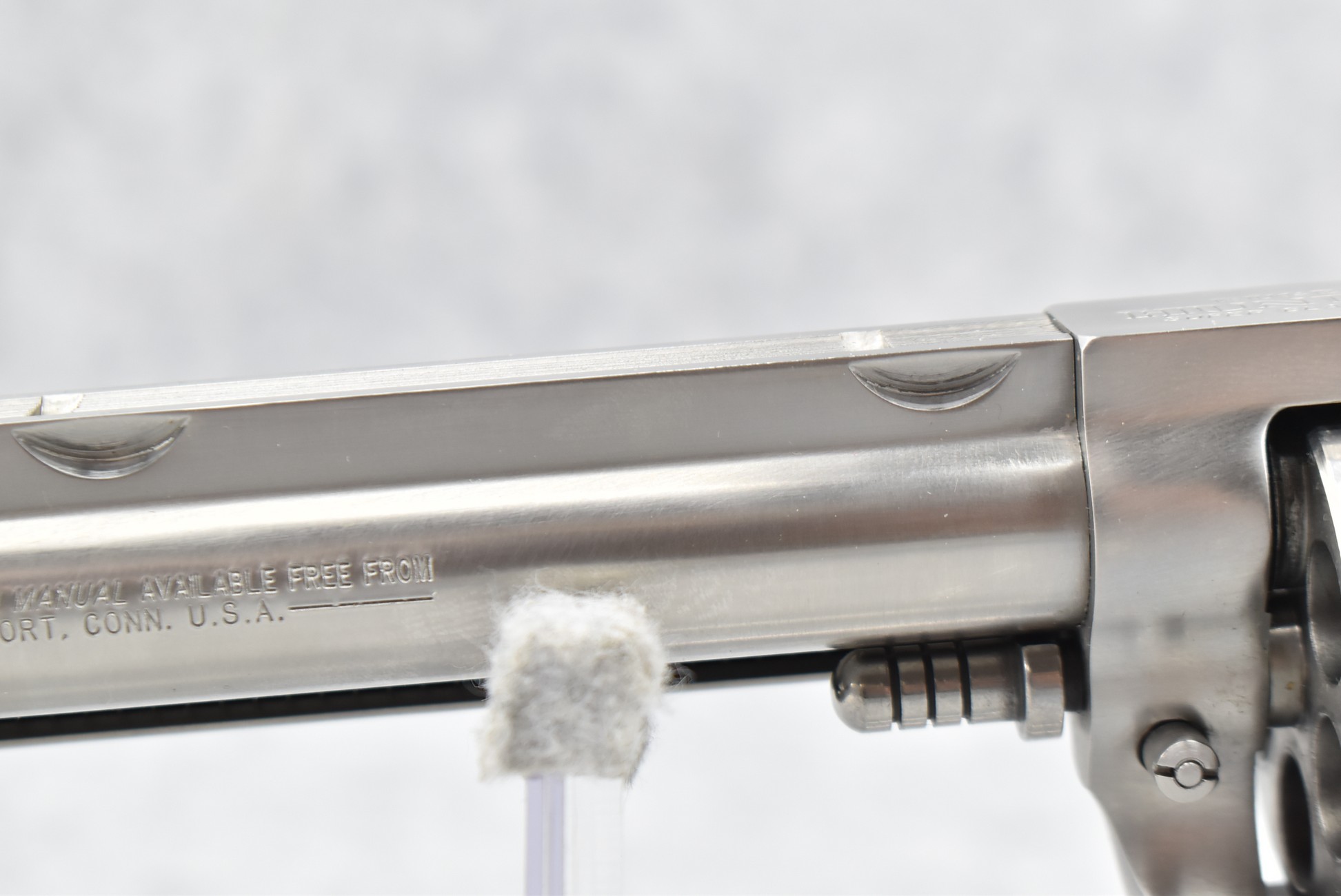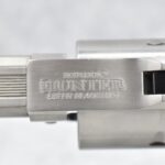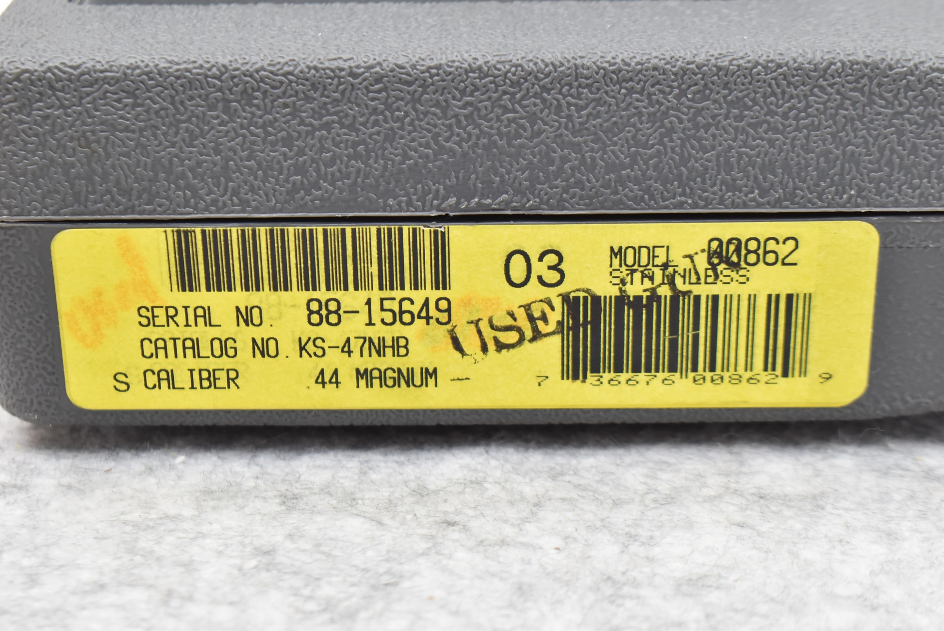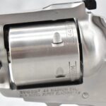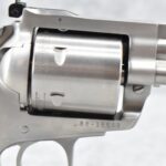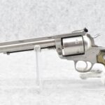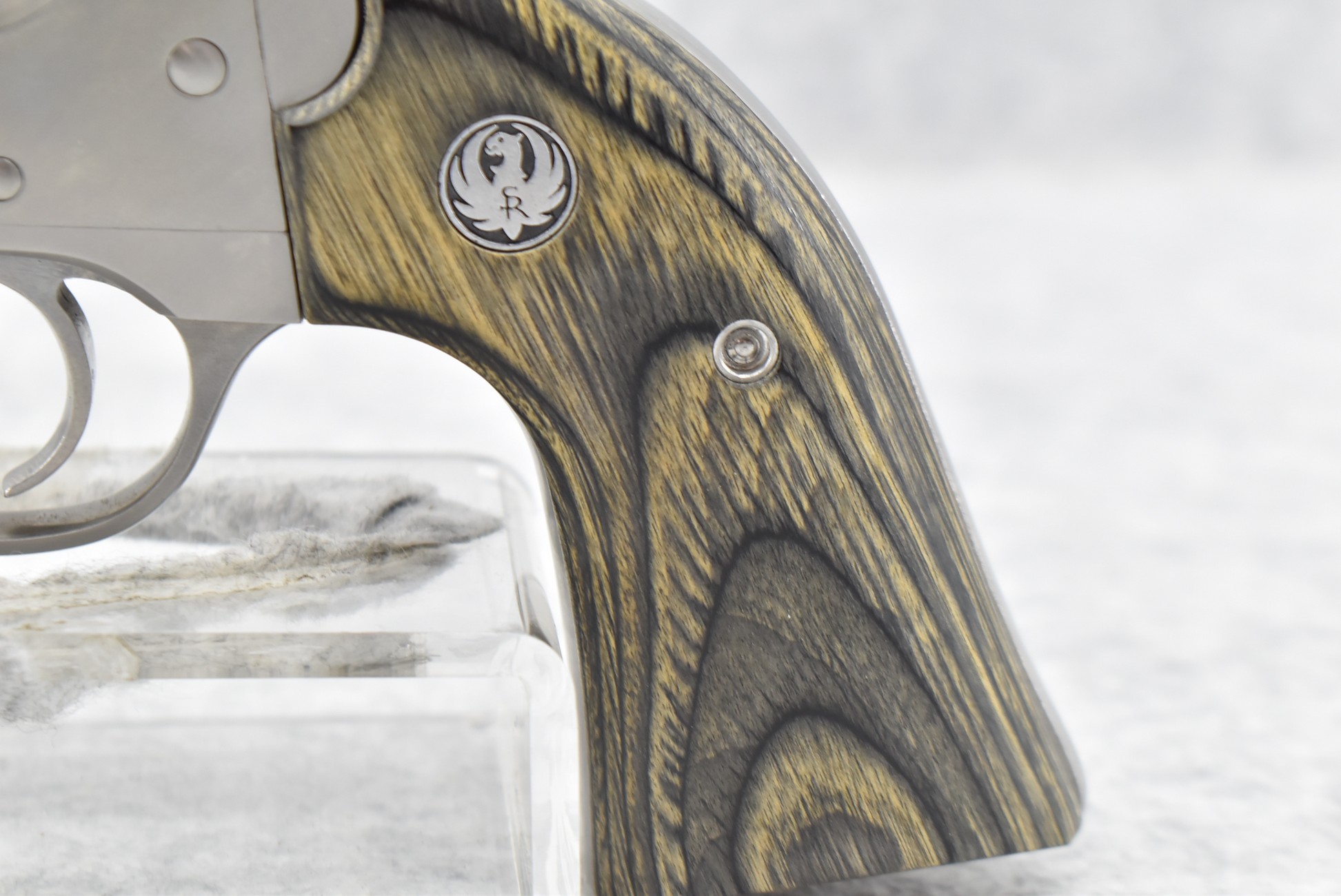 79R. Ruger – Mod. New Model Super Blackhawk Hunter – 44 Mag. Cal. Single Action Revolver – w/7½” Barrel w/Red Blade Front and Adjustable Rear Sights – Stainless Finish – w/Factory Smooth Green Laminated Bisley Style Wood Grip w/Ruger Medallion – w/Full Rail Mount w/2-Piece Factory Integral Scope Rings – w/Factory Hard Case and Manual – Mfg. 2003