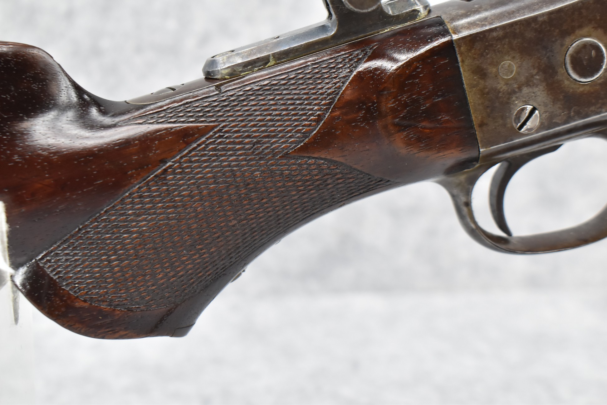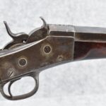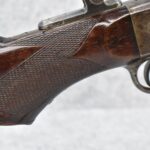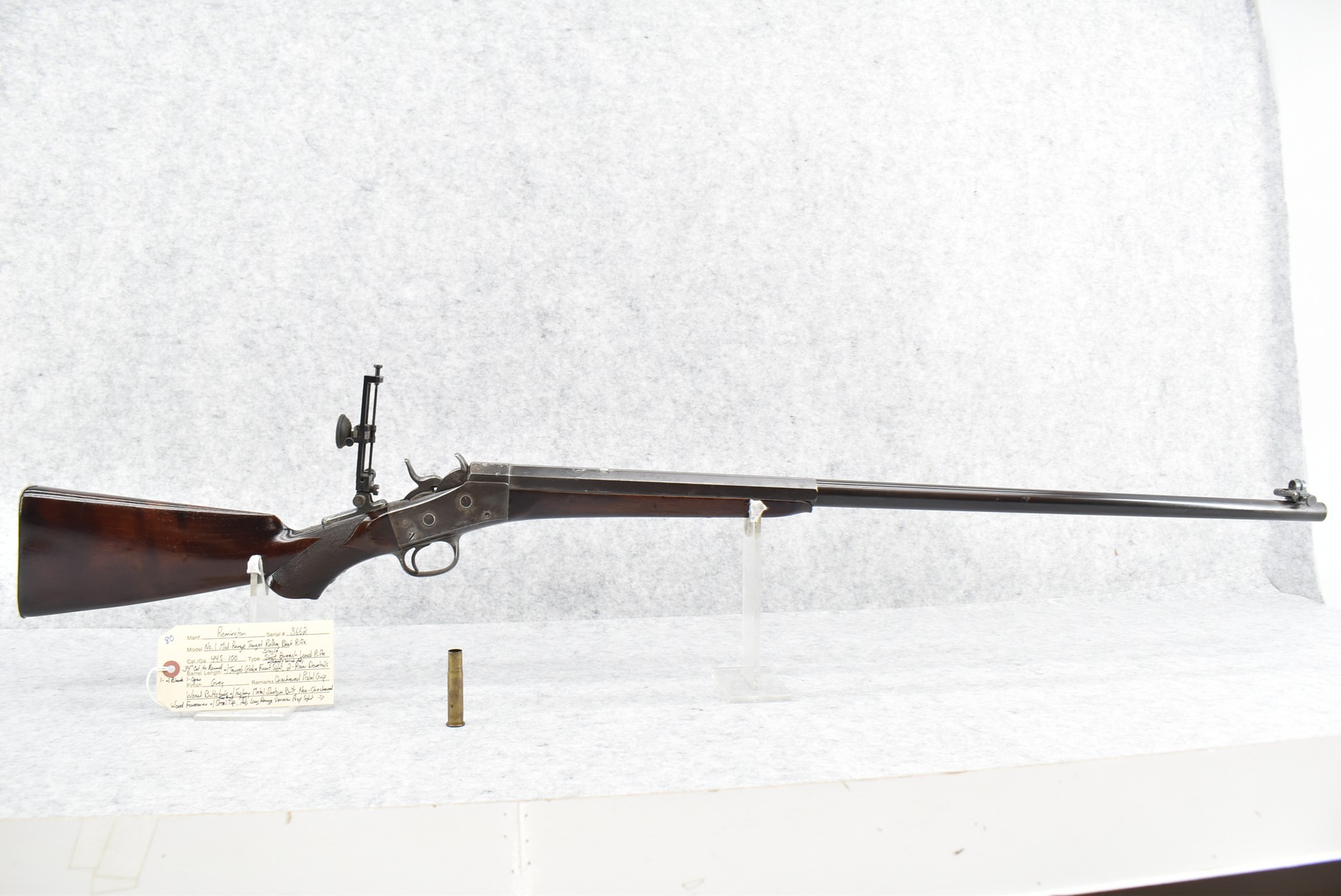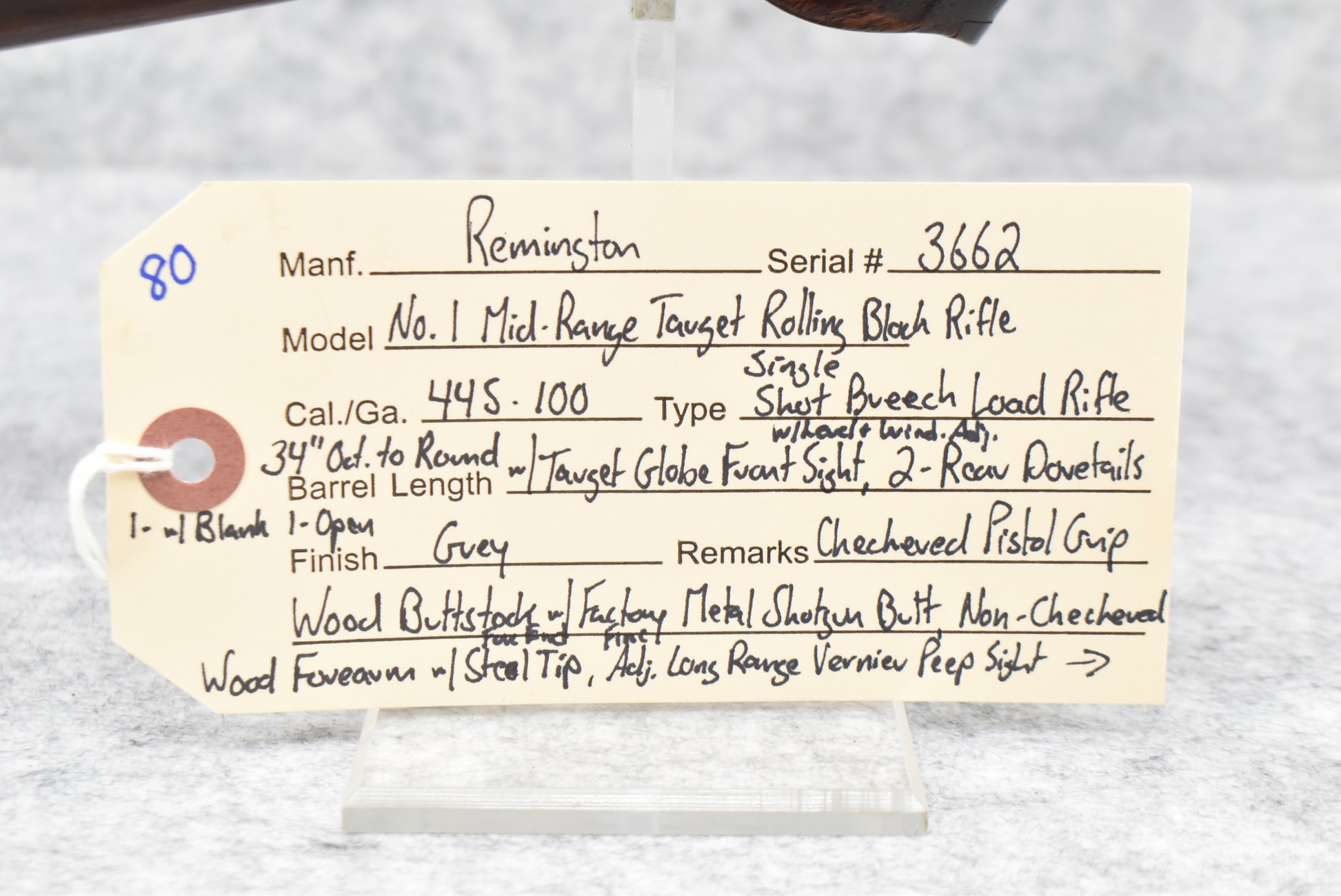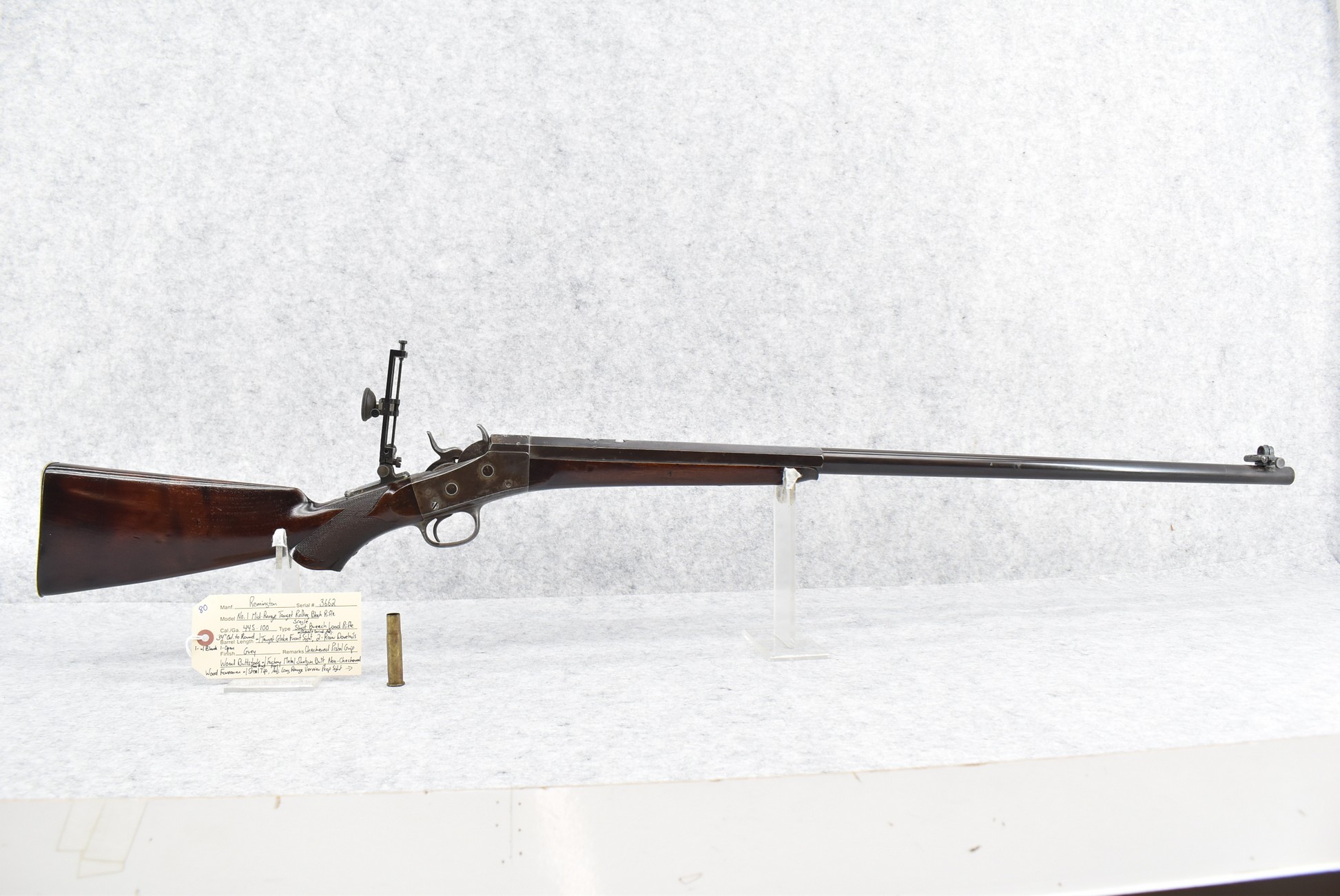 80. Remington – Mod. No. 1 Mid-Rage Target Rolling Block Rifle – 44S-100 Cal. Single Shot Breech Load Rifle – w/34” Octagon to Round Heavy Barrel w/Target Globe Front Sig w/Level & Wind Adj. & 2-Rear Dovetails (1 w/Blank, 1 Open) – Gray Finish – w/Checkered Pistol Grip Wood Butt Stock w/Factory Metal Shotgun Butt & Non-Checkered Wood Forearm w/Forend Steel Tip – w/Fine Adj. Long Rage Vernier Peep Sight – Mfg. Circa 1875-1890
