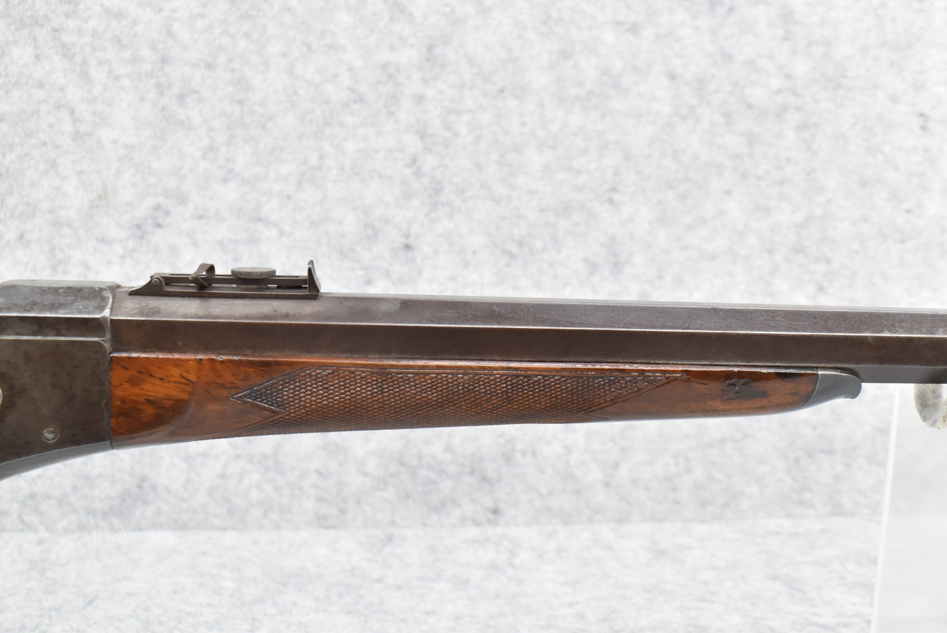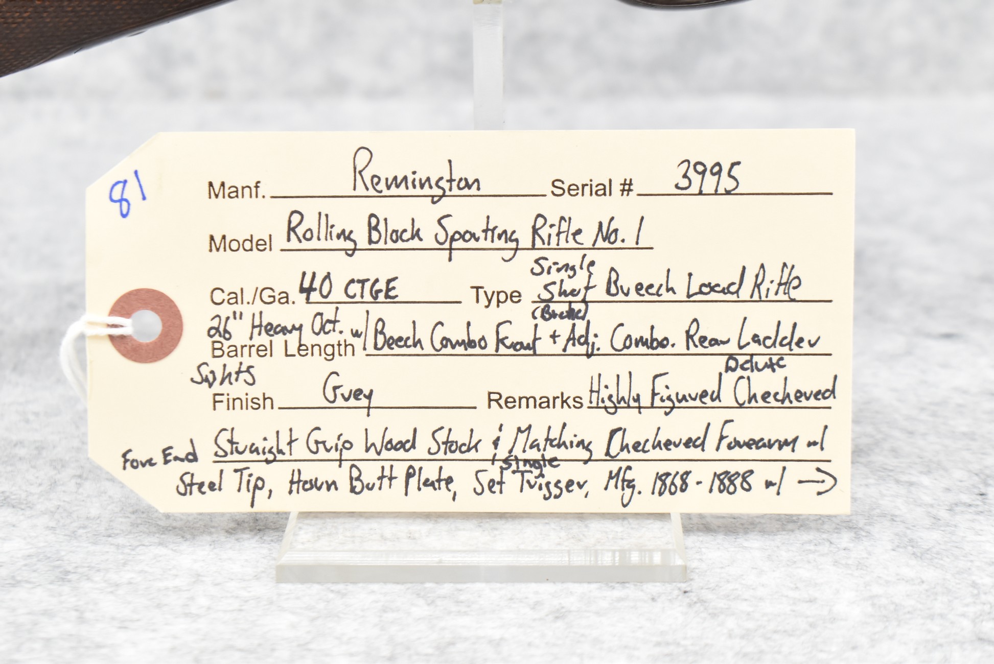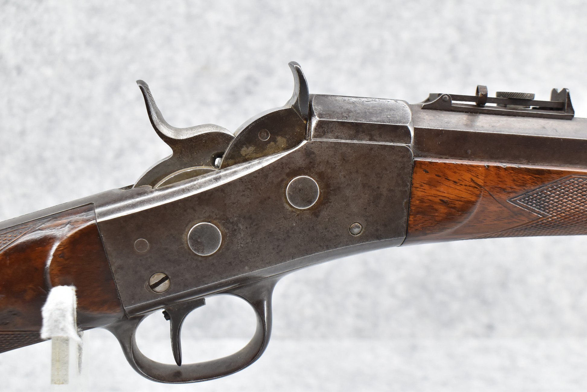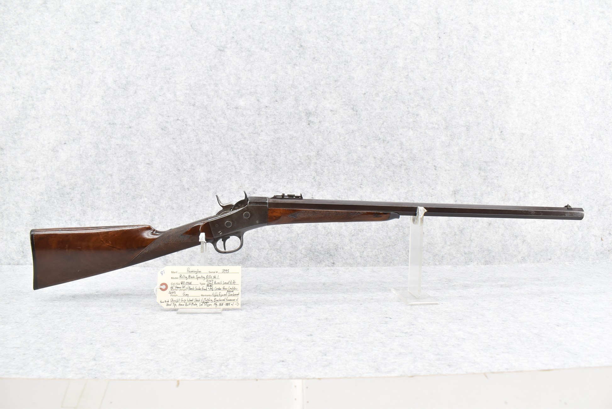 81. Remington – Mod. Rolling Block Sporting Rifle No. 1 – 40 CTGE Cal. Single Shot Breech Load Rifle – w/26” Heavy Octagon Barrel w/Beech Combo Front (Broke) & Adj. Combo Rear Ladder Sights – Gray Finish – w/Highly Figured Deluxe Checkered Straight Grip Wood Stock w/Horn Butt Plate w/Matching Checkered Forearm w/Forend Steel Tip – w/Set Single Trigger – Mfg. Between 1868-1888 w/Approx. 12,000 Mfg.