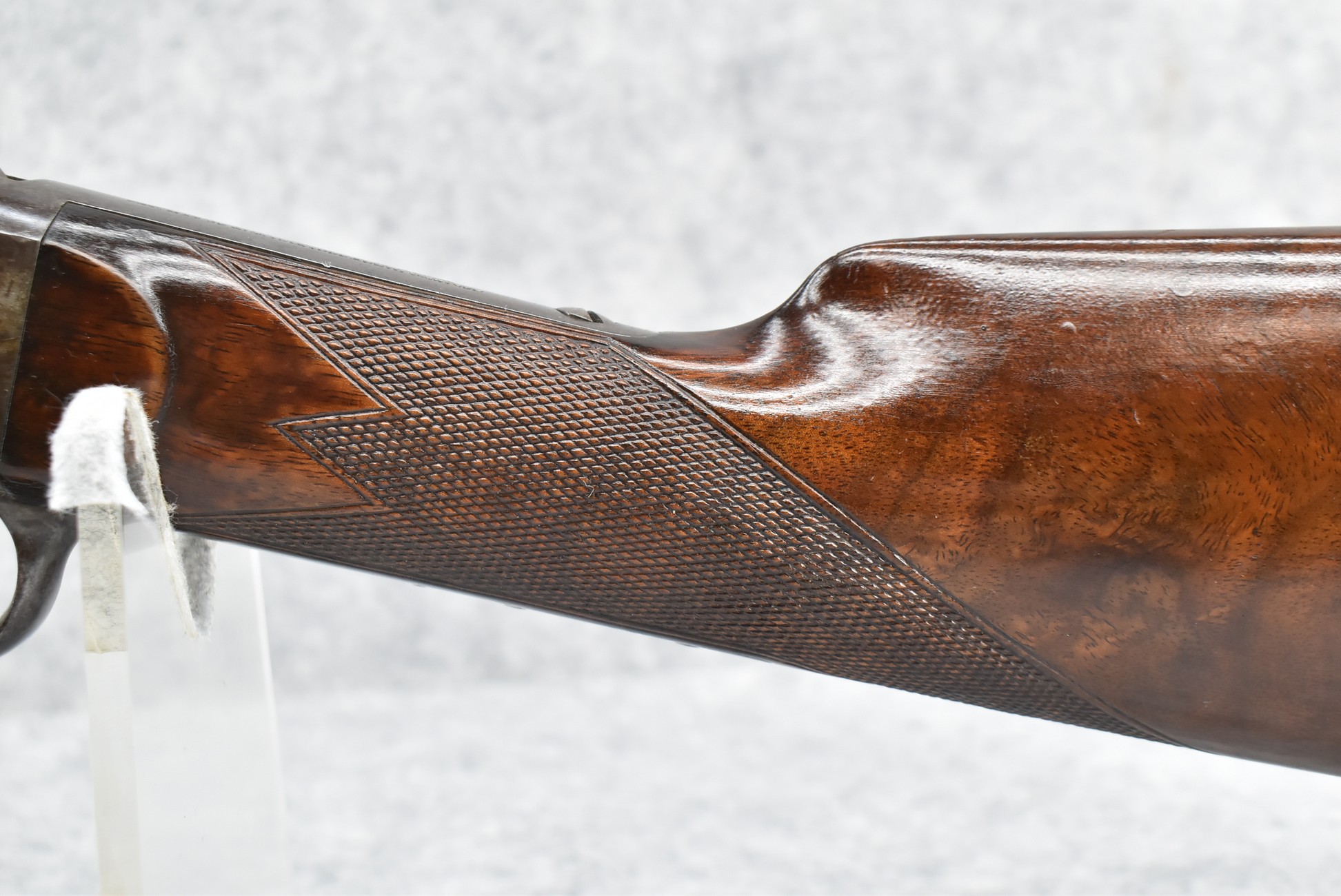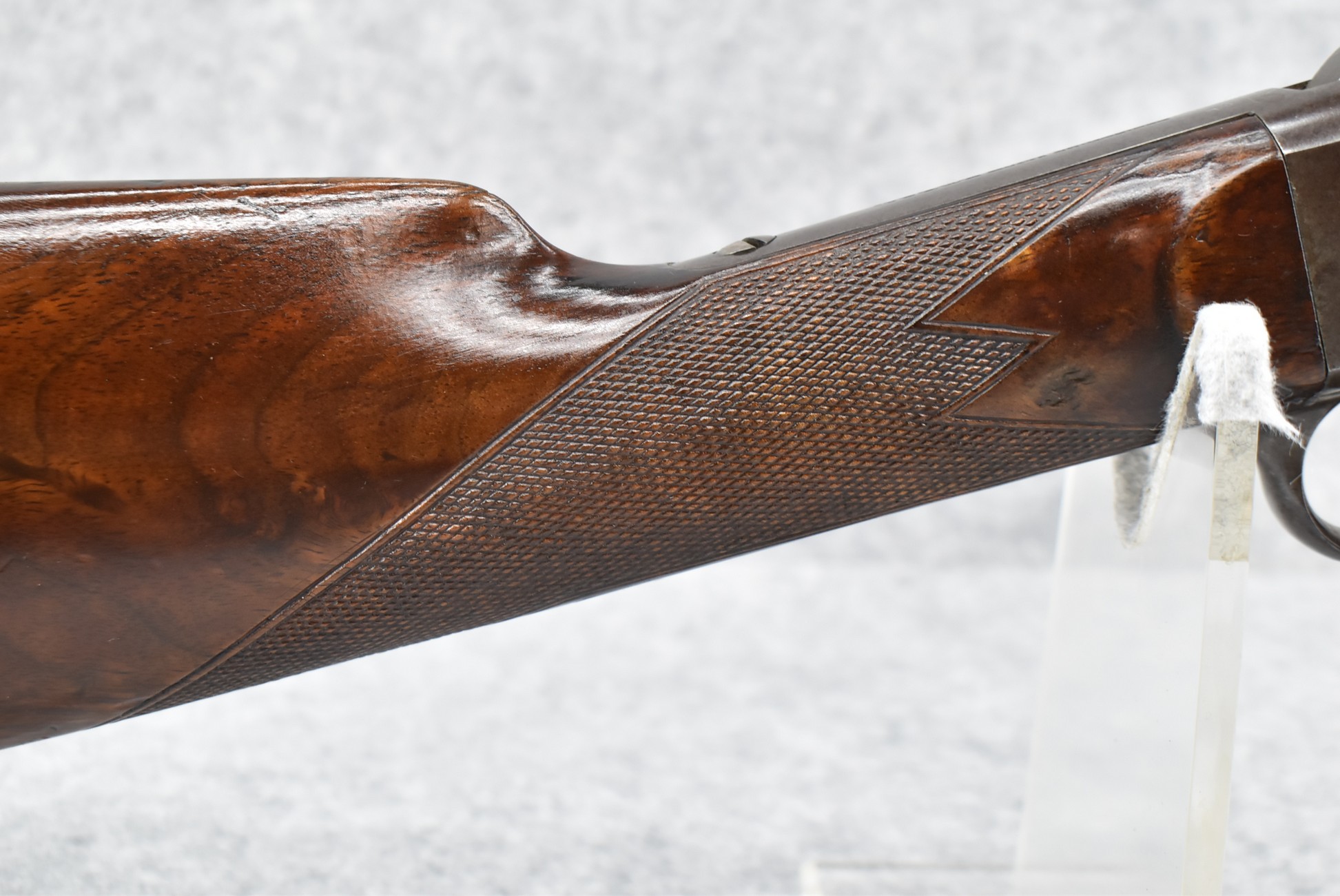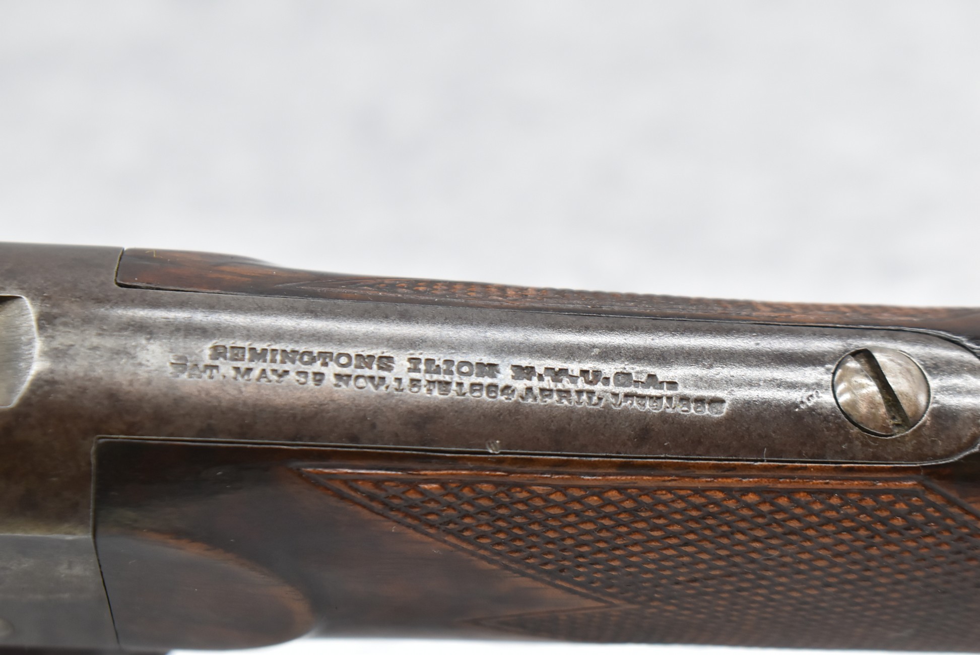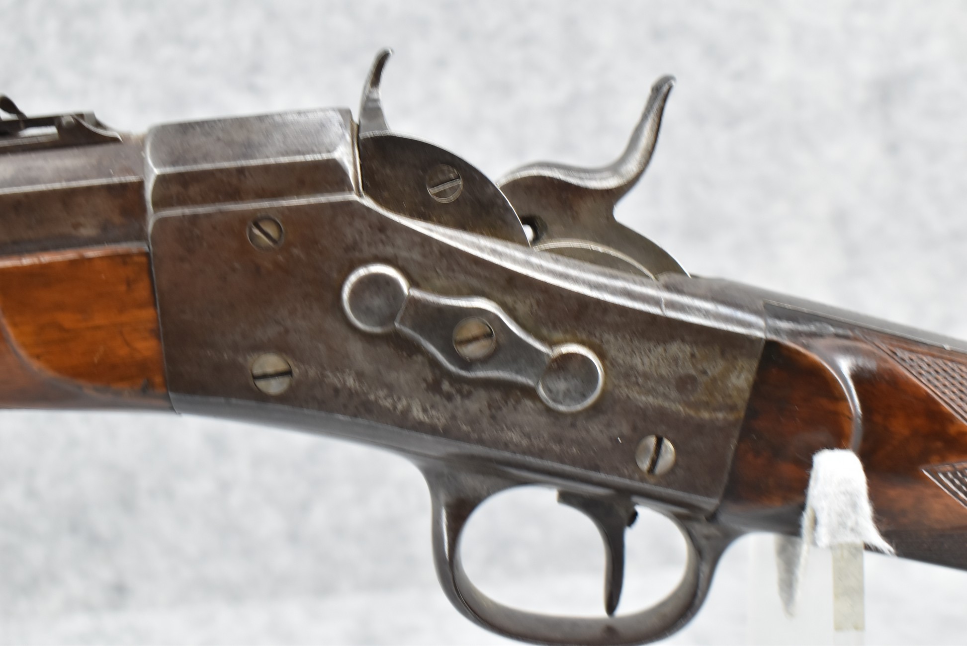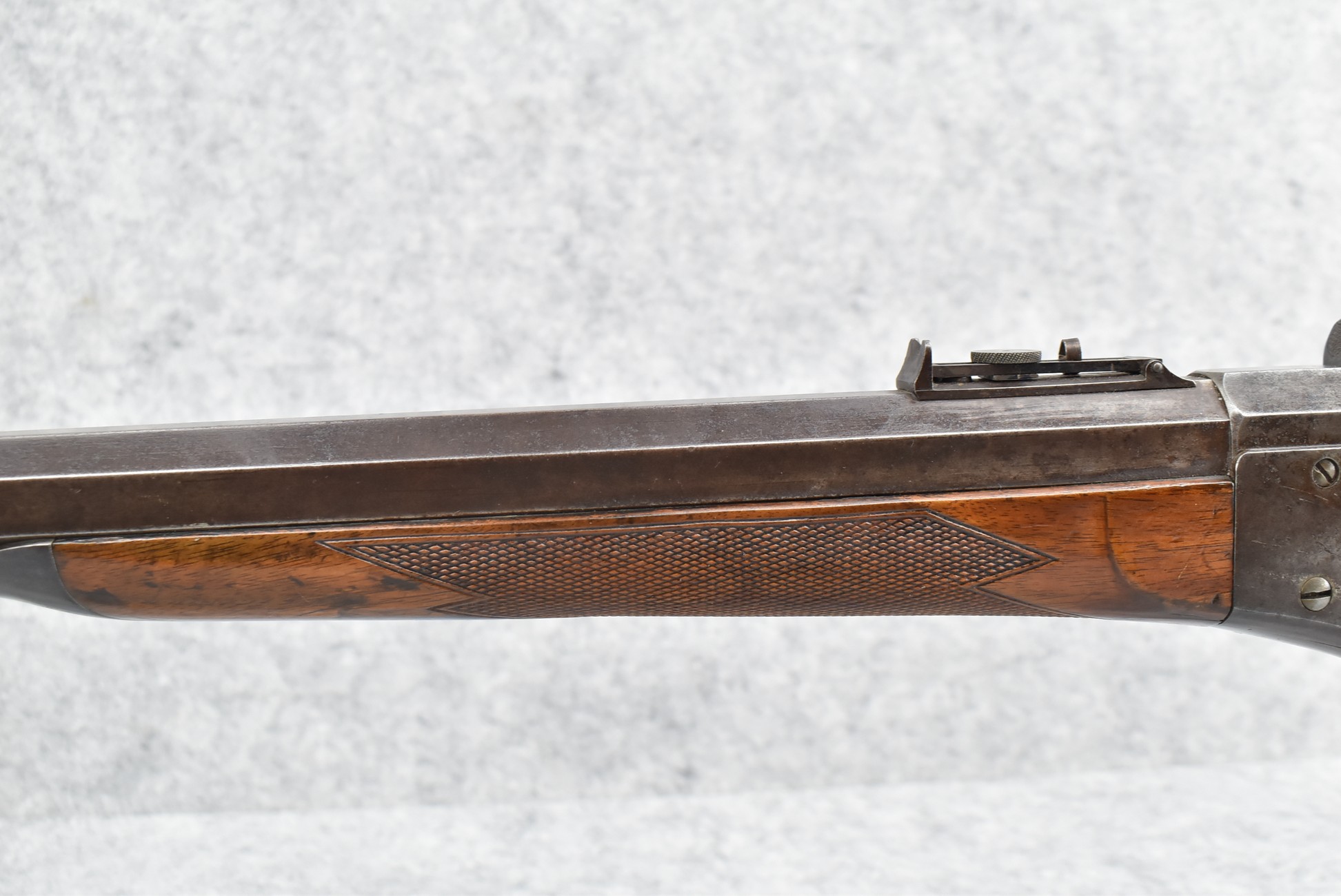 81. Remington – Mod. Rolling Block Sporting Rifle No. 1 – 40 CTGE Cal. Single Shot Breech Load Rifle – w/26” Heavy Octagon Barrel w/Beech Combo Front (Broke) & Adj. Combo Rear Ladder Sights – Gray Finish – w/Highly Figured Deluxe Checkered Straight Grip Wood Stock w/Horn Butt Plate w/Matching Checkered Forearm w/Forend Steel Tip – w/Set Single Trigger – Mfg. Between 1868-1888 w/Approx. 12,000 Mfg.