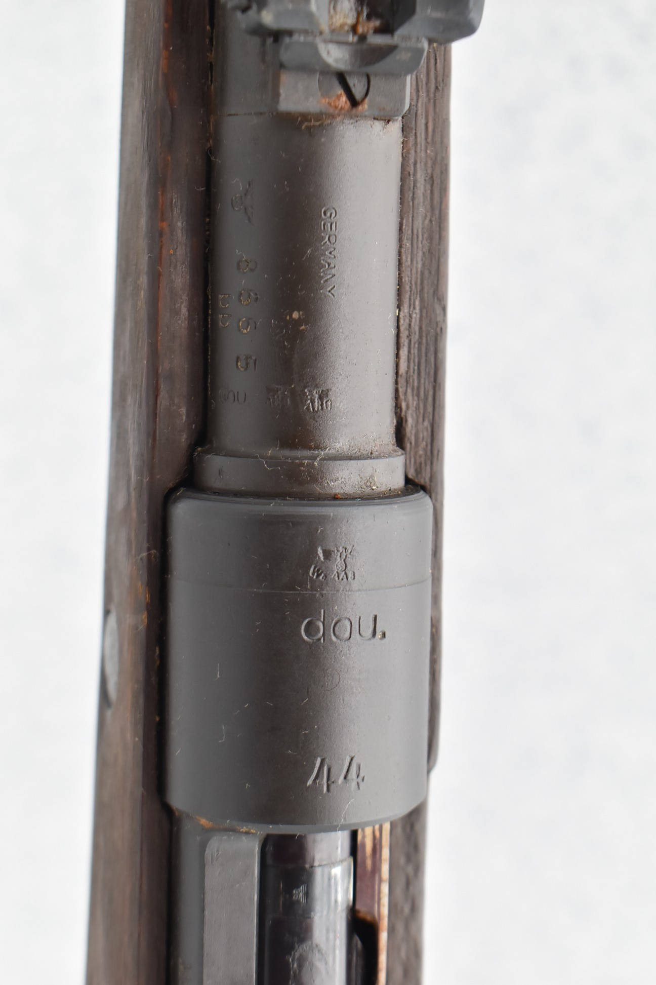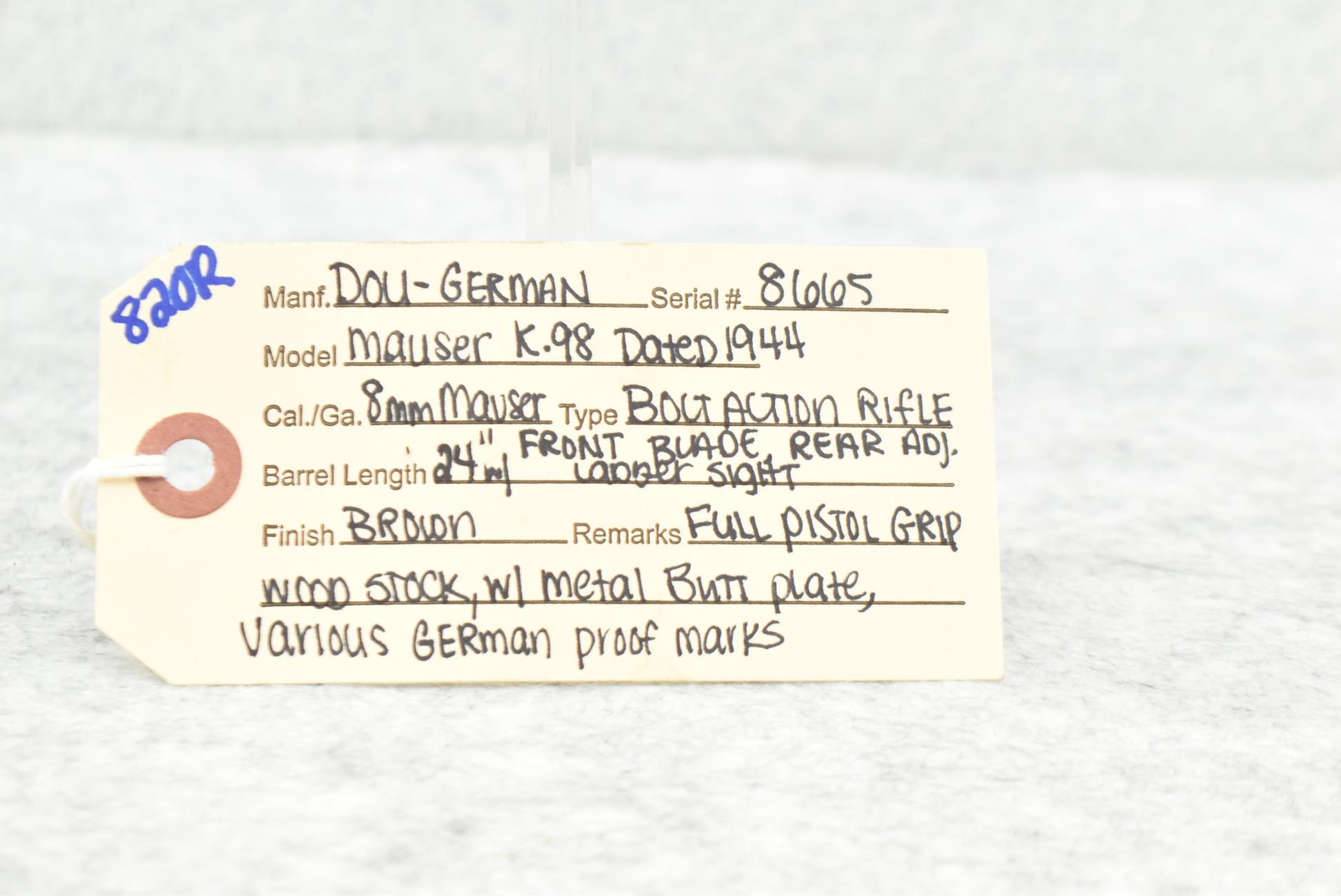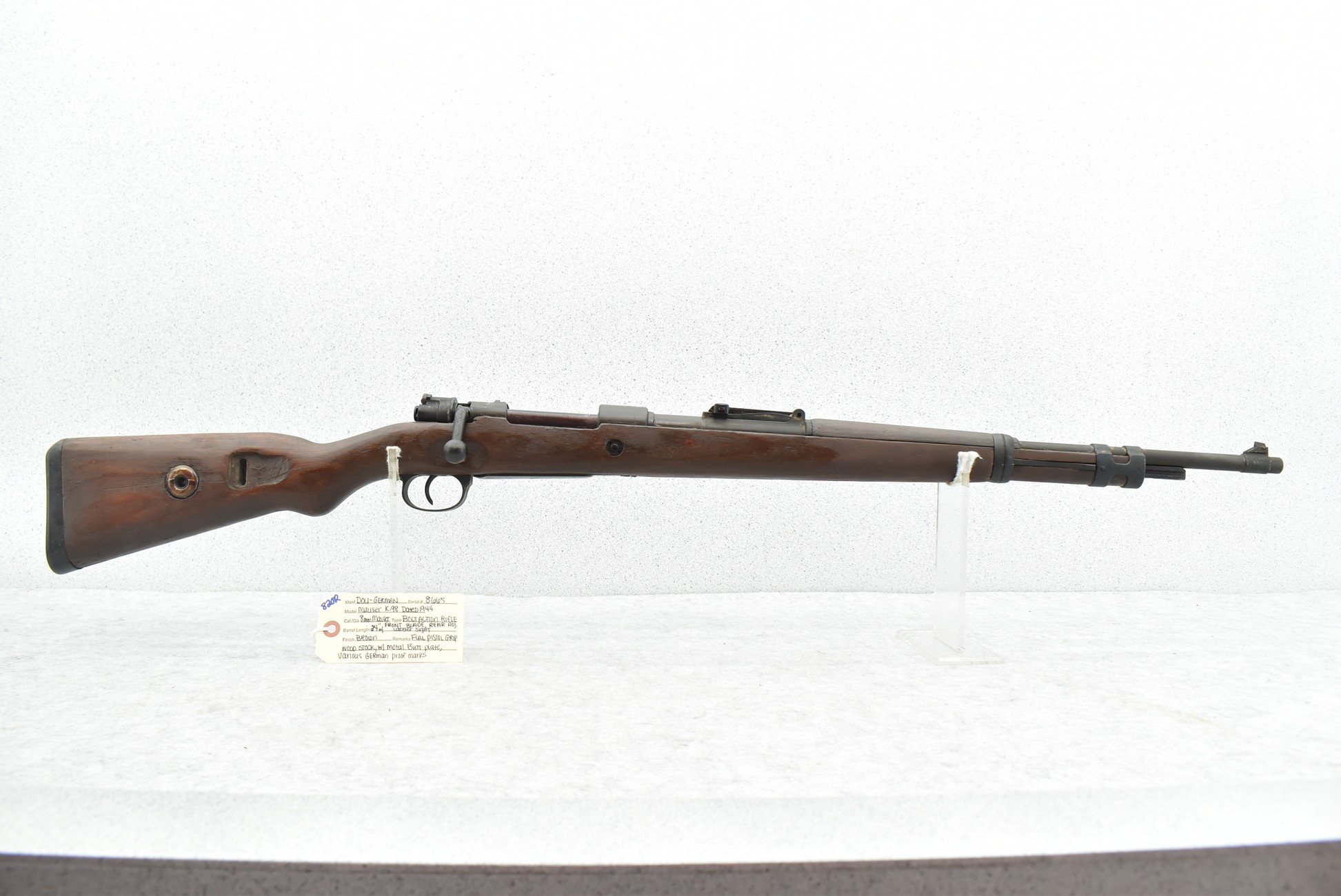 820R.     Waffen-Werke Brünn – Mod. 98K – 8mm Mauser Cal. Bolt Action Rifle – w/24” Barrel w/Front Blade & Rear Adj. Ladder Sights – Brown Finish – w/Full Pistol Grip Wood Stocks w/Metal Butt Plate – w/Various German Proof Marks – Mfg. Code:  dou – Dated 1944