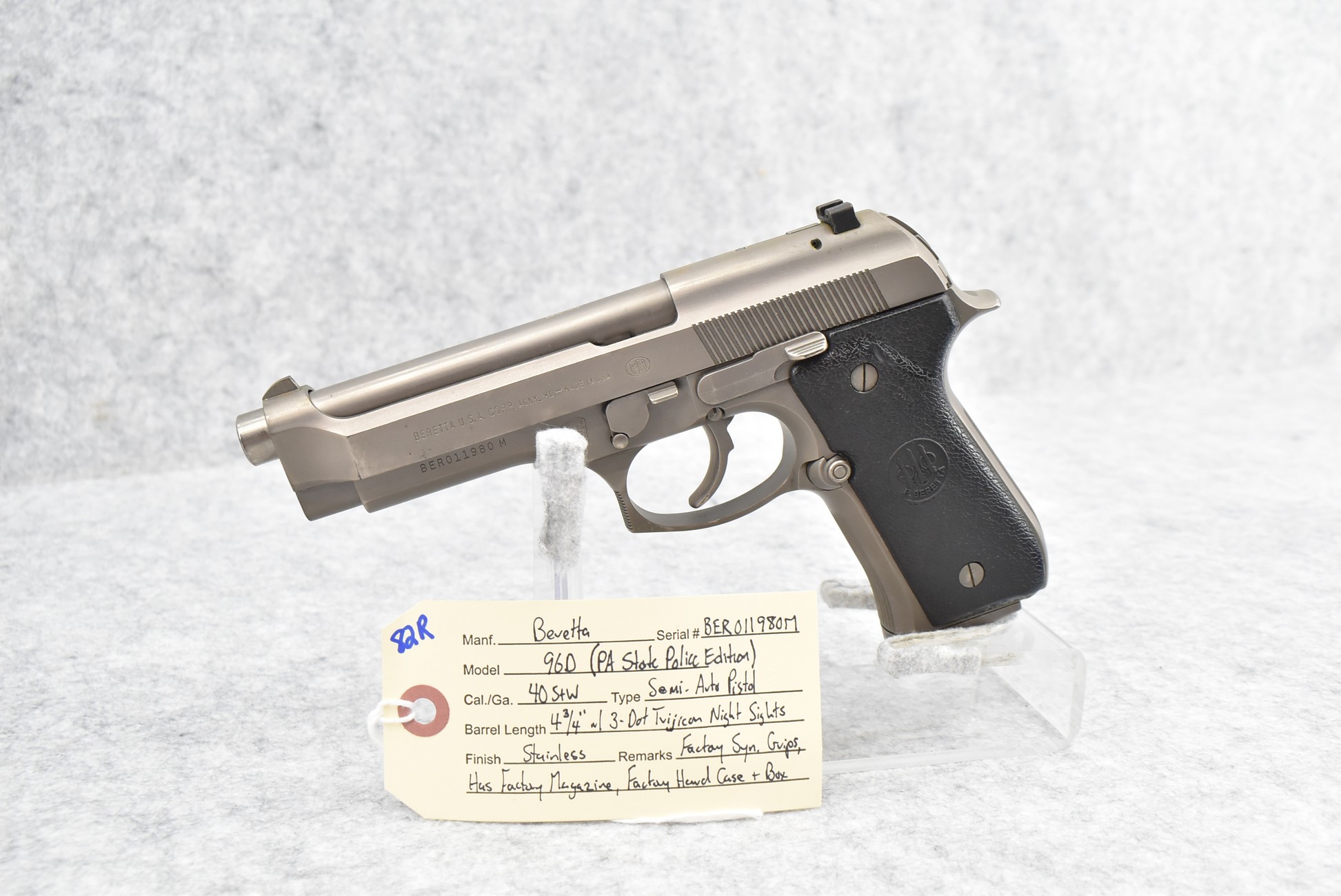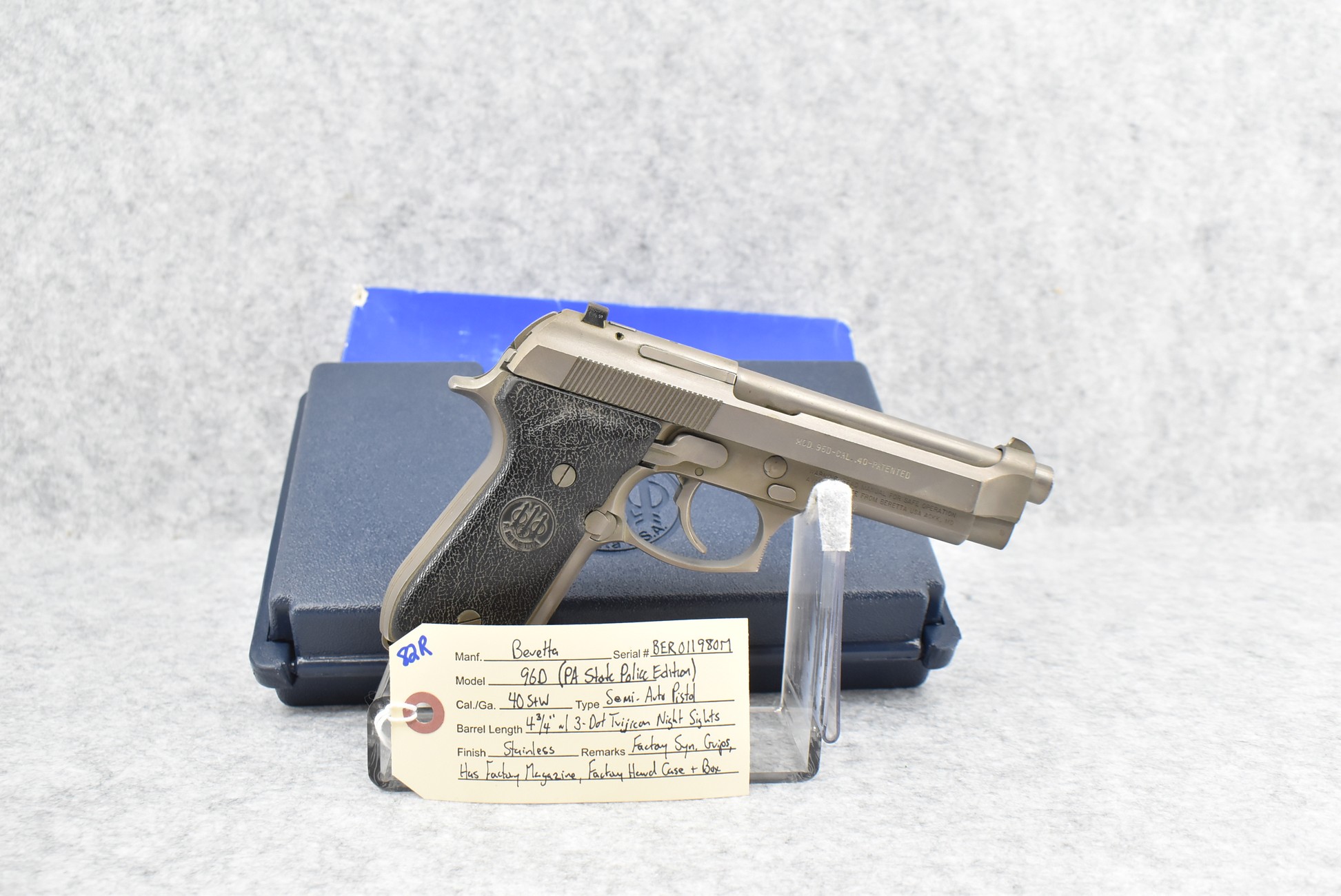 82R. Beretta – Mod. 96D (PA State Police Edition) – 40 S&W Cal. Semi-Auto Pistol – w/4¾” Barrel w/3-Dot Trijicon Night Sights – Stainless Finish – w/Factory Grips – w/Factory Magazine – w/Factory Hard Case and Box