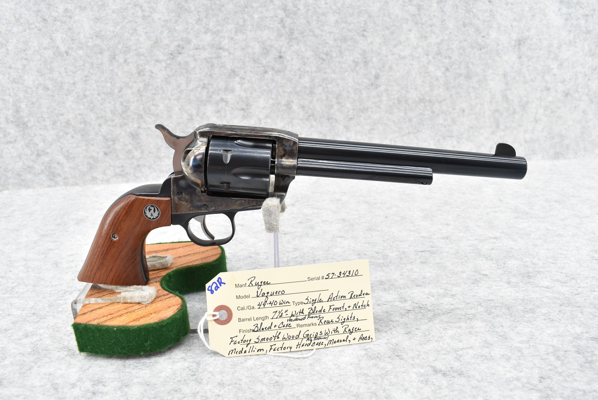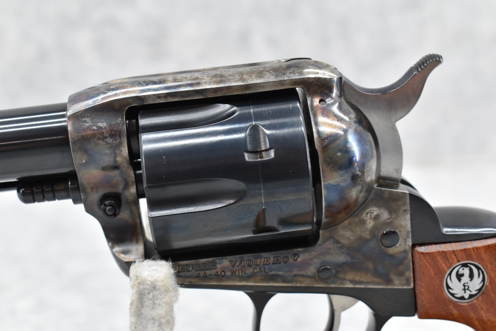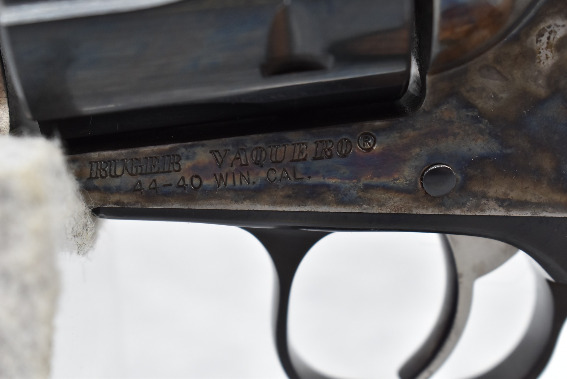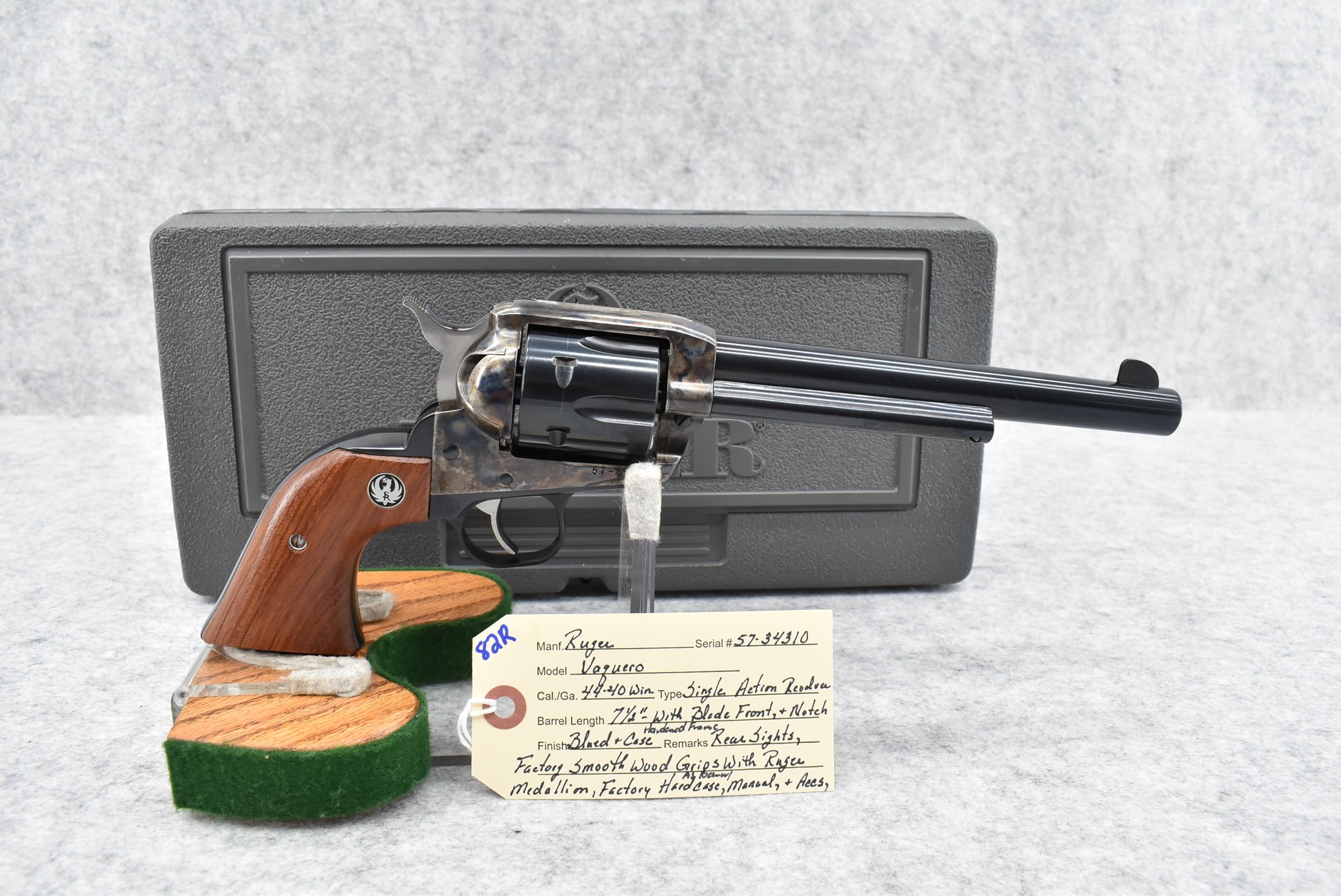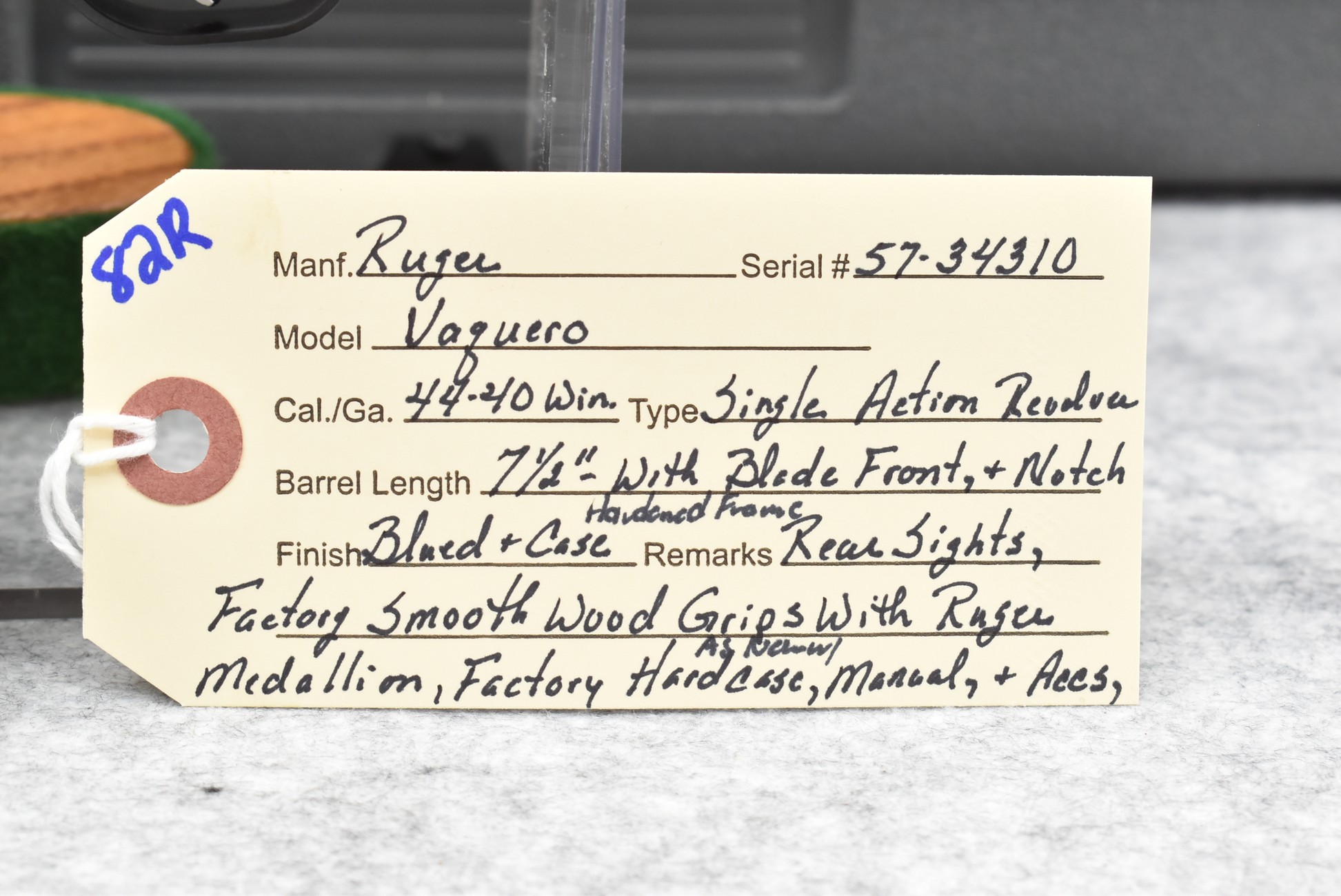 82R. Ruger – Mod. Vaquero – 44-40 Win. Cal. Single Action Revolver – w/7 ½” Barrel w/Blade Front & Notch Rear Sights – Blued Finish w/Case Hardened Frame – w/Factory Smooth Wood Grips w/Ruger Medallion – As New w/Factory Hard Case, Manual & Accessories