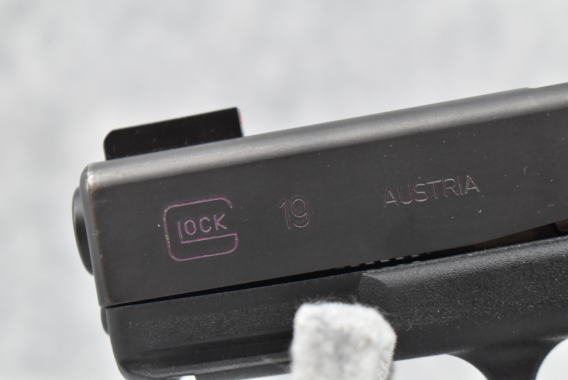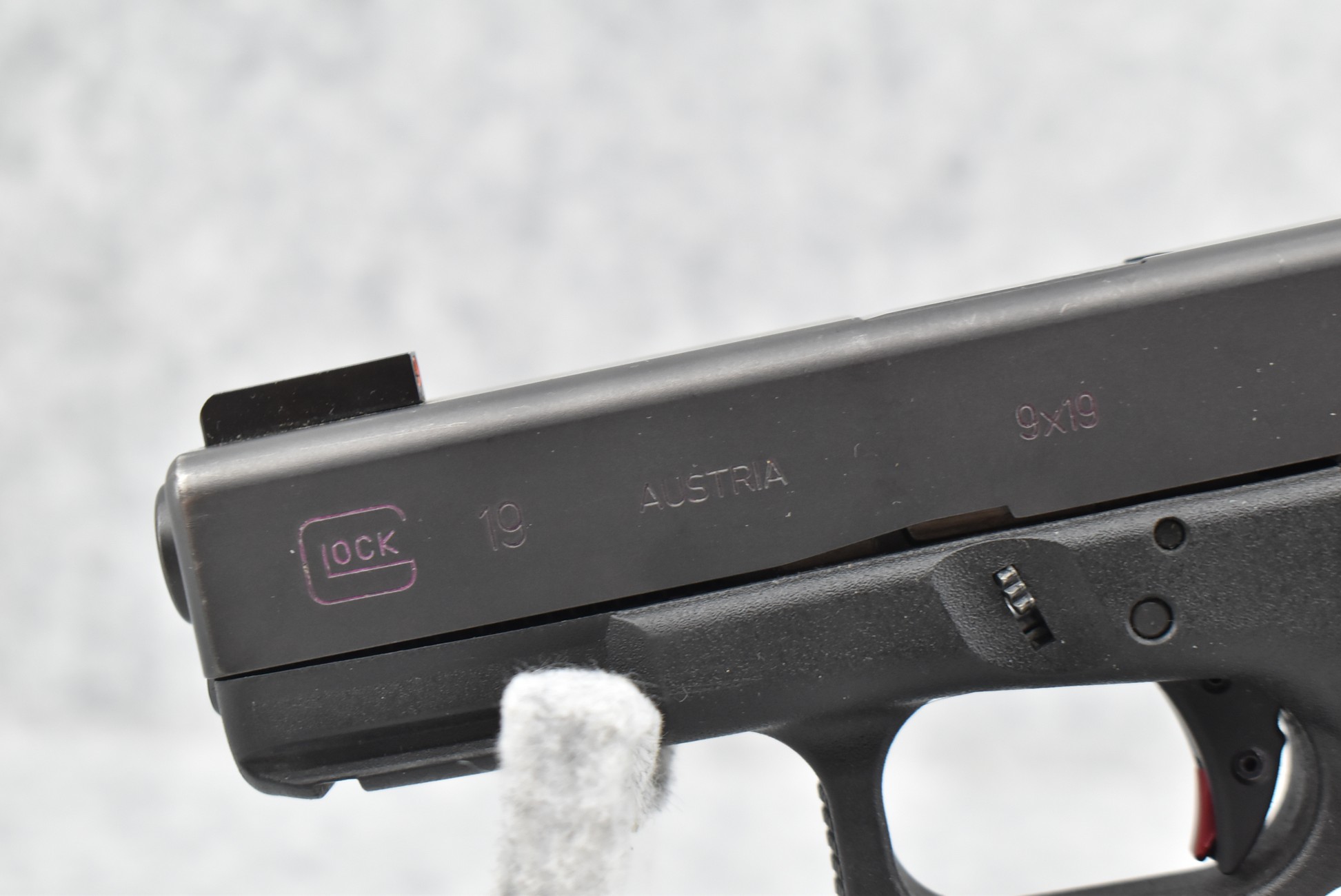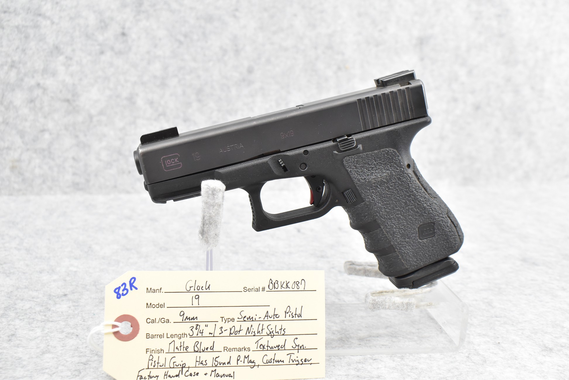 83R. Glock – Mod. 19 – 9mm Cal. Semi-Auto Pistol – w/3¾” Barrel w/3-Dot Night Sights – Matte Blued Finish – w/Textured Synthetic Pistol Grip – w/15-Round P-Mag. – w/Custom Trigger – w/Factory Hard Case and Manual