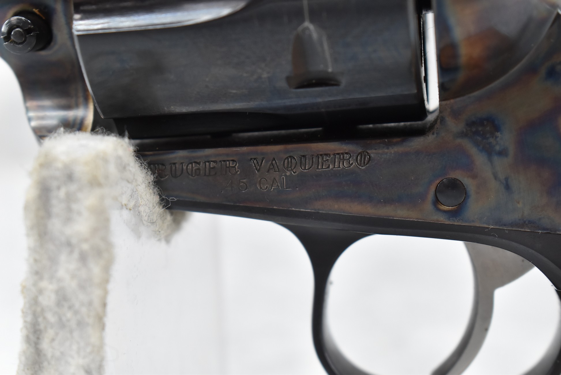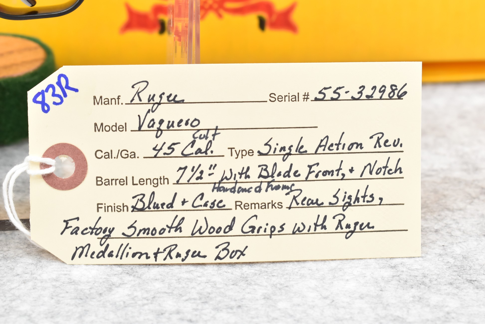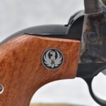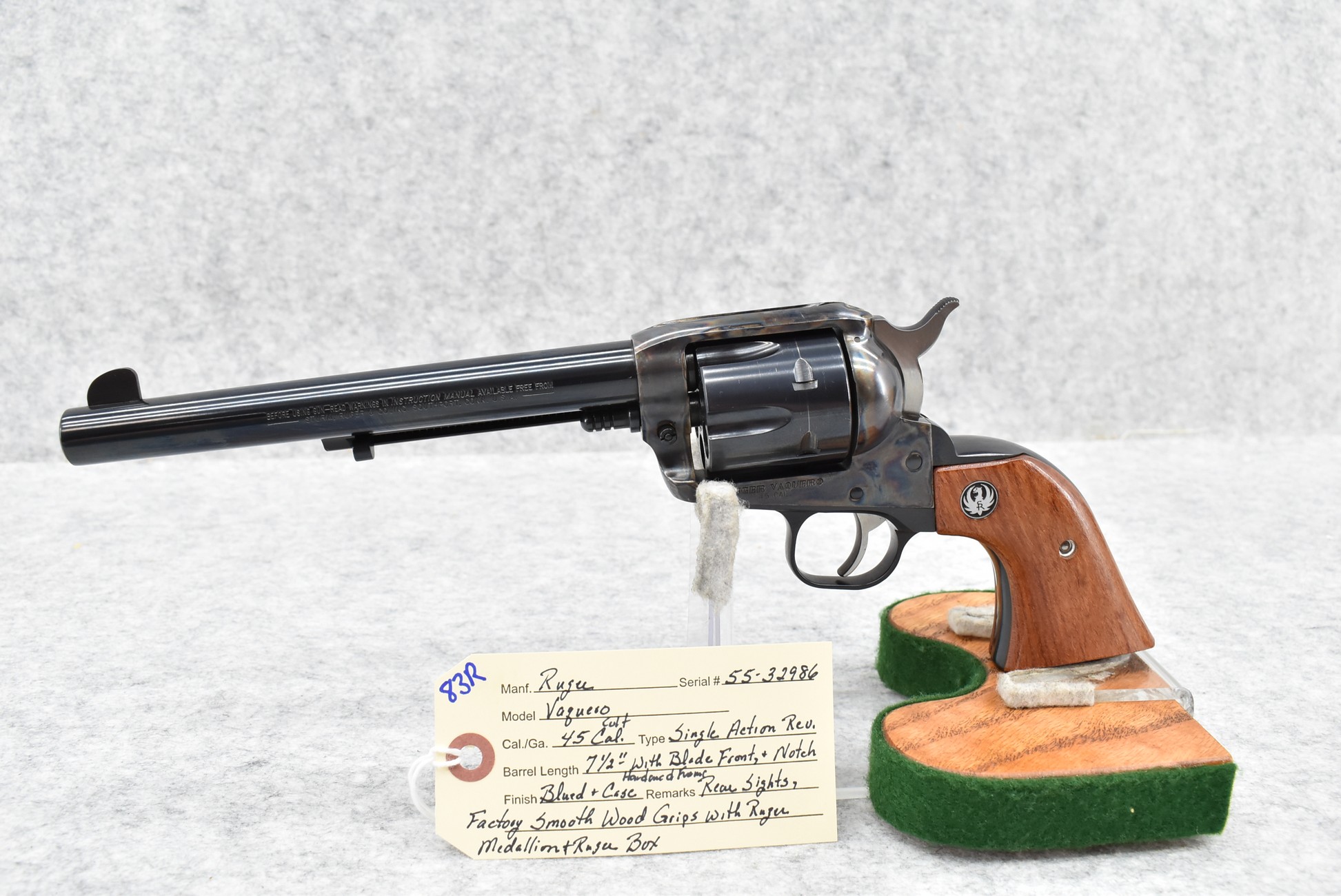 83R. Ruger – Mod. Vaquero – 45 Colt Cal. Single Action Revolver – w/7 ½” Barrel w/Blade Front & Notch Rear Sights – Blued Finish w/Case Hardened Frame – w/Factory Smooth Wood Grips w/Ruger Medallion – w/Ruger Box