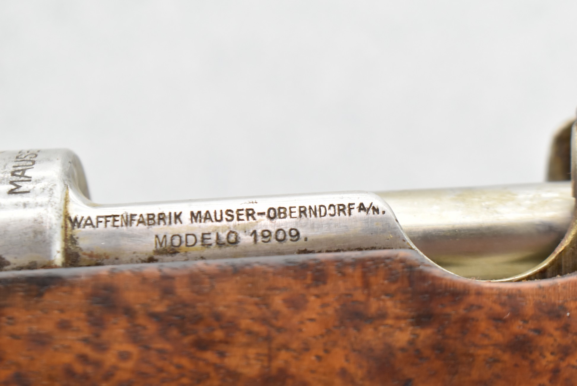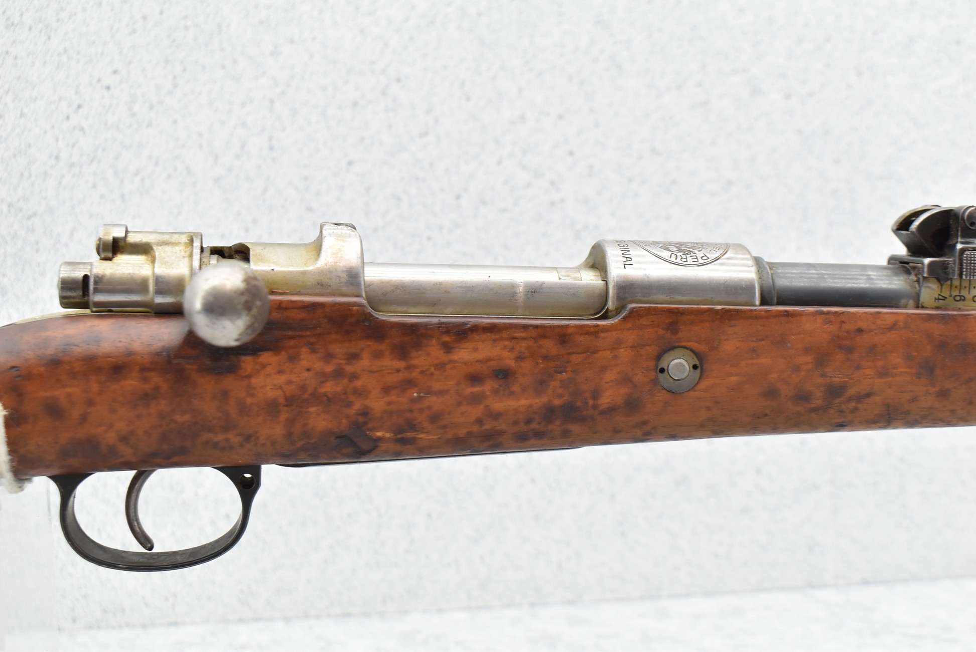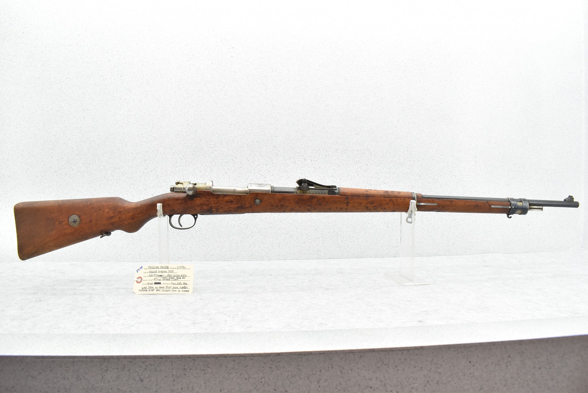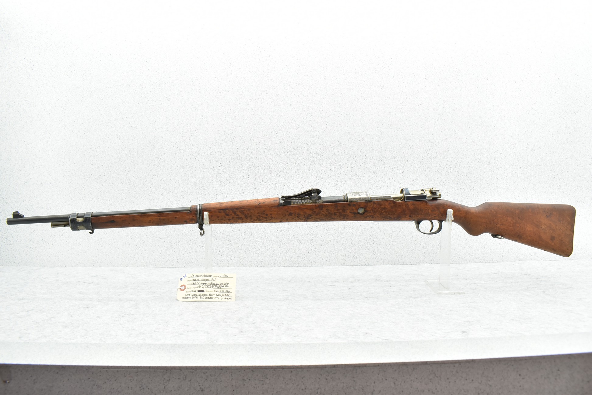 847R. Peruvian Mauser – Mod. Mauser Original 1909 – 7.65×53 Argentine Cal. Bolt Action Rifle – w/29.5” Barrel w/Front Blade & Rear Adj. Ladder Sights – Blued Finish – w/Full Pistol Grip Wood Stock w/Metal Butt Plate – w/Excellent Crest on Receiver – Numbers Matching Except Bolt