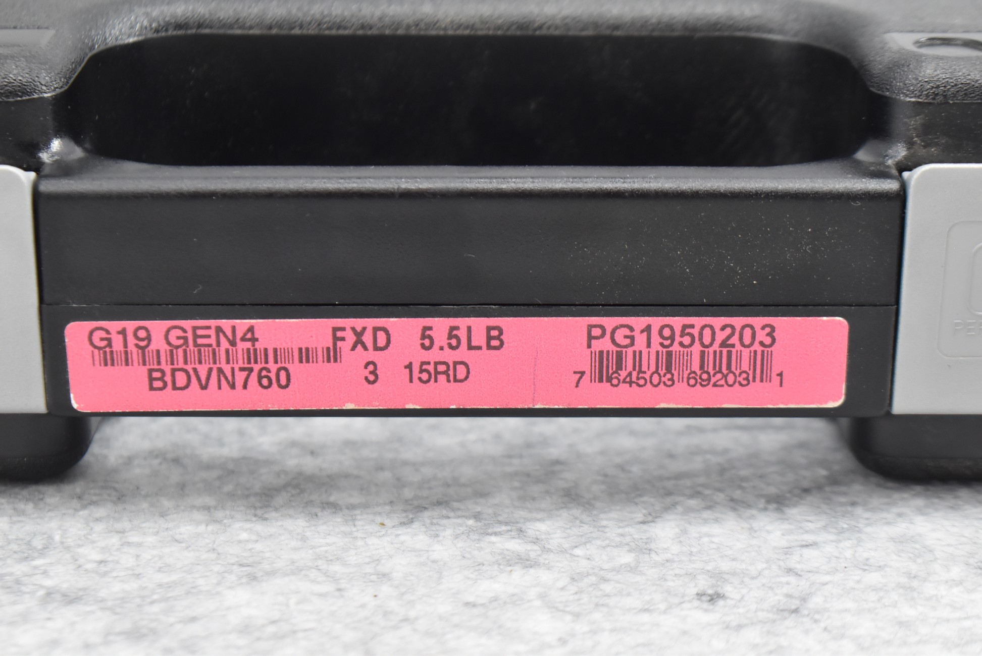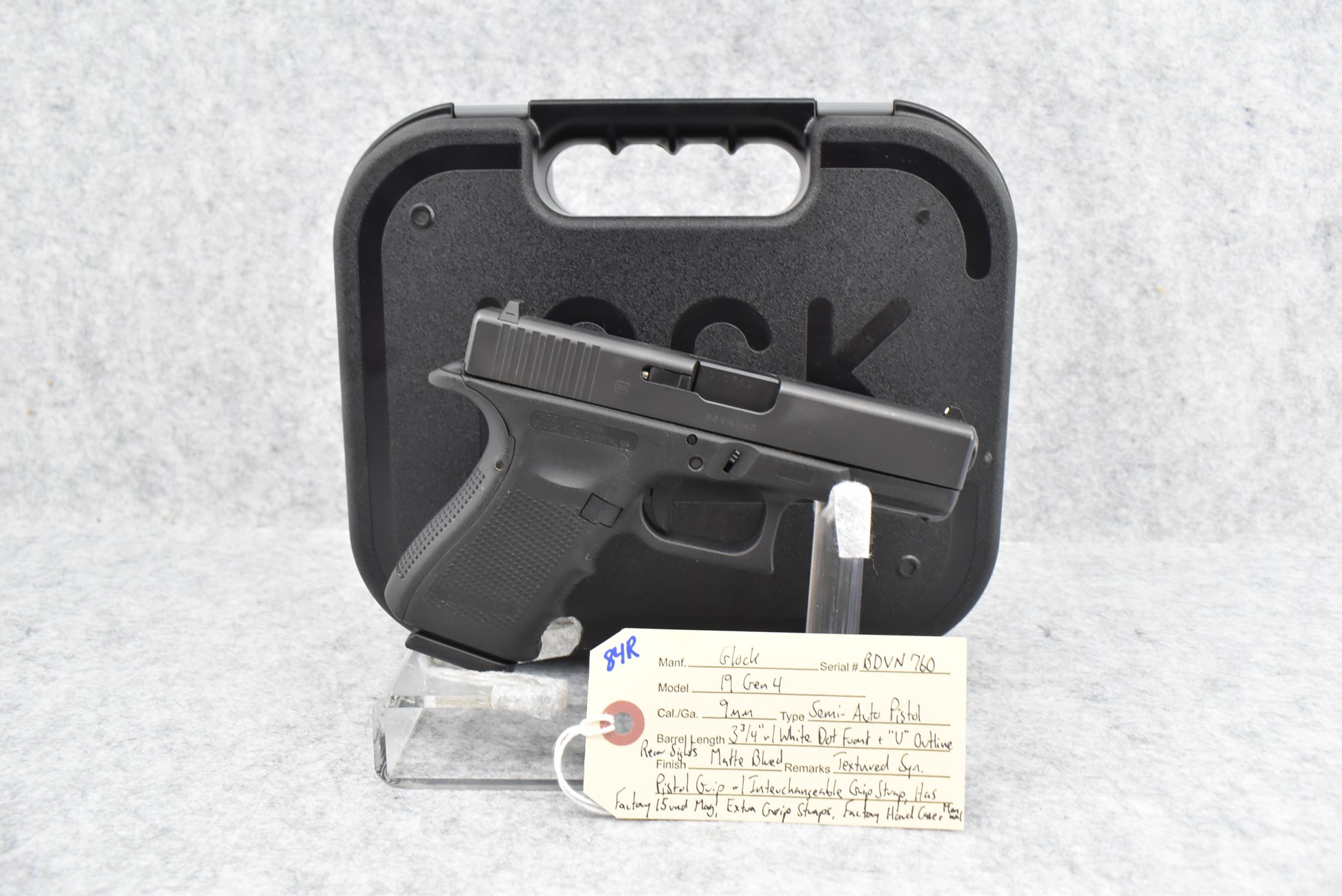 84R. Glock – Mod. 19 Gen 4 – 9mm Cal. Semi-Auto Pistol – w/3¾” Barrel w/White Dot Front and “U” Outline Rear Sights – Matte Blued Finish – w/Textured Synthetic Pistol Grip – w/Factory 15-Round Magazine – w/Extra Grip Straps – w/Factory Hard Case and Manual