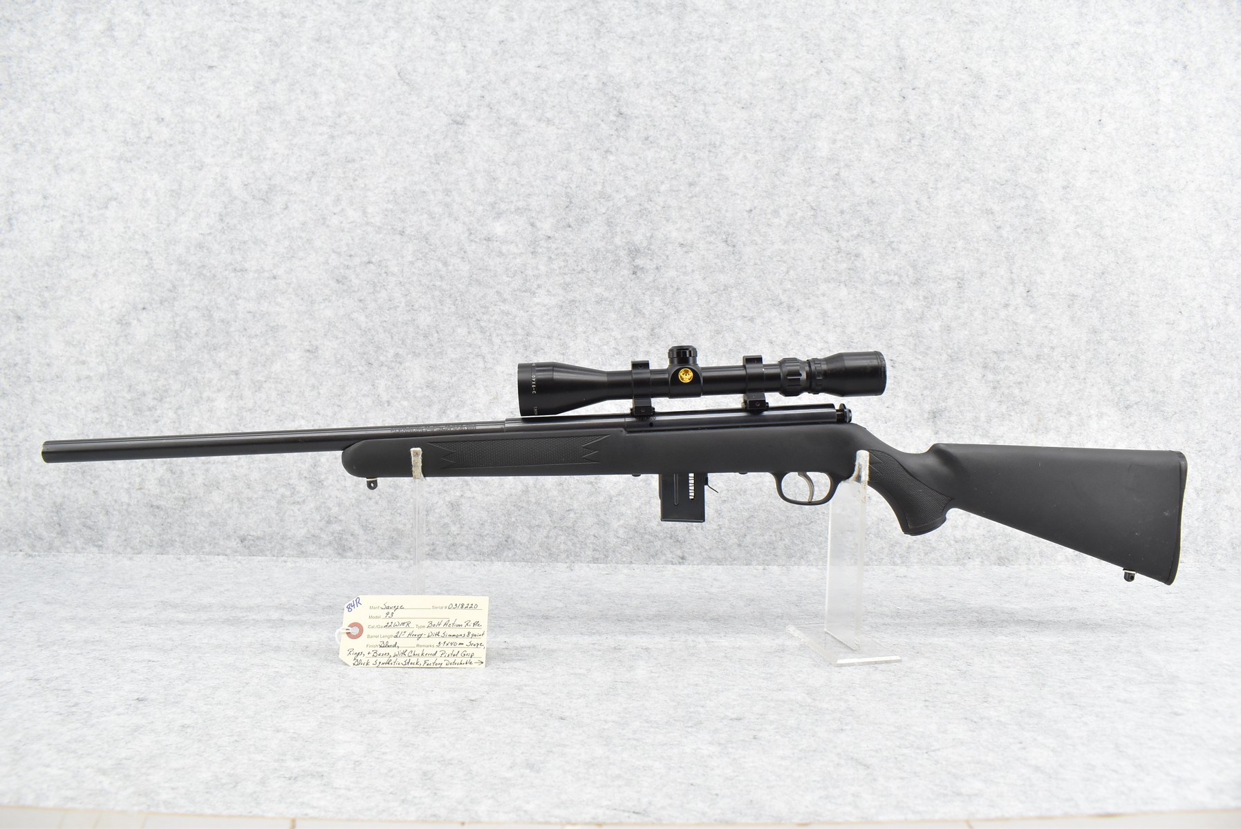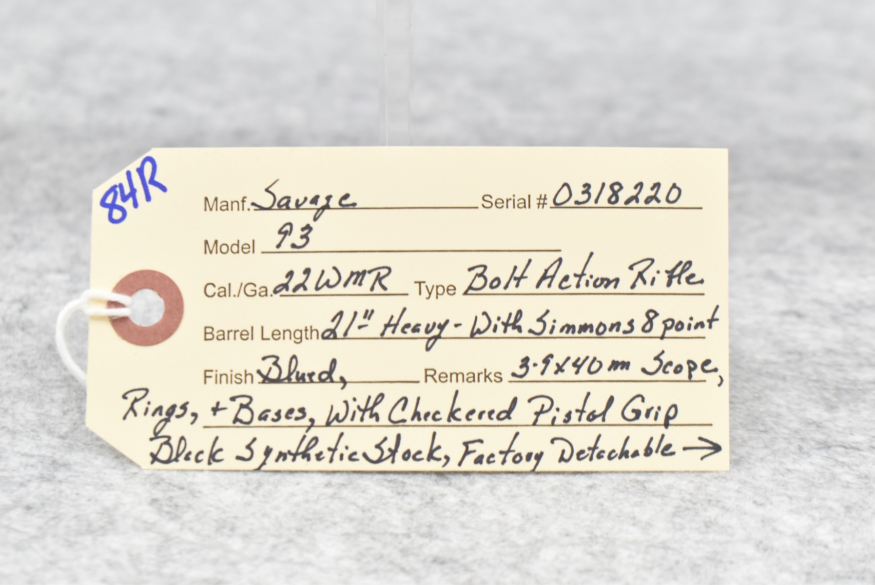 84R.       Savage – Mod. 93 – 22 WMR Cal. Bolt Action Rifle – w/21” Heavy Barrel – Blued Finish – w/Checkered Pistol Grip Black Synthetic Stock w/Factory Butt Plate – w/Factory Detachable Magazine– w/Simmons 8 Point 3-9x40mm Scope – w/Mounts
