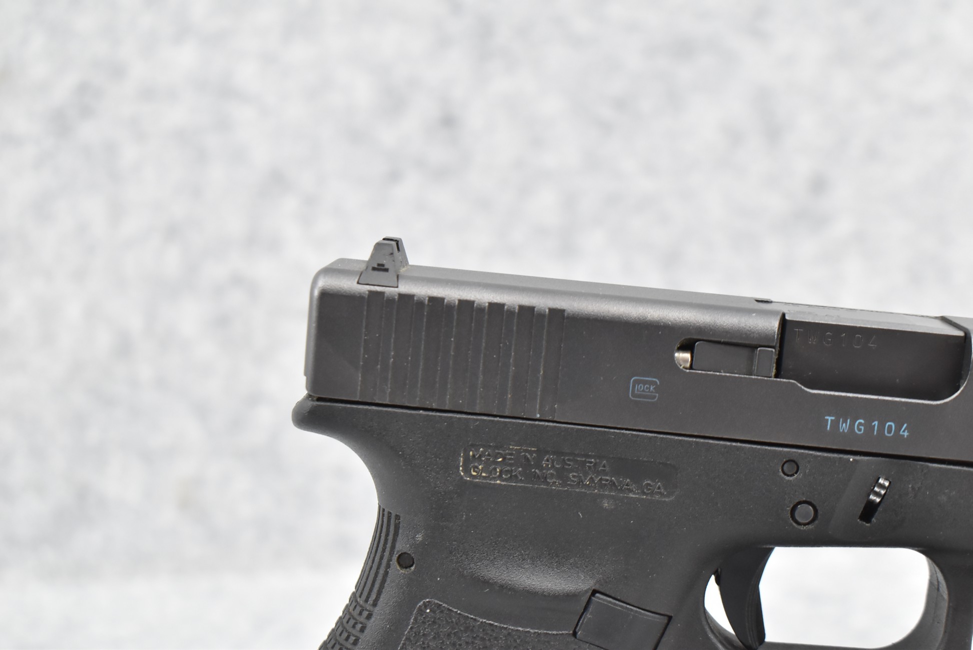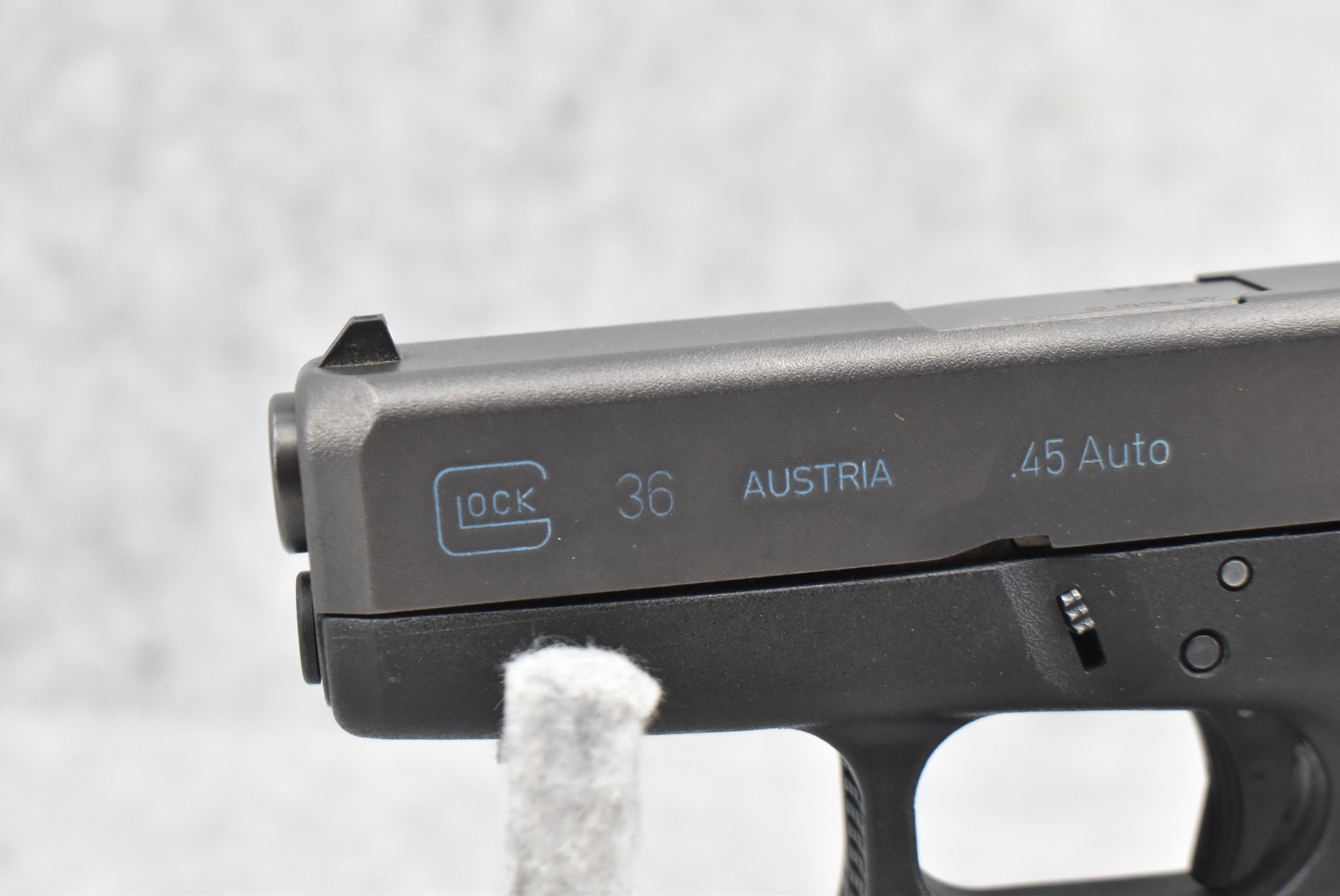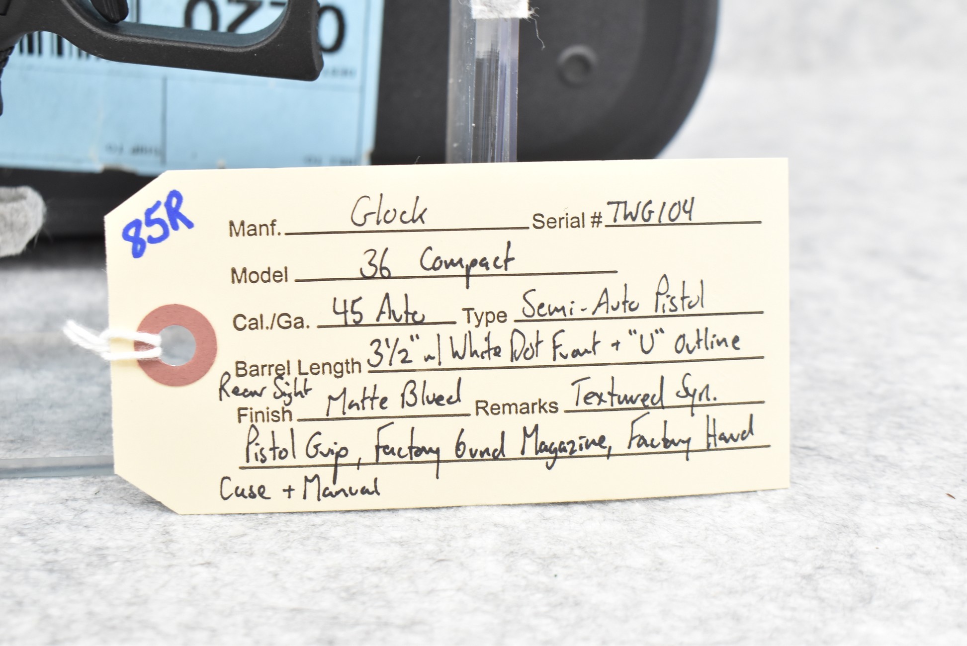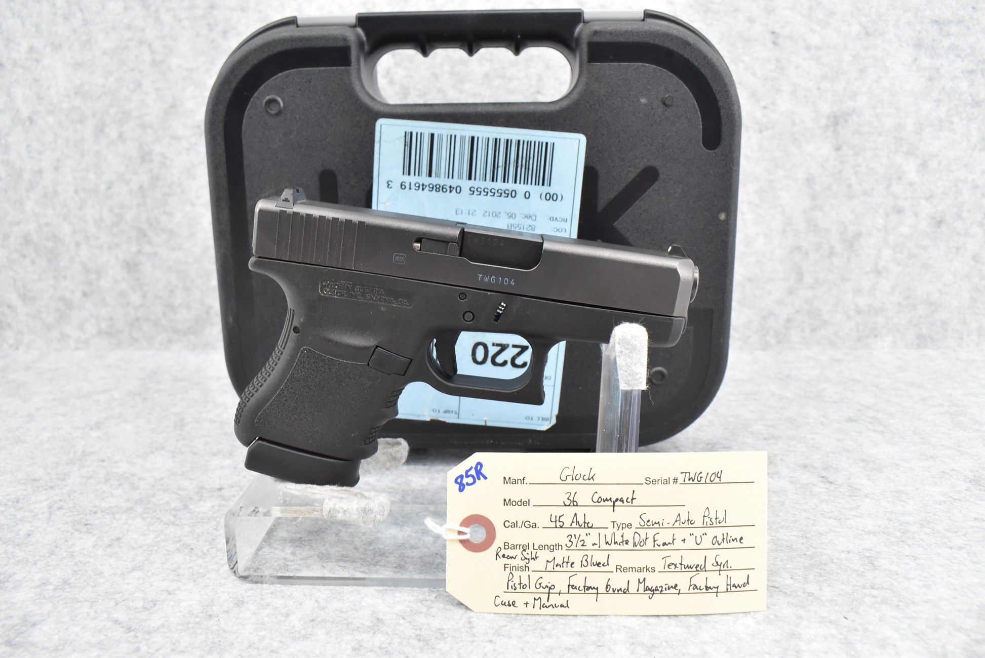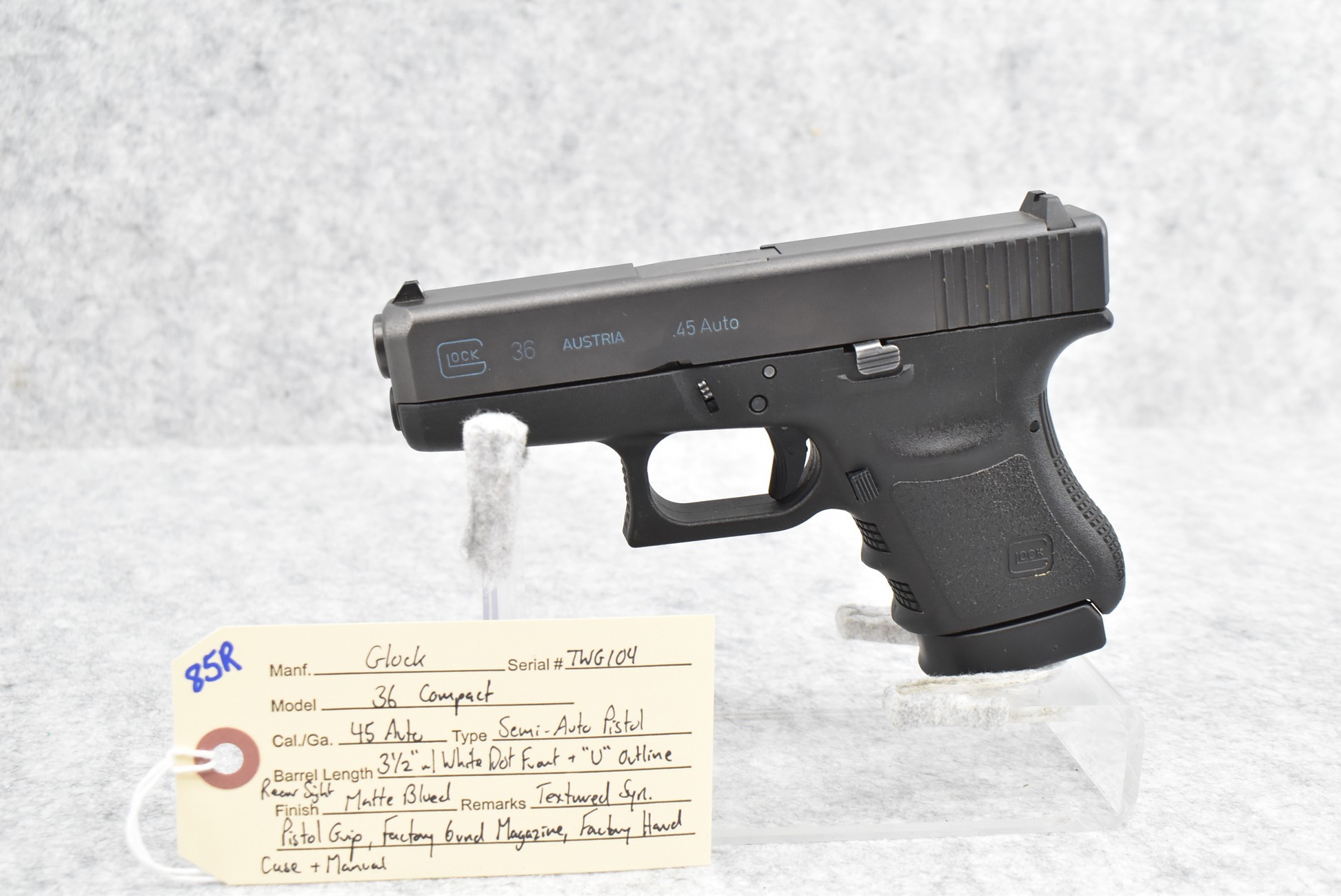 85R. Glock – Mod. 36 Compact – 45 Auto Cal. Semi-Auto Pistol – w/3½” Barrel w/White Dot Front and “U” Outlined Rear Sights – Matte Blued Finish – w/Textured Synthetic Pistol Grip – w/Factory 6-Round Magazine – w/Factory Hard Case and Manual